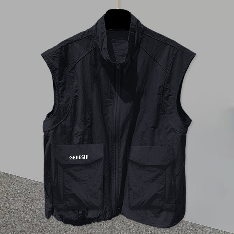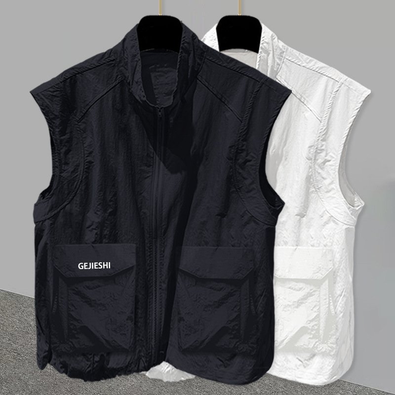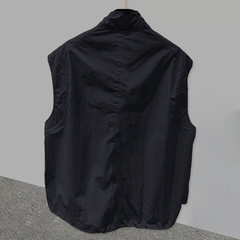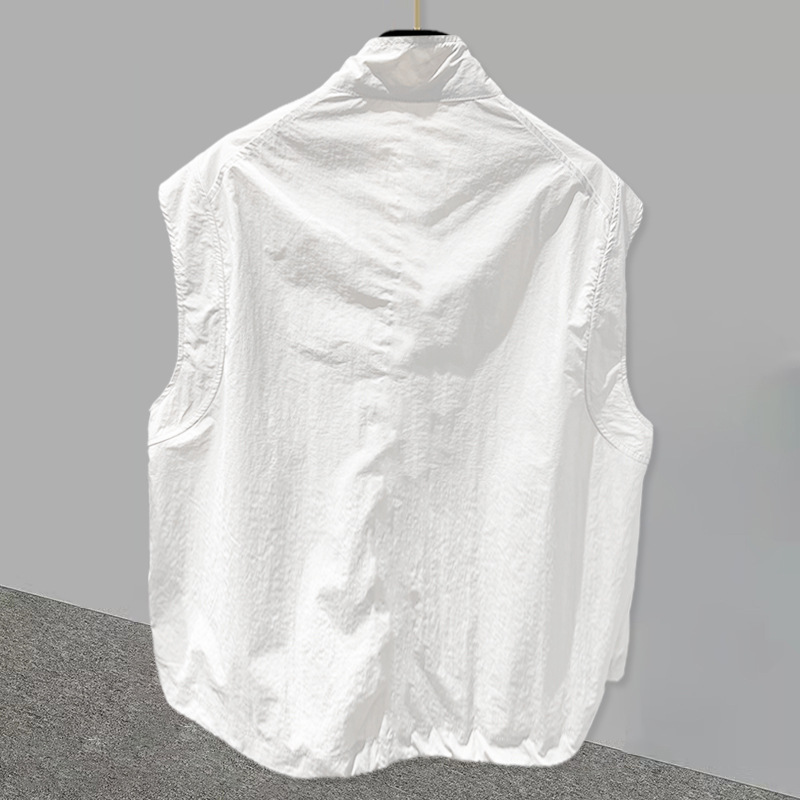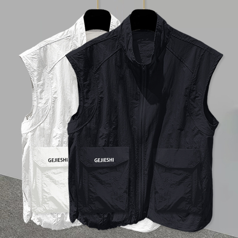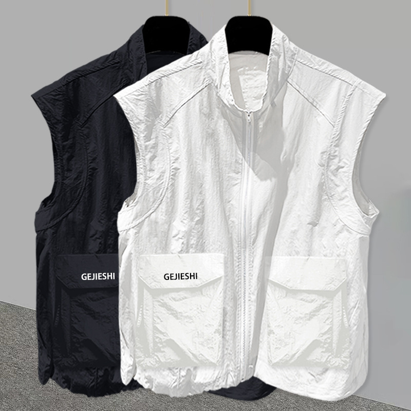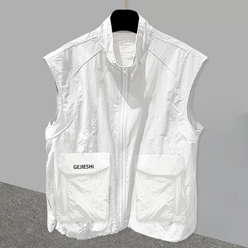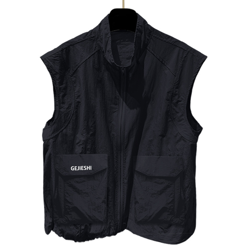반 높이 칼라 지퍼 민소매 티셔츠 남자의 여름 유행 브랜드 잘 생긴 도구 스테레오 포켓 자수 학생 허리 코트 조끼