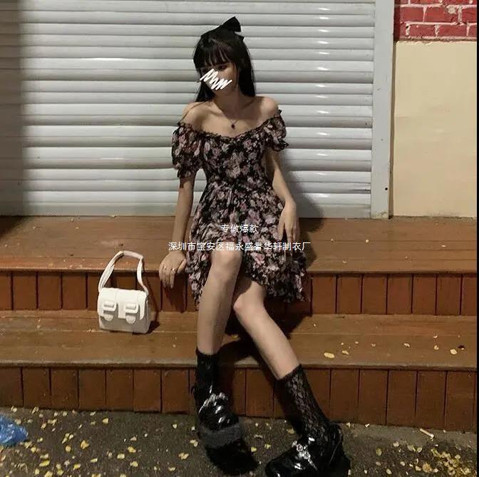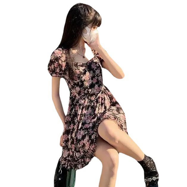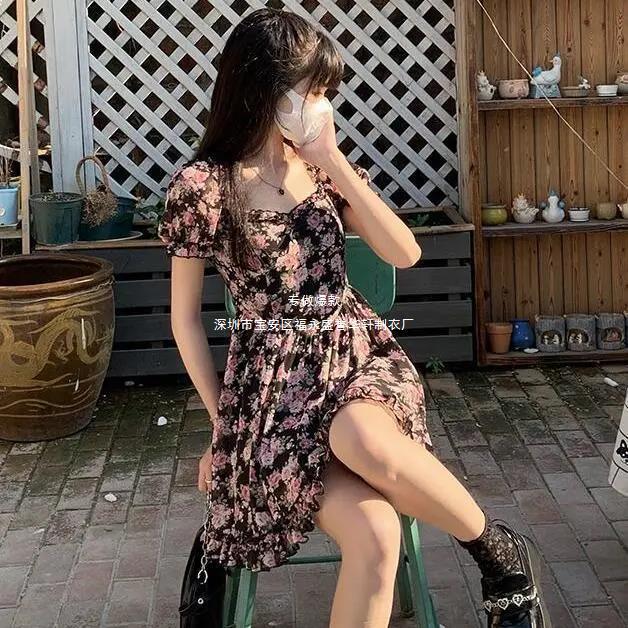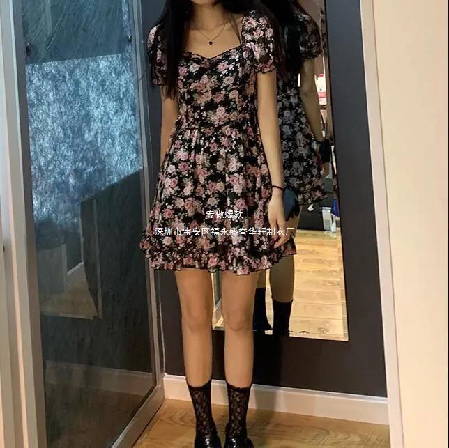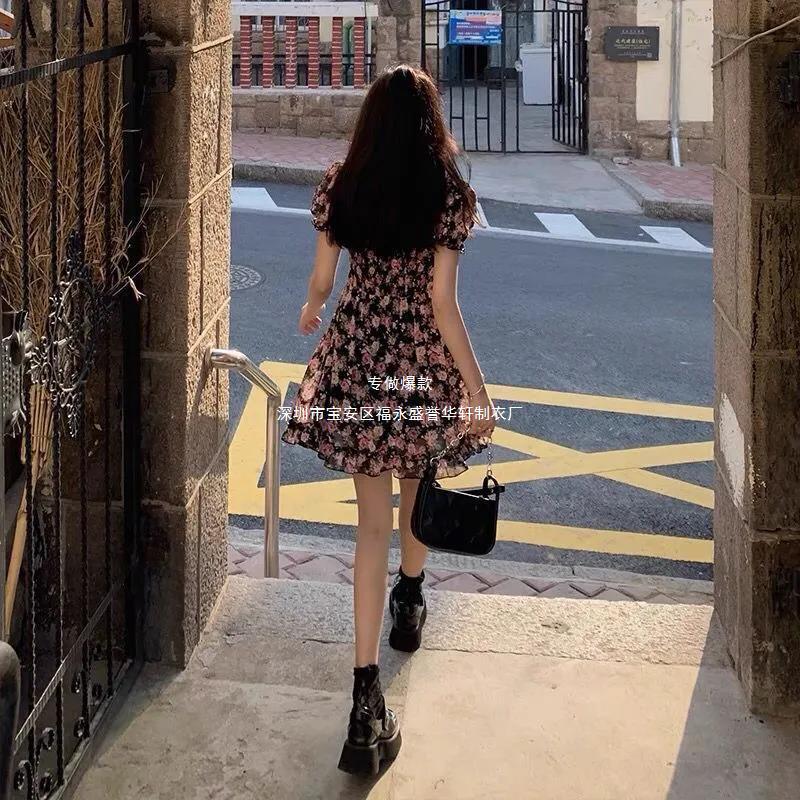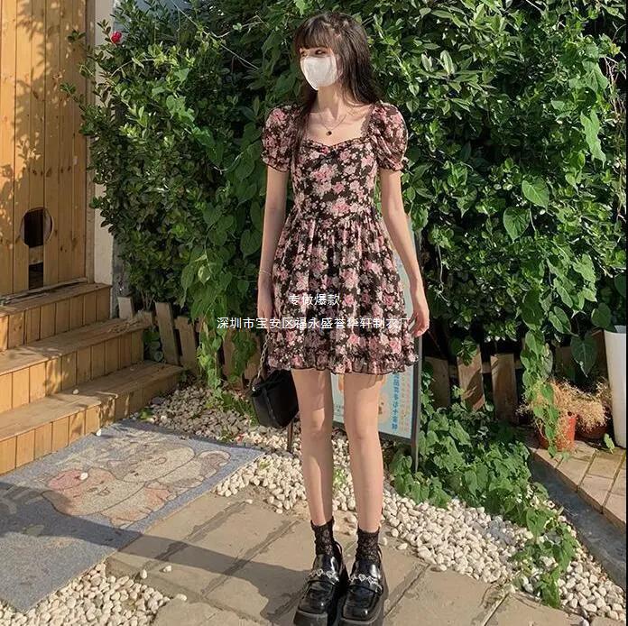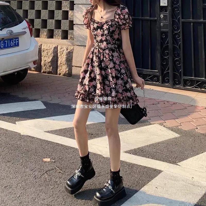 새로운 프랑스 꽃 원피스 여름 여성 스퀘어 칼라 버블 슬리브 첫사랑 스커트 주름 A 라인 스커트 도매