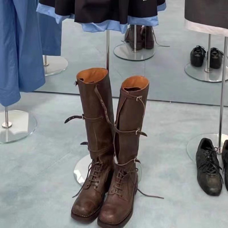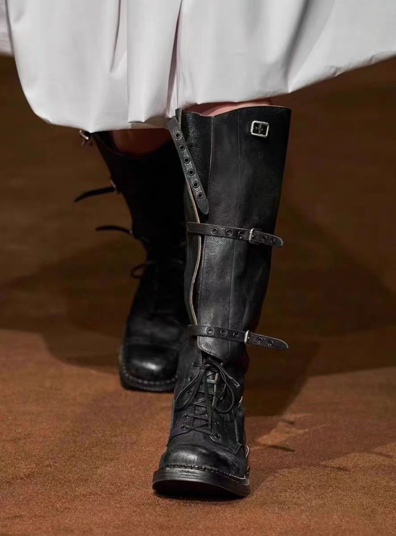 Cowhide Edition ~ 2024 새로운 하이 나이츠 부츠 여성용 두꺼운 힐 버클이지만 무릎 서부 카우보이 부츠 긴 의상