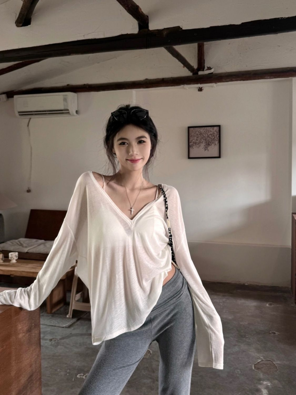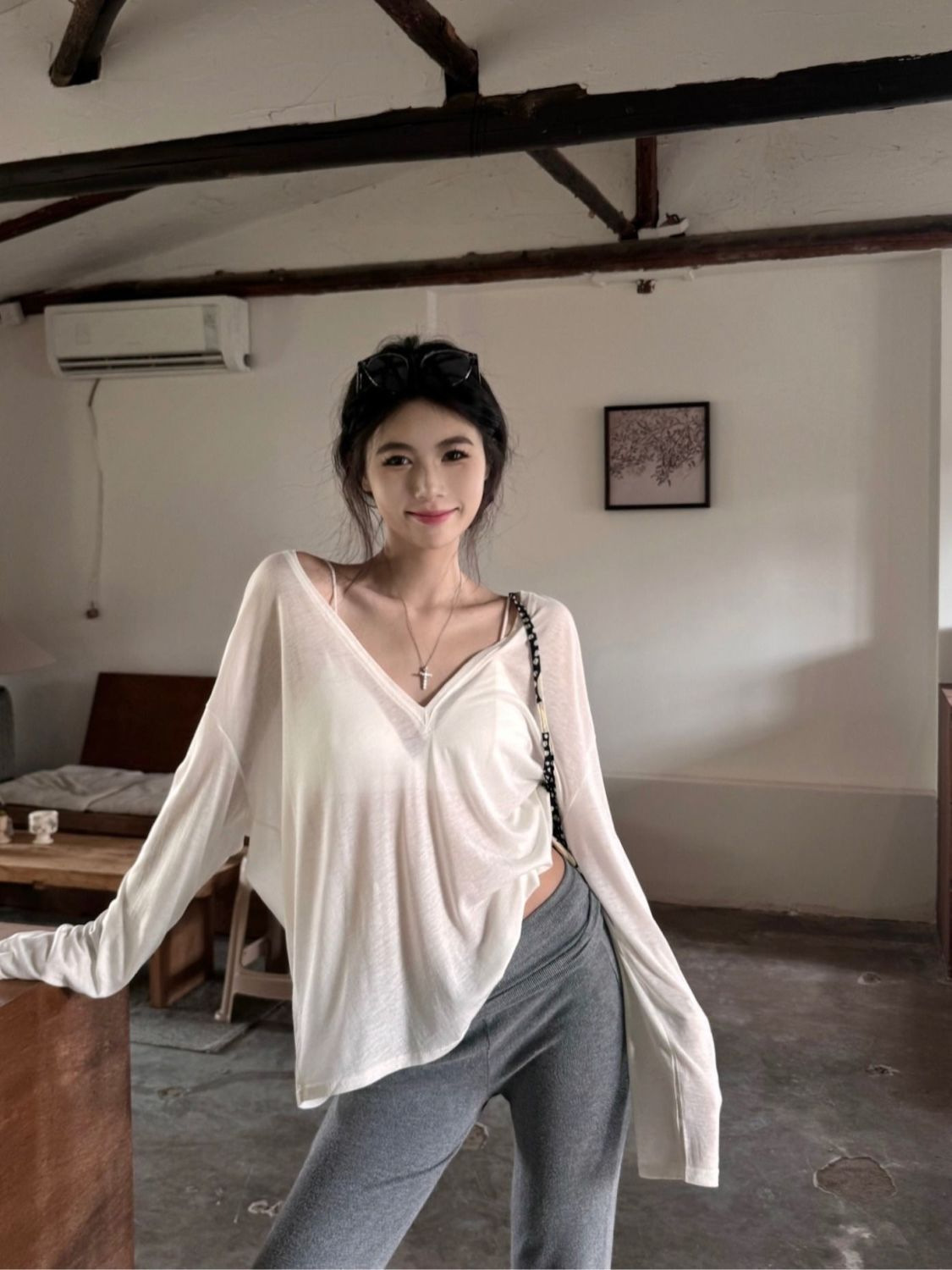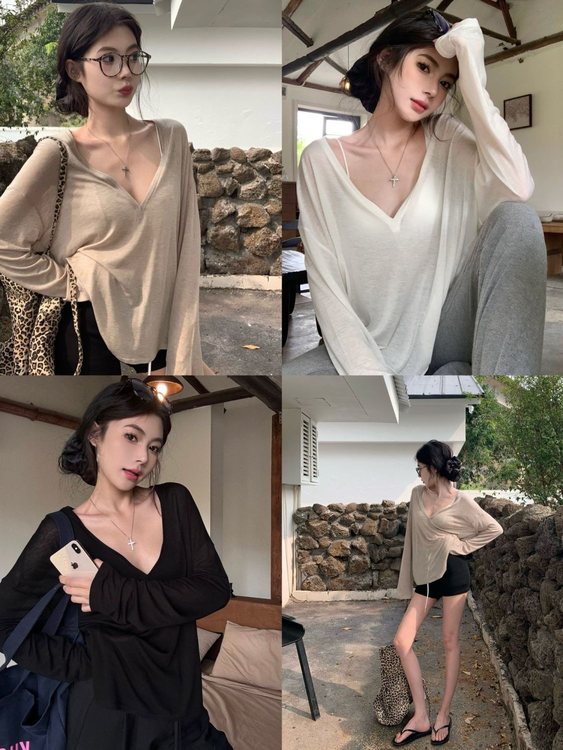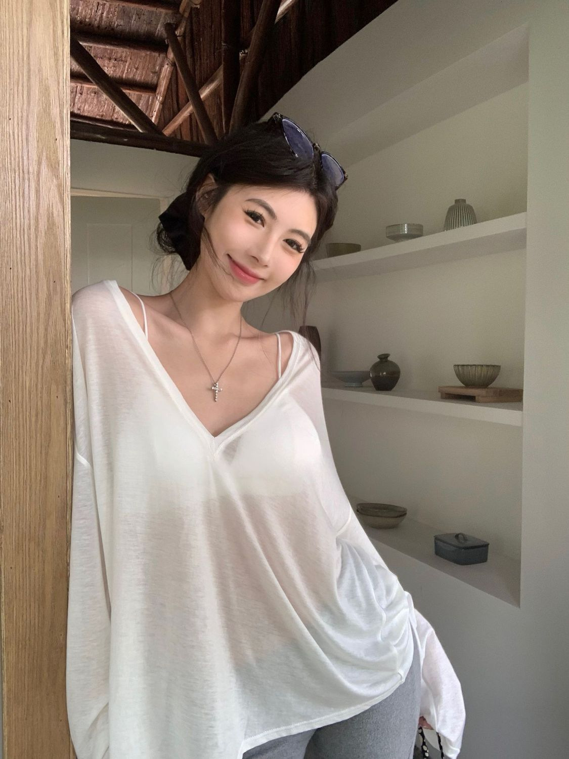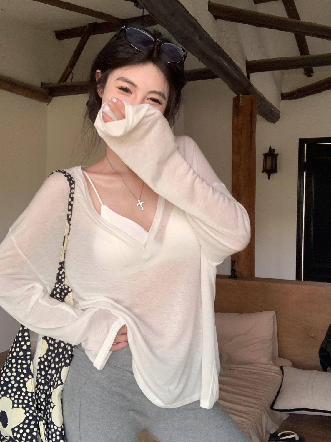 흰색 얇은 마이크로 투명 V 넥 긴팔 티셔츠 여성용 여름 느슨한 태양 보호 블라우스 캐주얼 게으른 스타일 오버볼