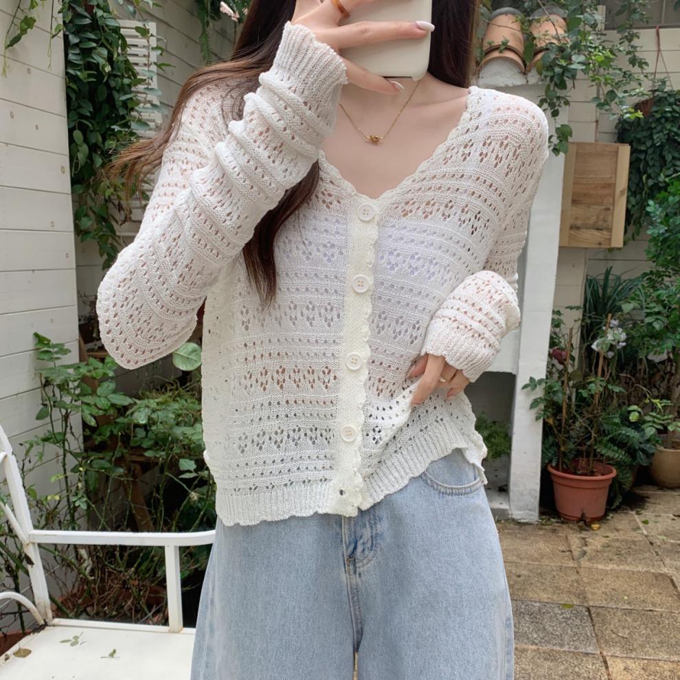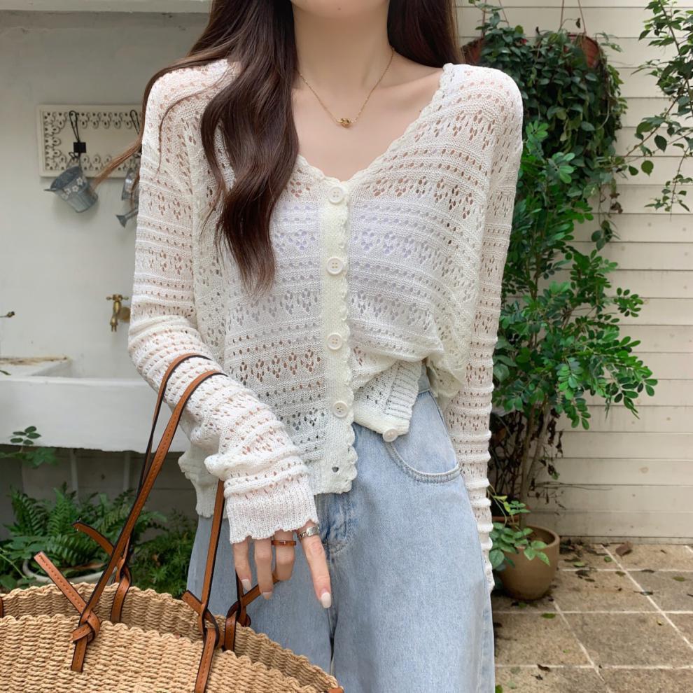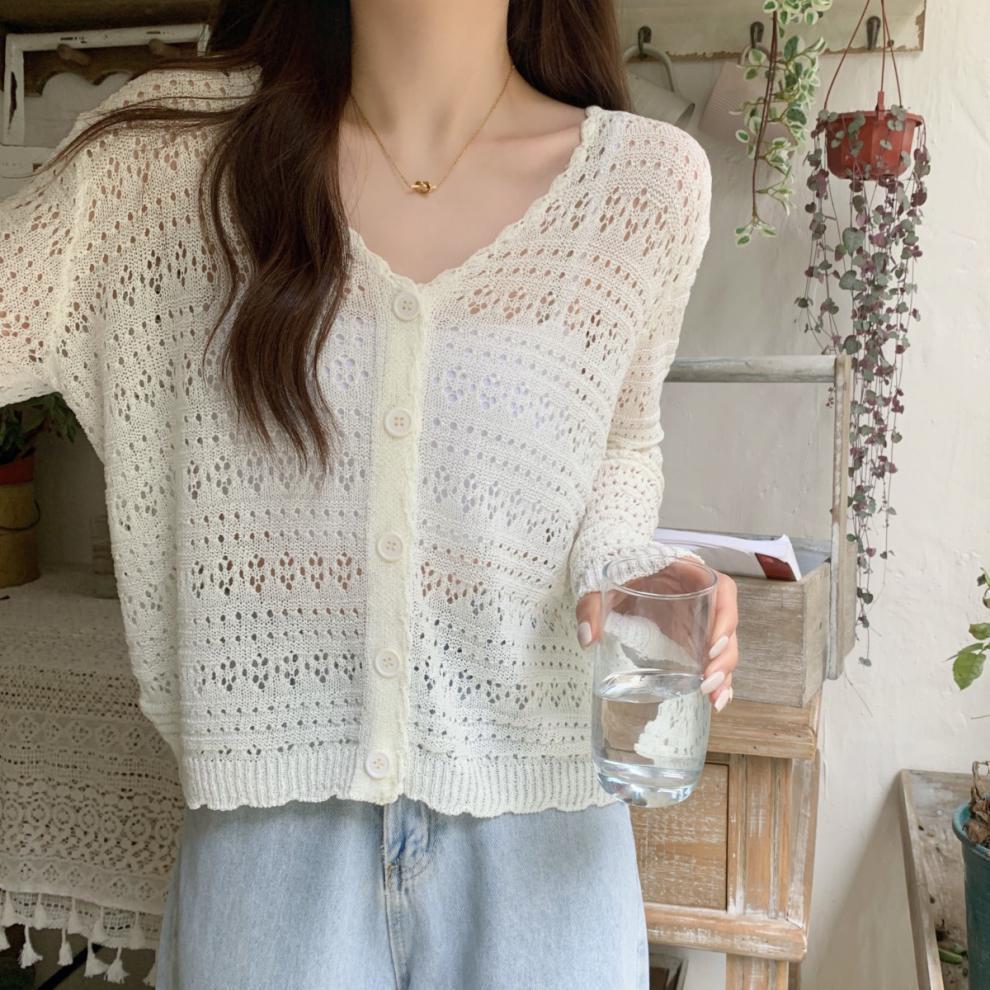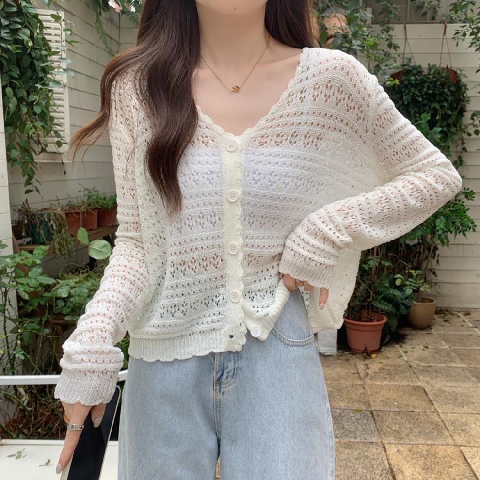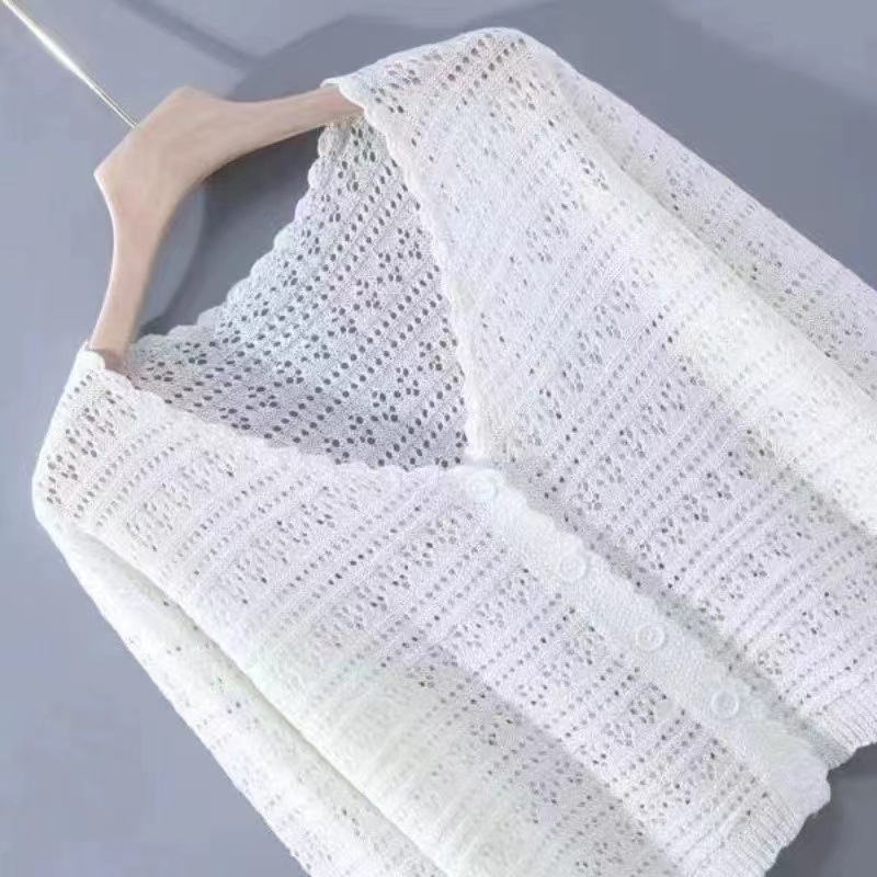 2025 중공 니트웨어 얇은 블라우스 여성의 여름 선 스크린 목도리 V-넥 긴 소매 카디건 코트 여성