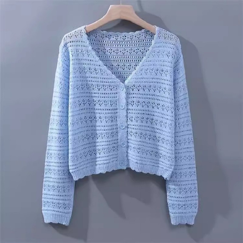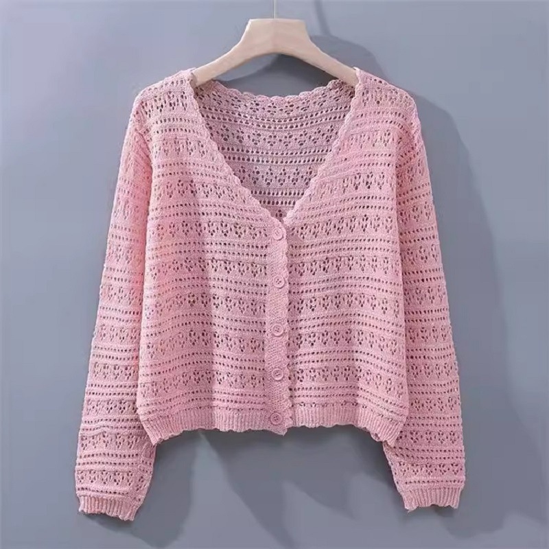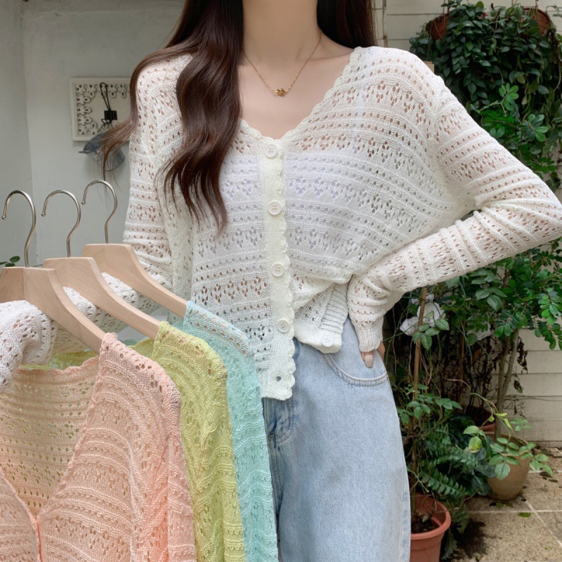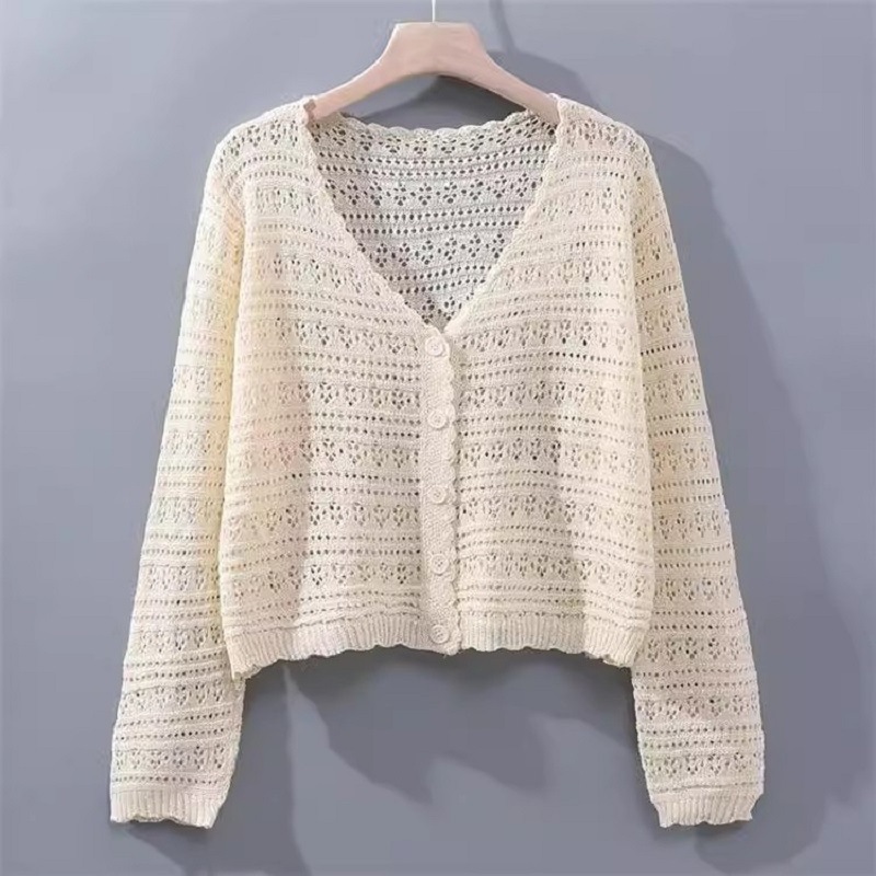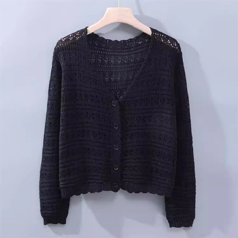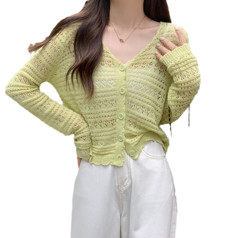 2025 중공 니트웨어 얇은 블라우스 여성의 여름 선 스크린 목도리 V-넥 긴 소매 카디건 코트 여성