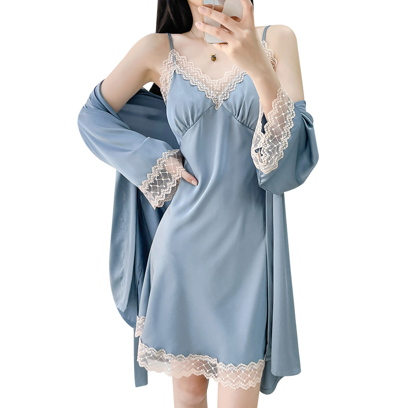 섹시한 잠옷 여자 여름 가슴 패드 아이스 실크 순수한 욕망 슬링 나이트 가운 세트 얇은 2024 새로운 스타일