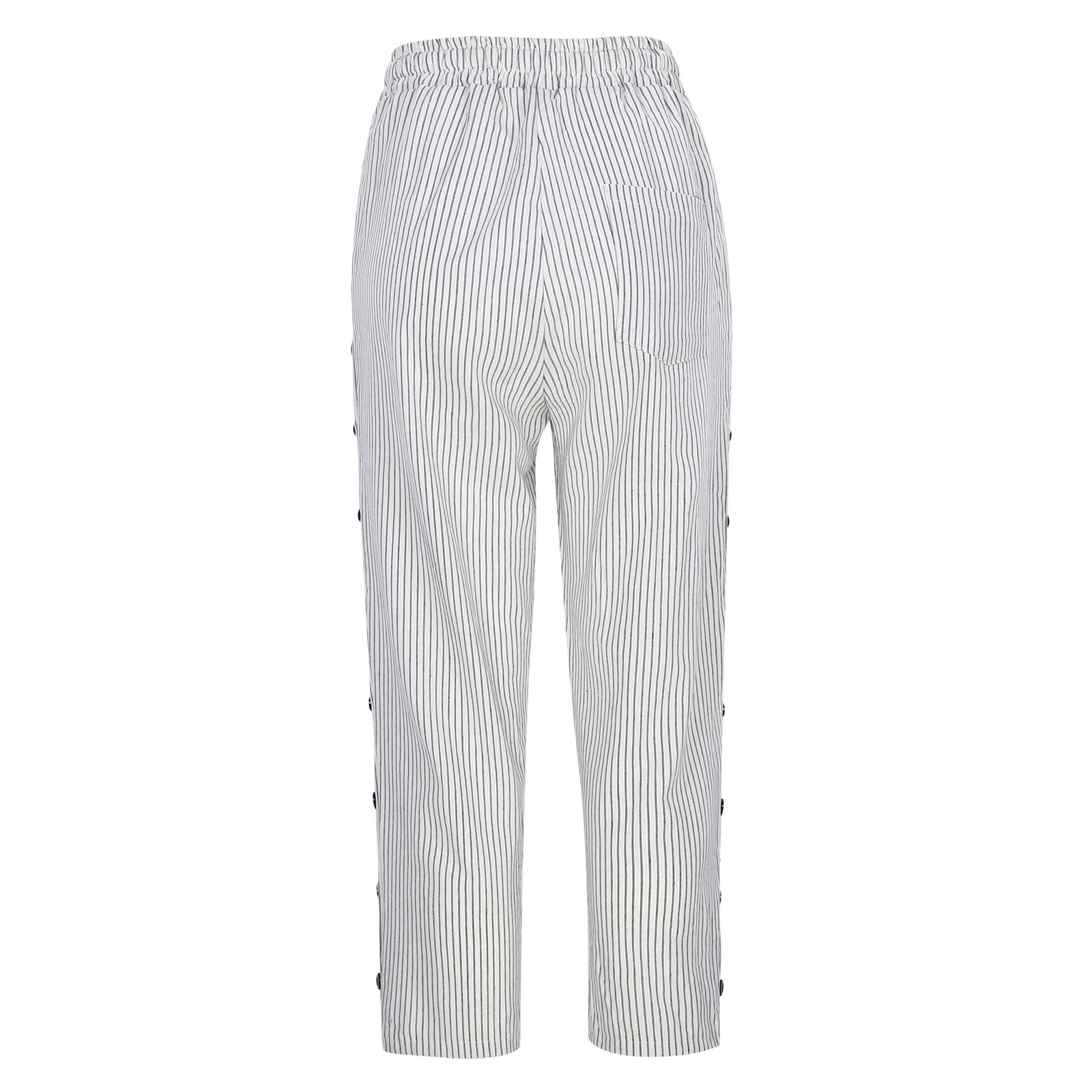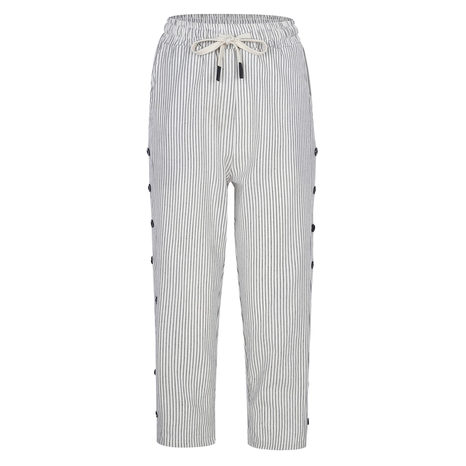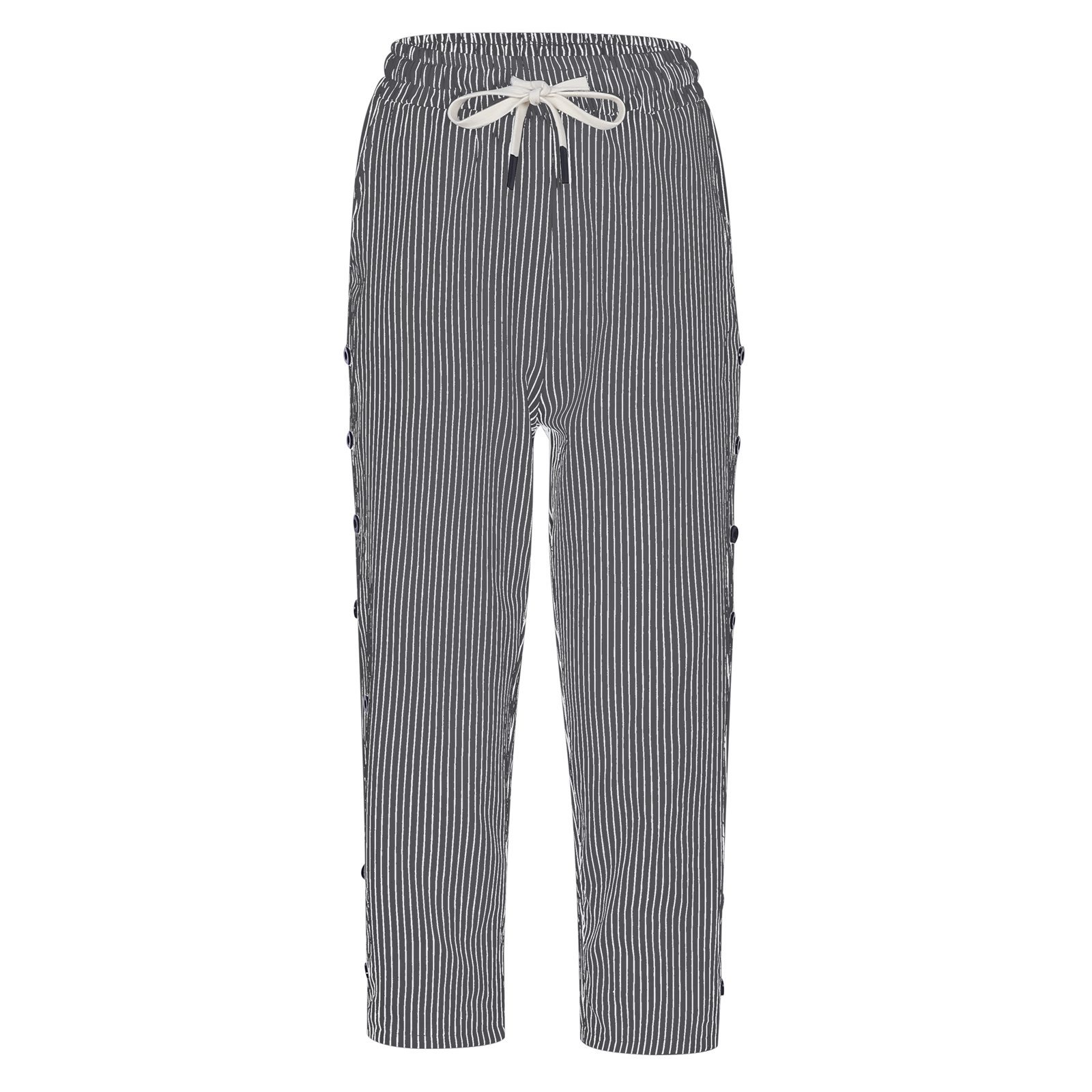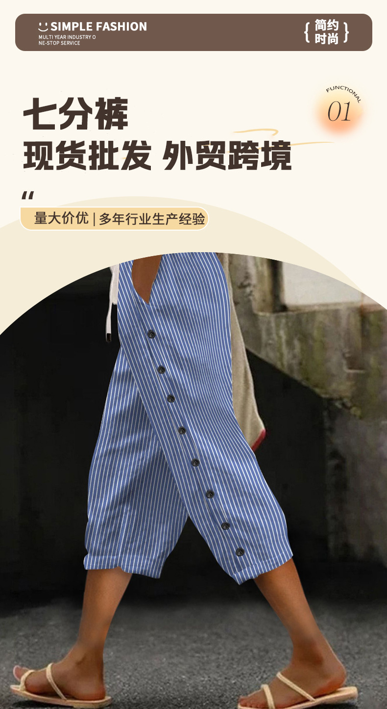 2024 유럽과 미국의 캐주얼 바지 여성 스트라이프 사이드 버튼 패션 느슨한 탄성 허리 스트레이트 편안한 크롭 바지