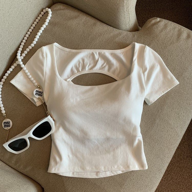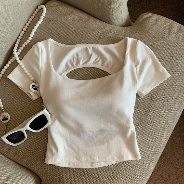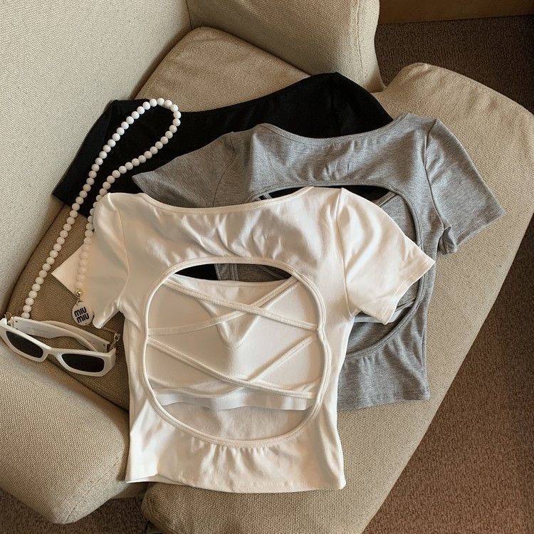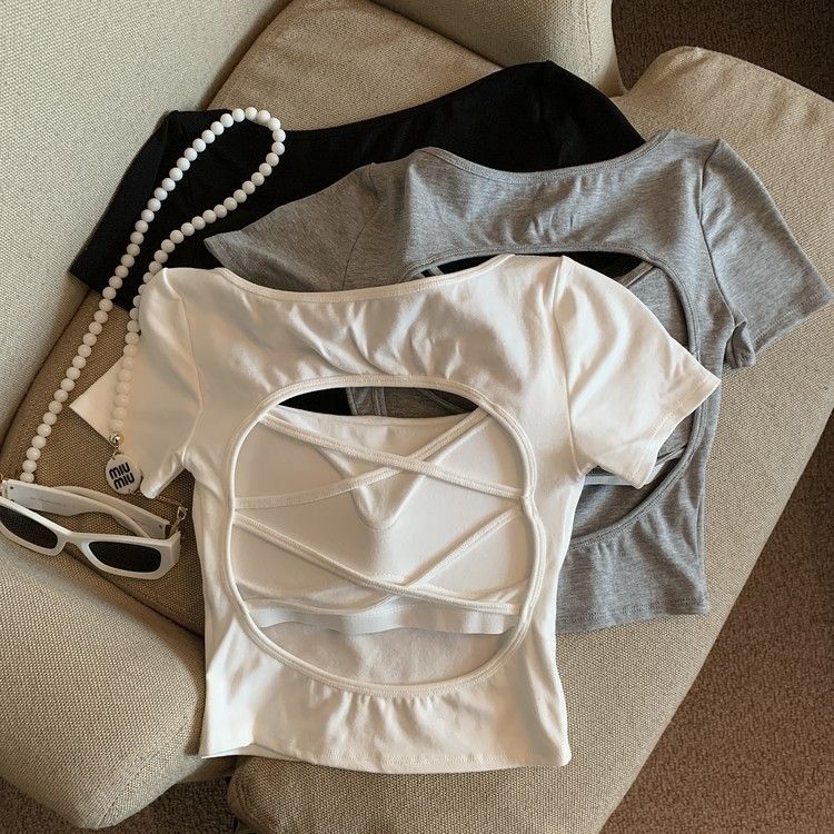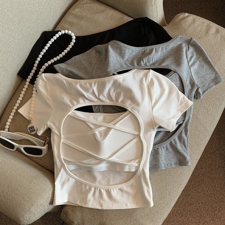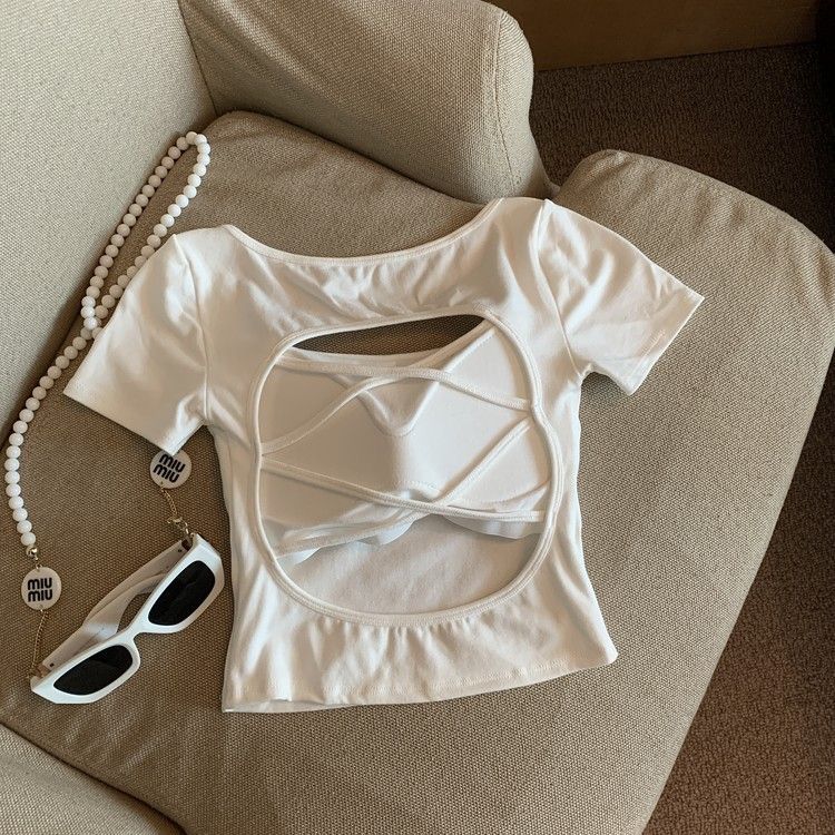아메리칸 스타일 할로우 크로스 백리스 반팔 티셔츠 여성용 여름 스파이스 걸 스퀘어 칼라, 가슴 패드베이스 셔츠 쇼트 탑