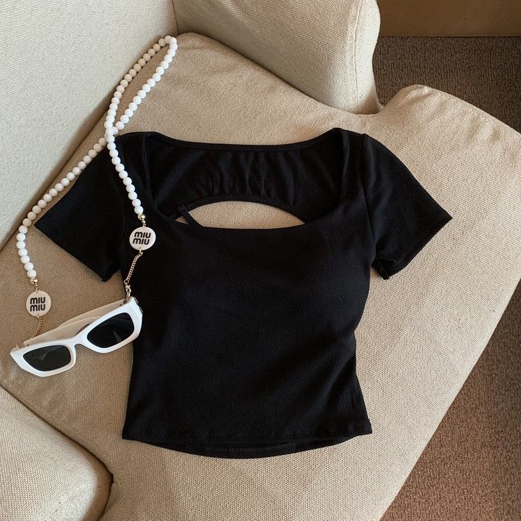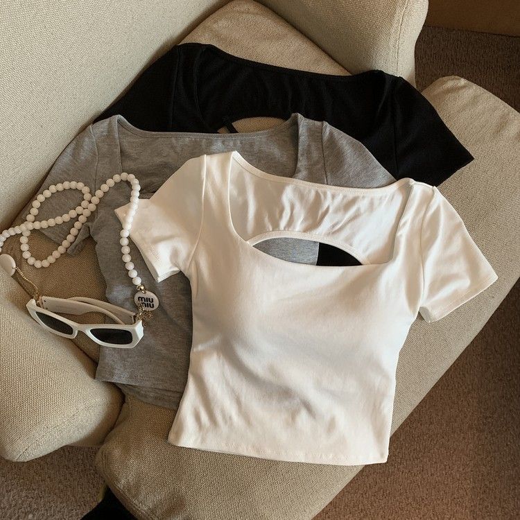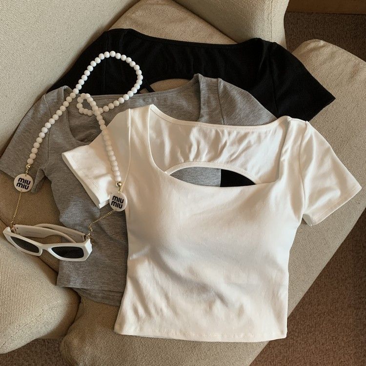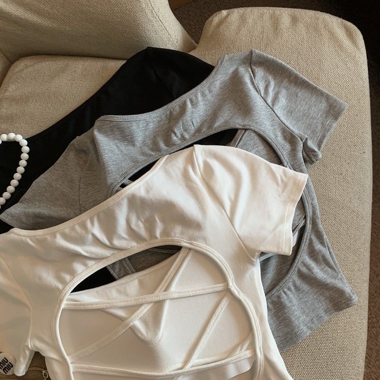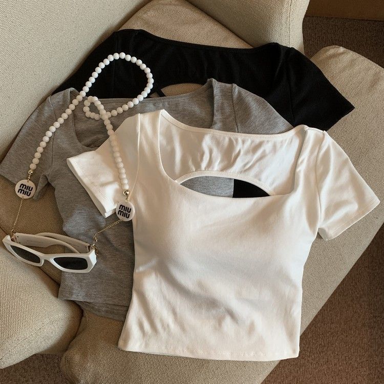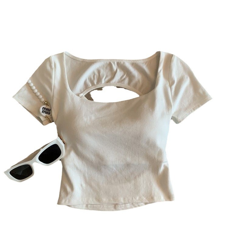 아메리칸 스타일 할로우 크로스 백리스 반팔 티셔츠 여성용 여름 스파이스 걸 스퀘어 칼라, 가슴 패드베이스 셔츠 쇼트 탑