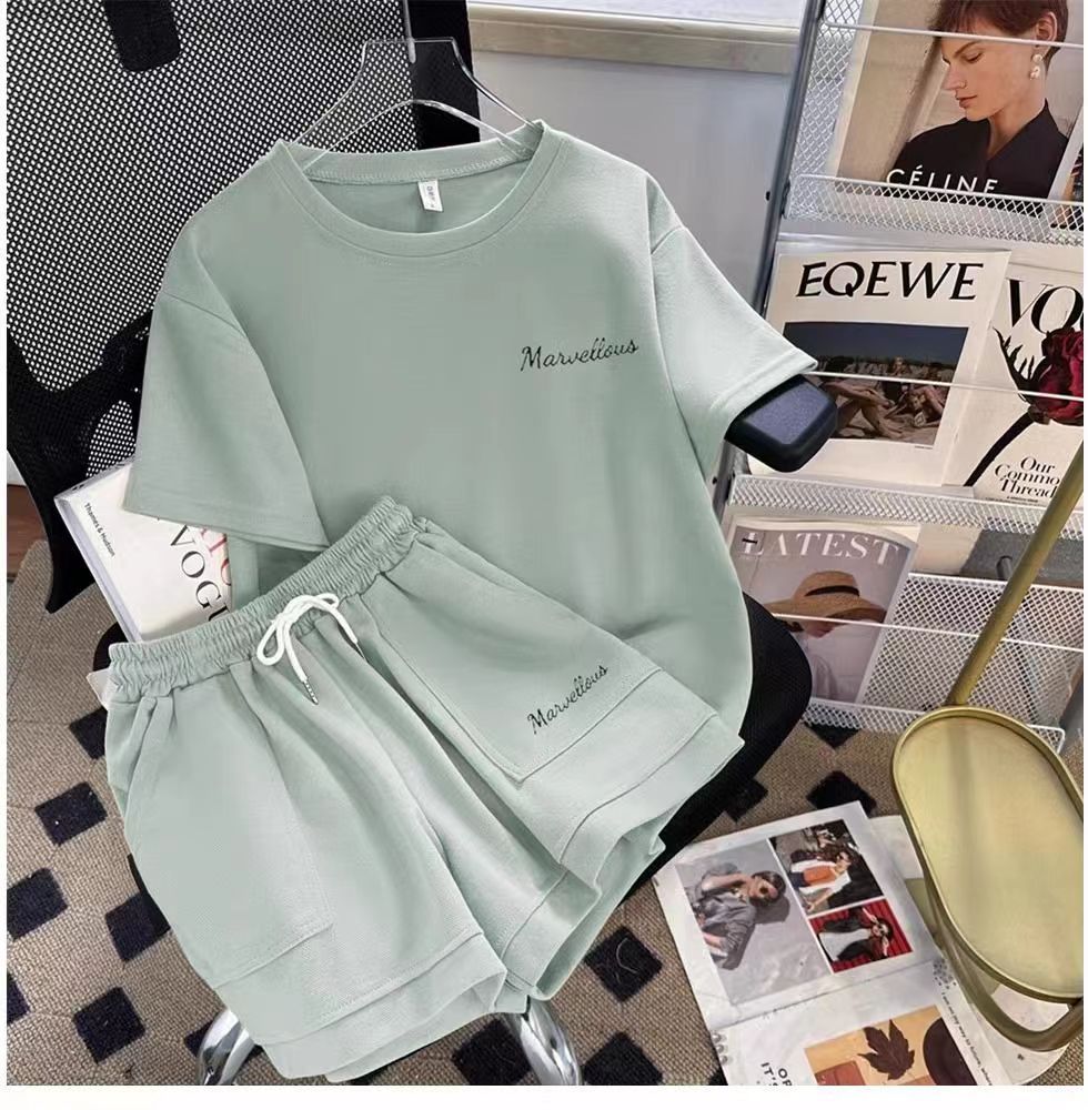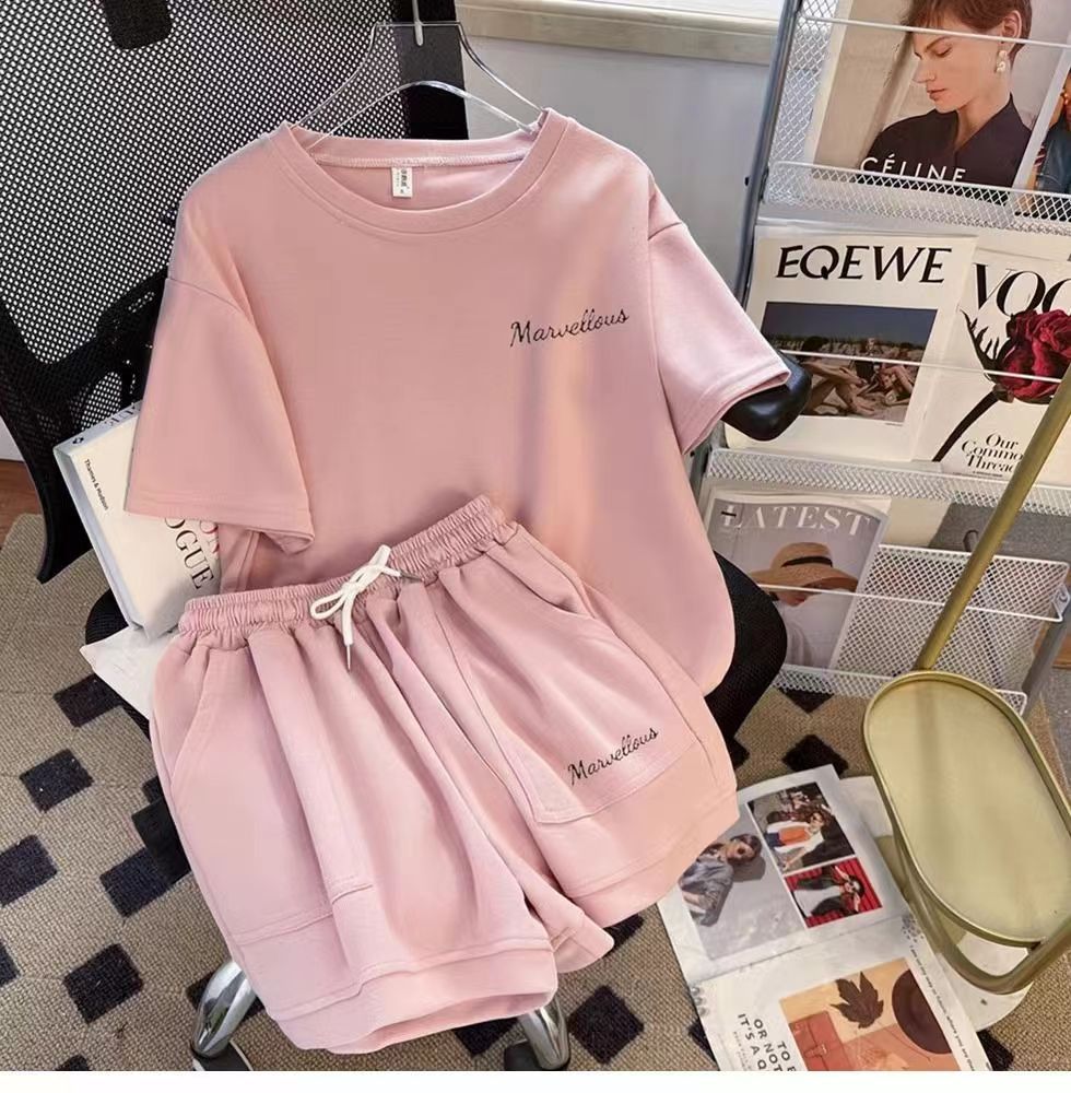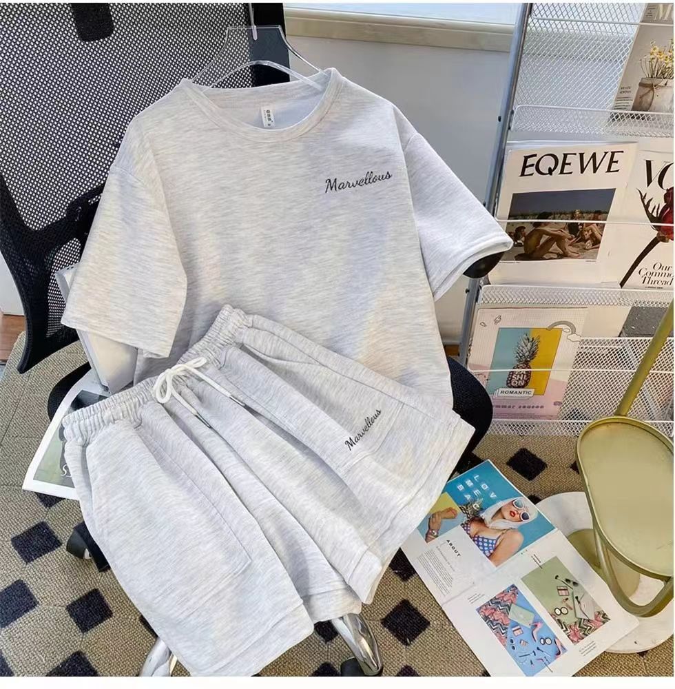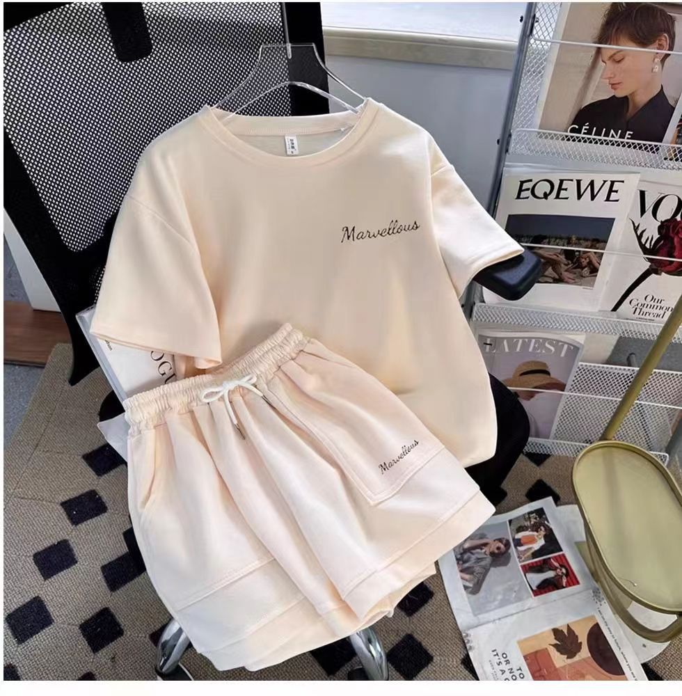 유행 연령 감소 반팔 반바지 스포츠 세트 여성 여름 한국식 느슨한 슬리밍 캐주얼 와이드 레그 바지 투피스 세트