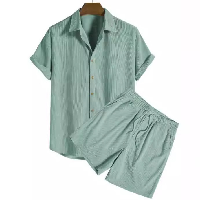 유럽과 미국의 AliExpress 대외 무역 독립 역 남성 캐주얼 느슨한 멀티 컬러 비치 착용 코듀로이 반팔 세트 투피스 세트