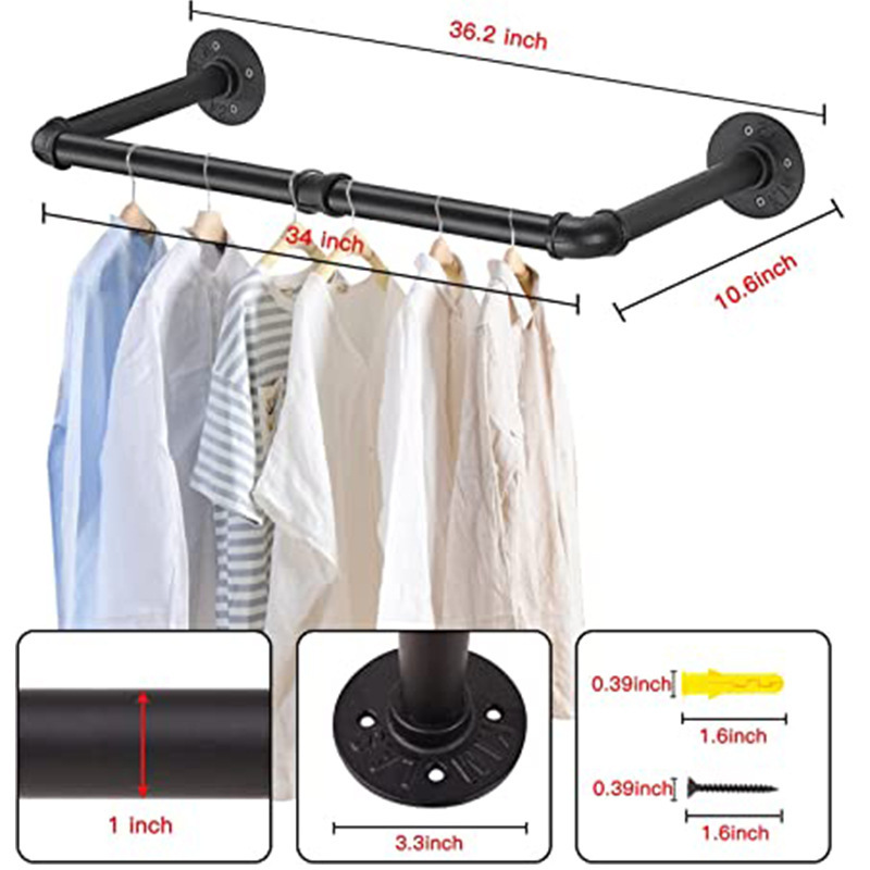 국경 벽에 장착 된 건조 랙 산업 스타일의 철 수도관 의류 랙 현대 블랙 스토리지 랙 다기능 교수형 기둥