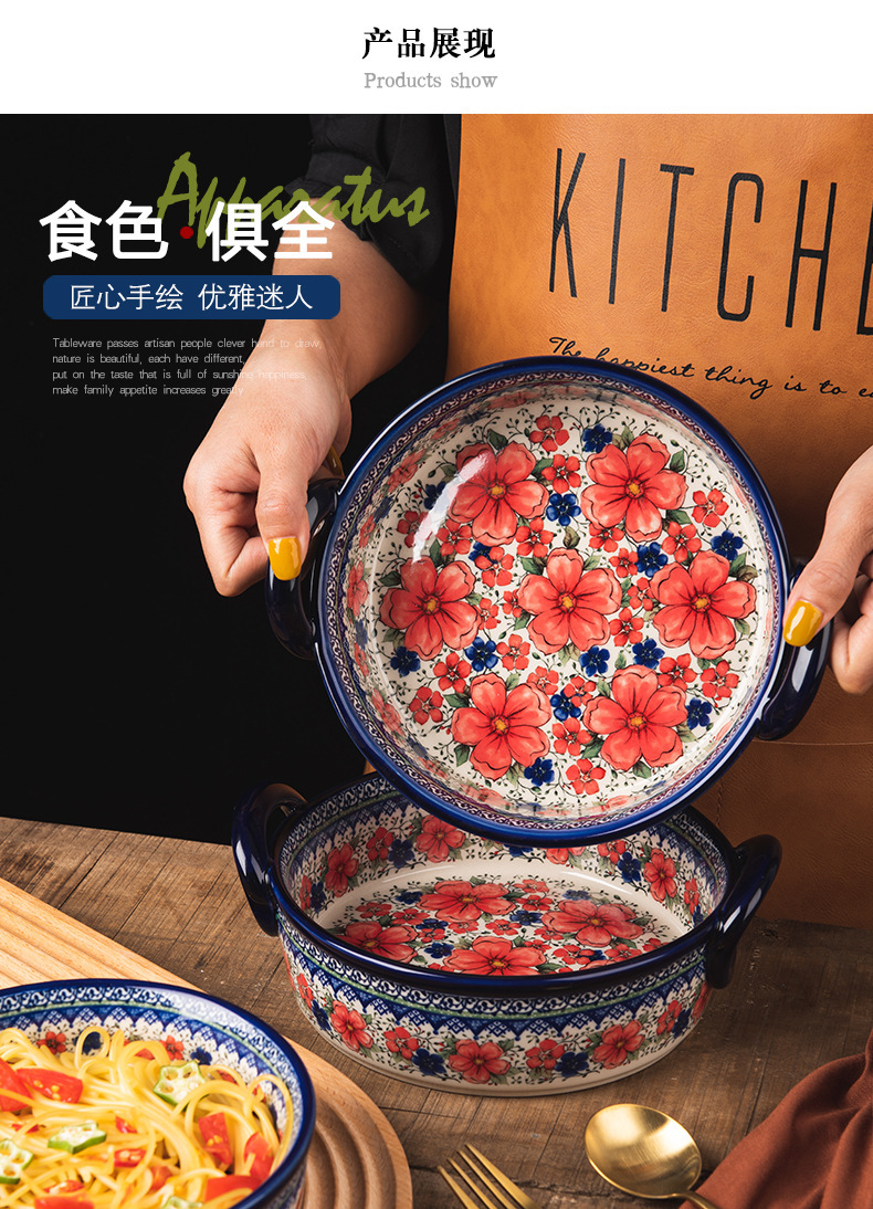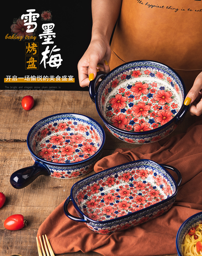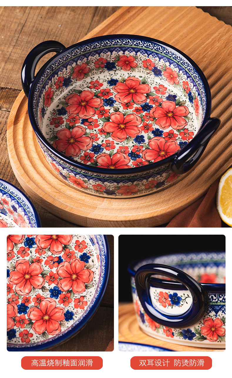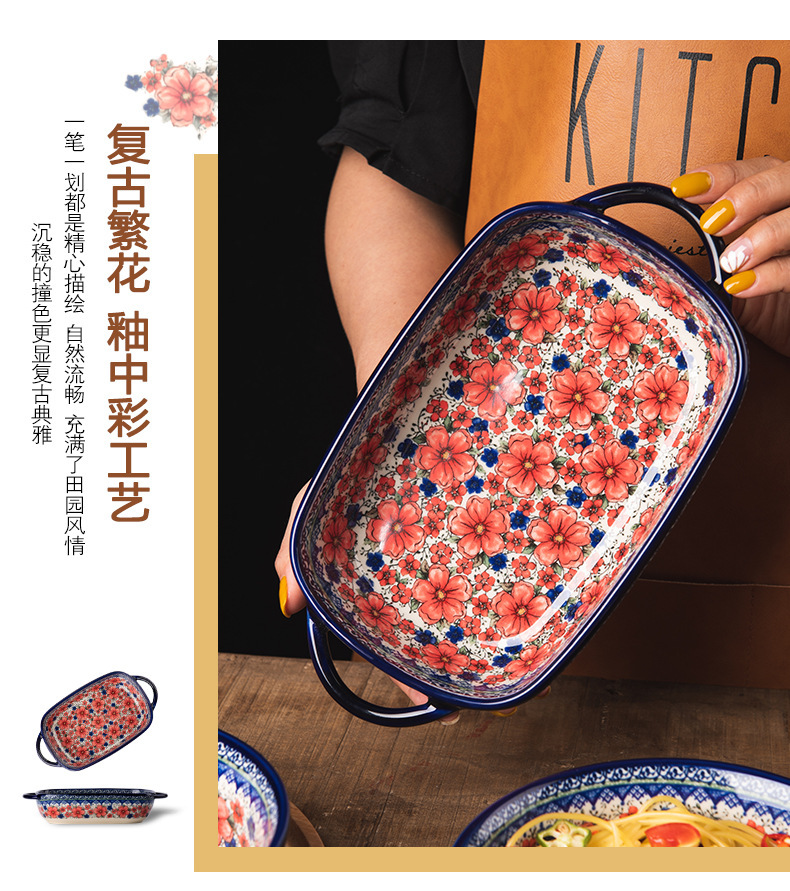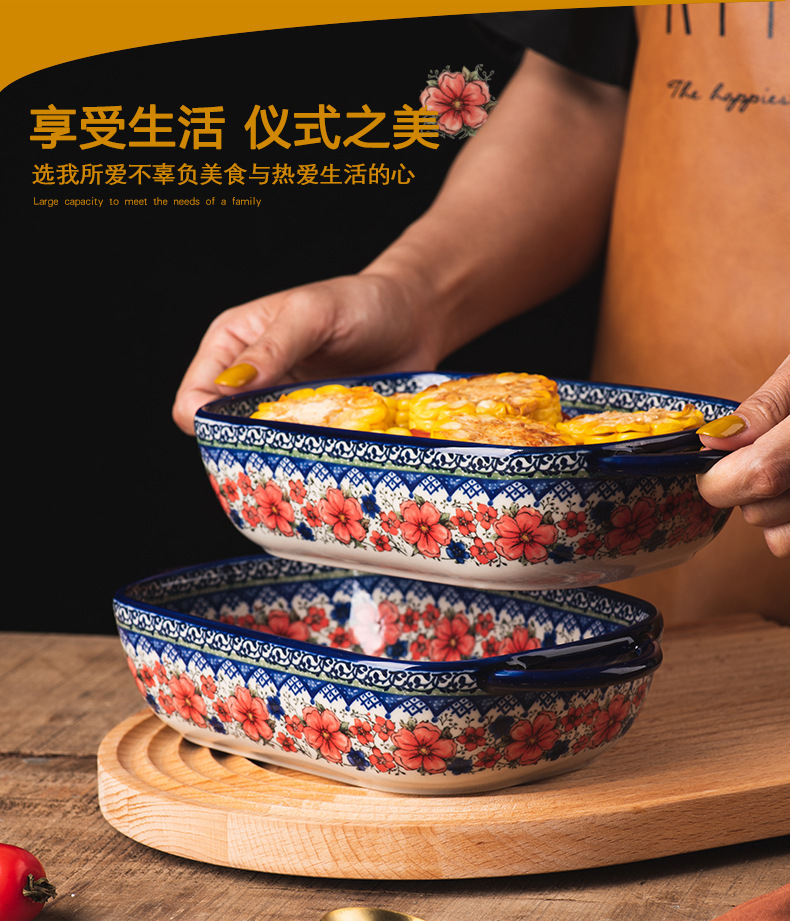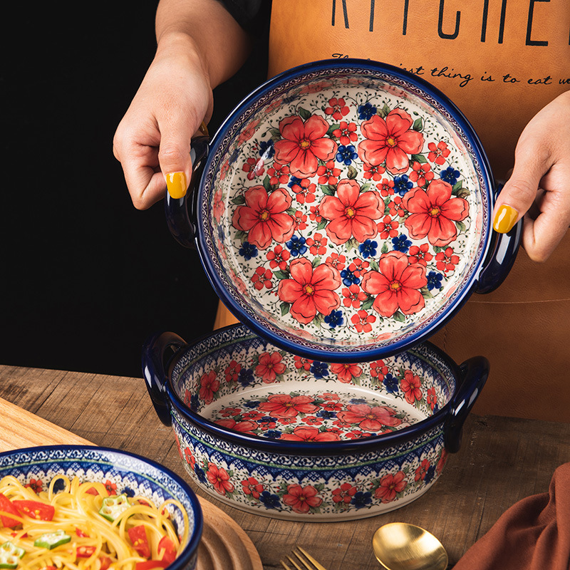 핸들 그릇 폴란드어 식기 가정용 샐러드 그릇 국수 그릇 수프 그릇 더블 이어 플레이트 베이킹 롱 스퀘어 플레이트 아마존 도매