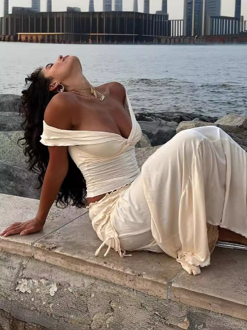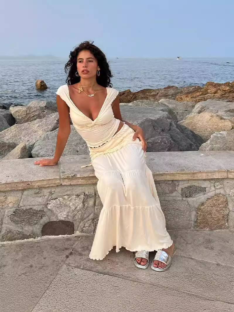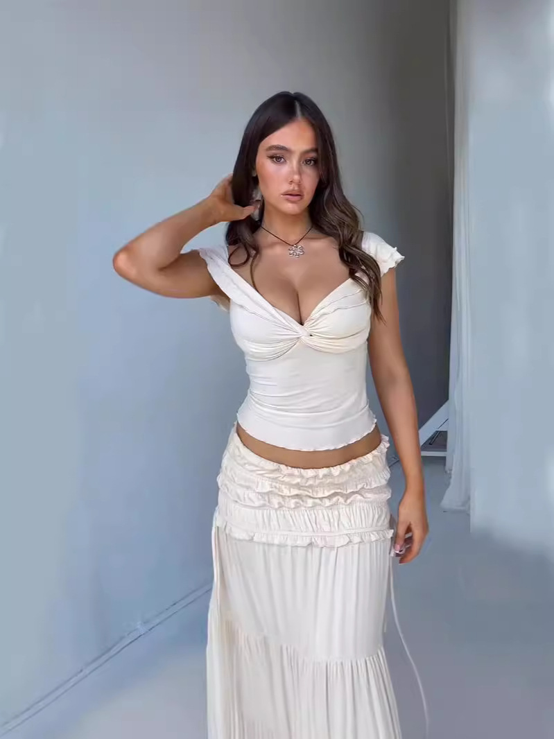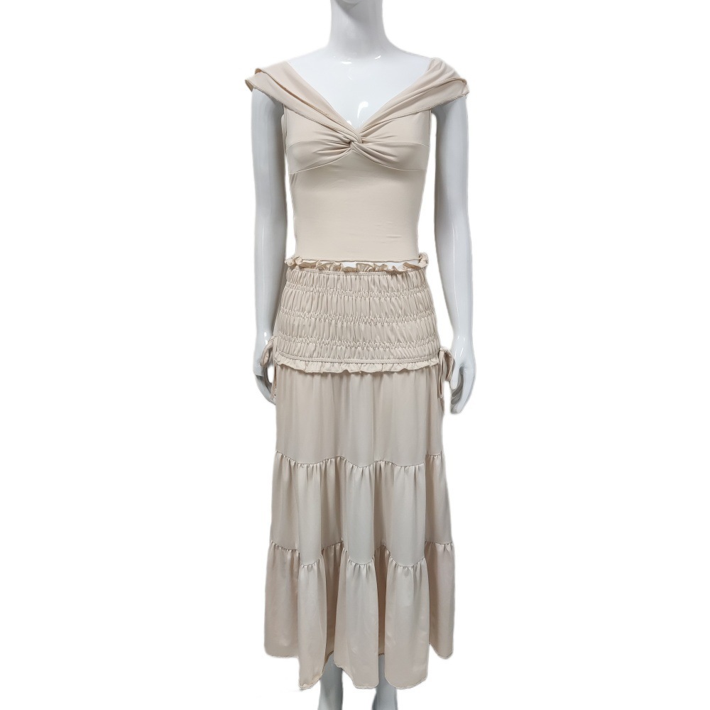 夏季新款女性露脐低胸短款背心法式气质褶皱半身裙女套装