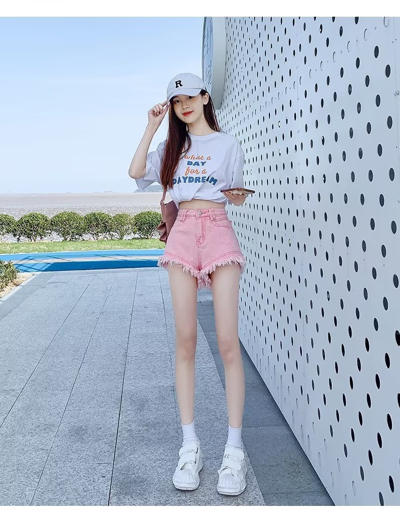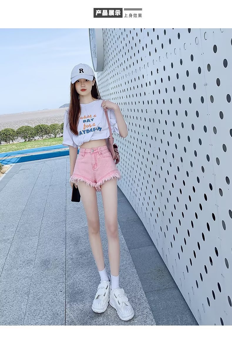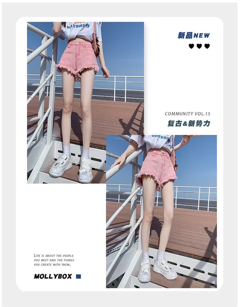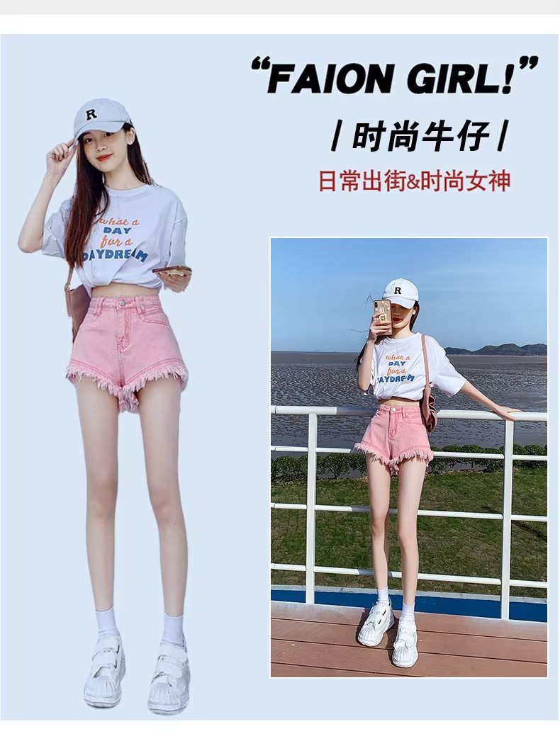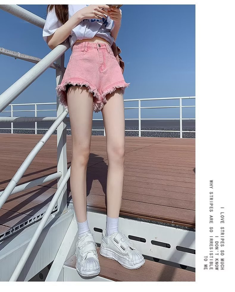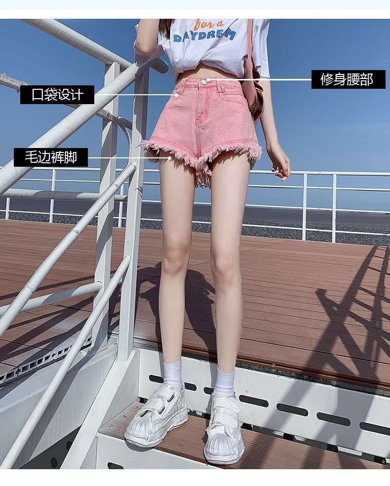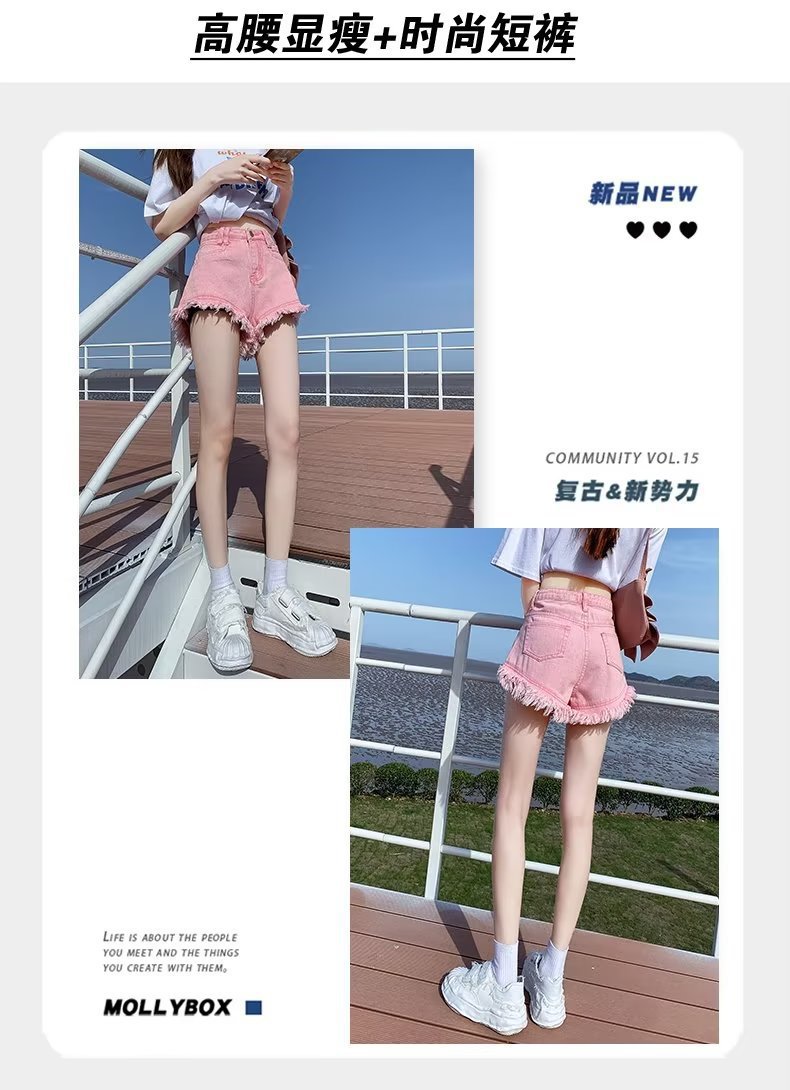 높은 허리 슬림 룩 핑크 데님 반바지 여성 여름 2023 새로운 스타일 작은 느슨한 산조각 슬림 룩 핫 바지
