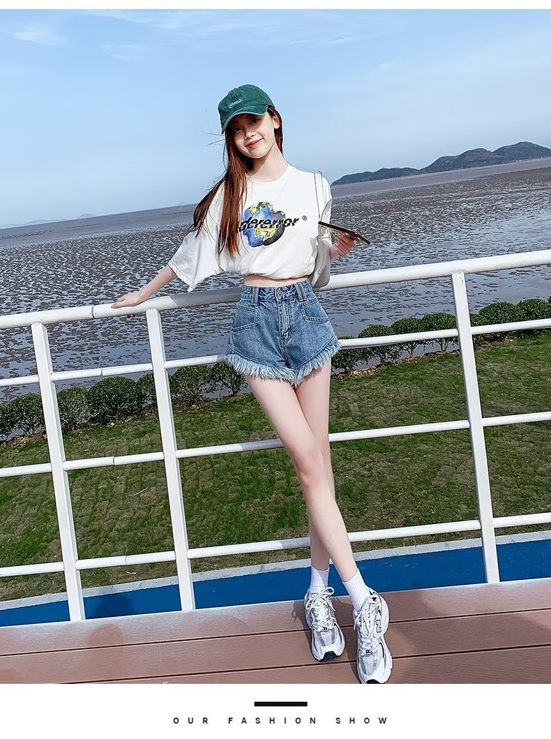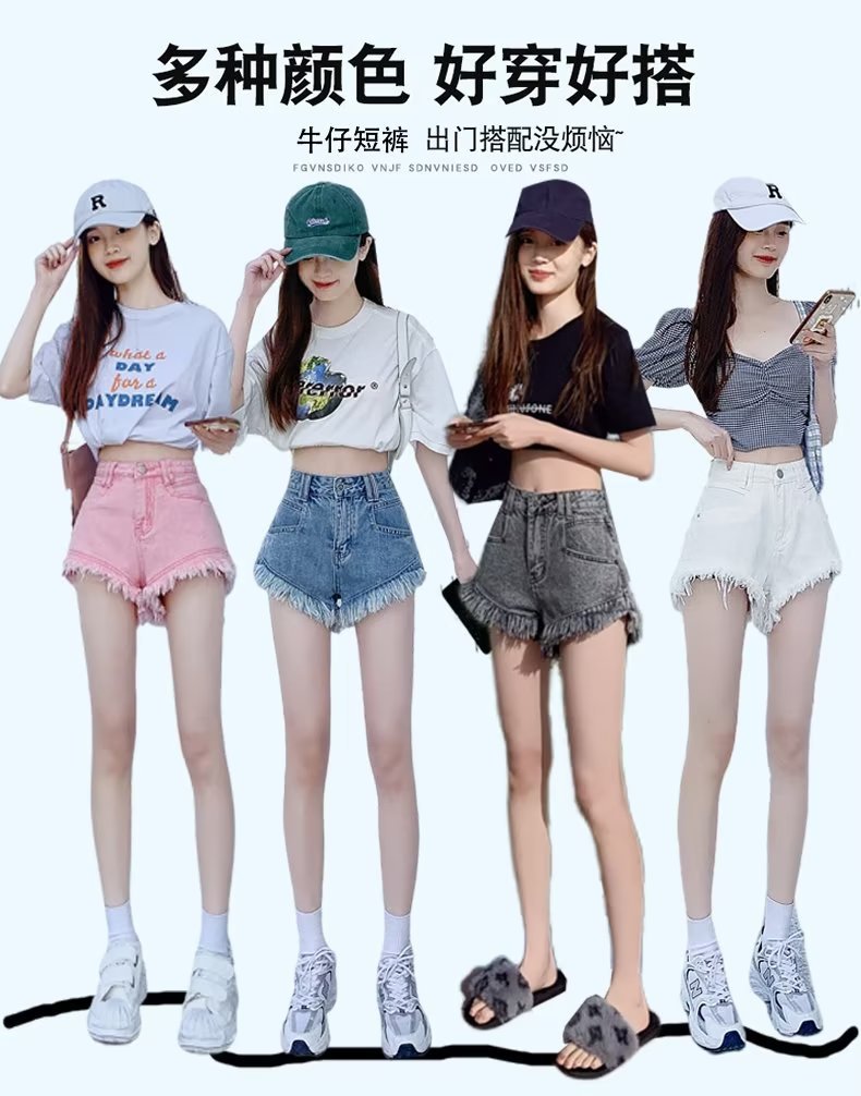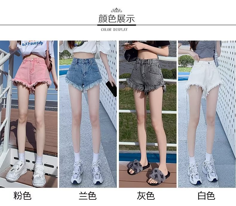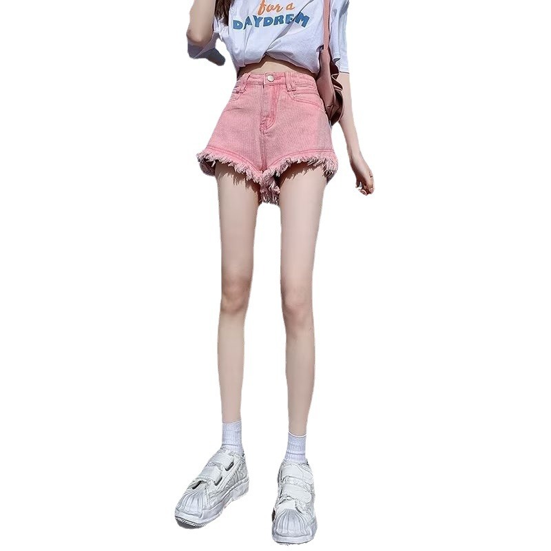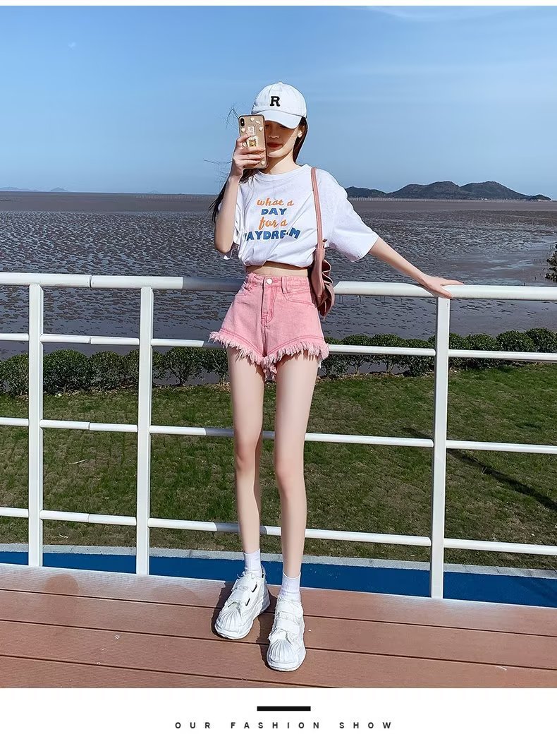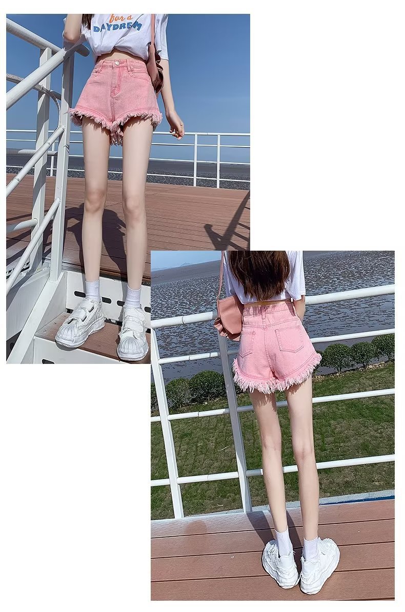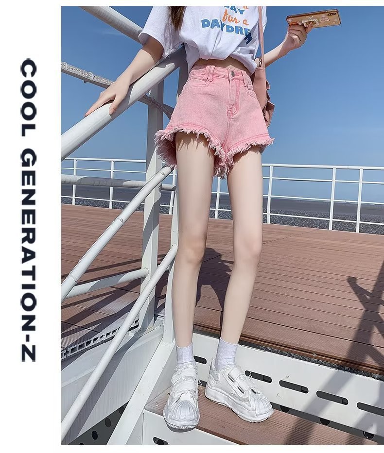높은 허리 슬림 룩 핑크 데님 반바지 여성 여름 2023 새로운 스타일 작은 느슨한 산조각 슬림 룩 핫 바지