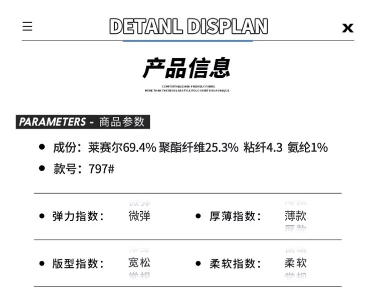 Lyocell 섬유 (lyocell) 69.4 폴리 에스테르 복합 탄성 섬유 25.3 비스코스 섬유 (비스코스 섬유) 4.3 폴리 우레탄 탄성 섬유