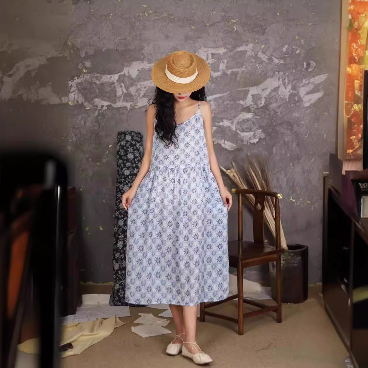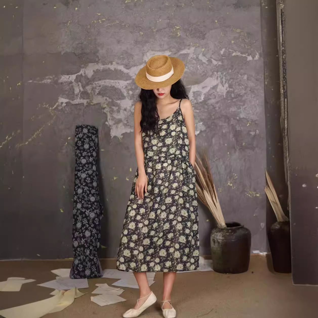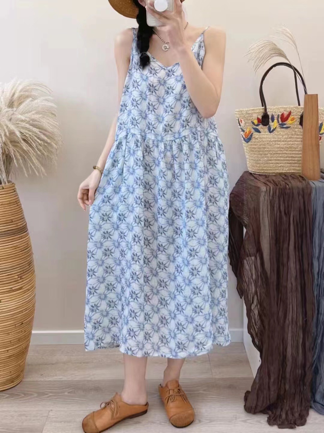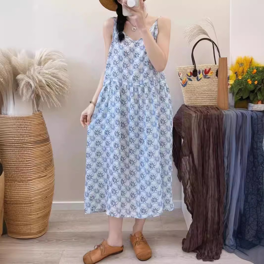 오리지널 컬러 중간 길이 라미 슬링 원피스 여성 예술적 우아한 대형 스윙 원피스 긴 원피스 휴일 원피스 비치 원피스