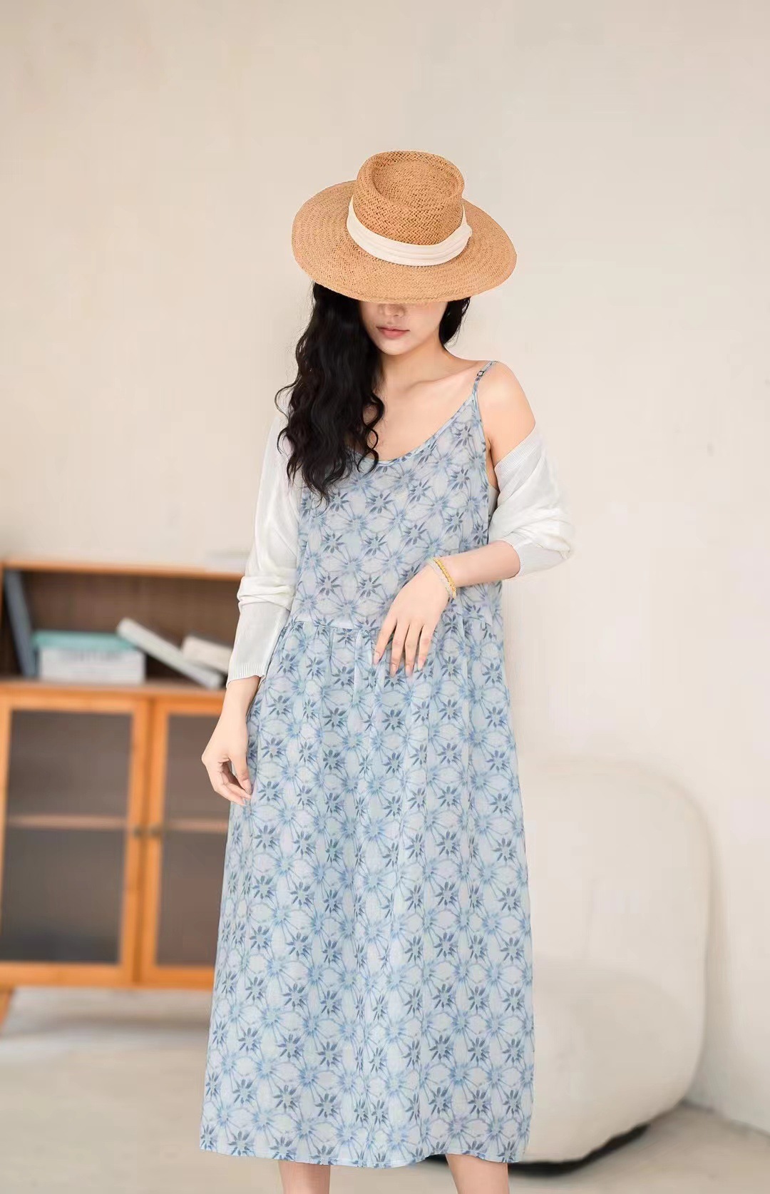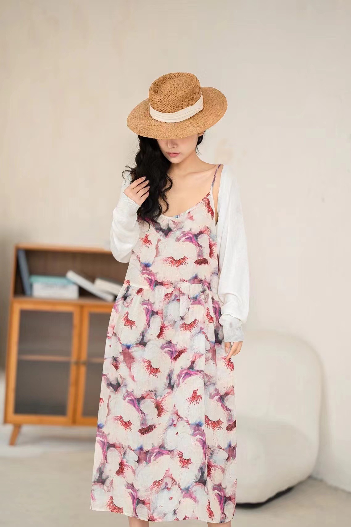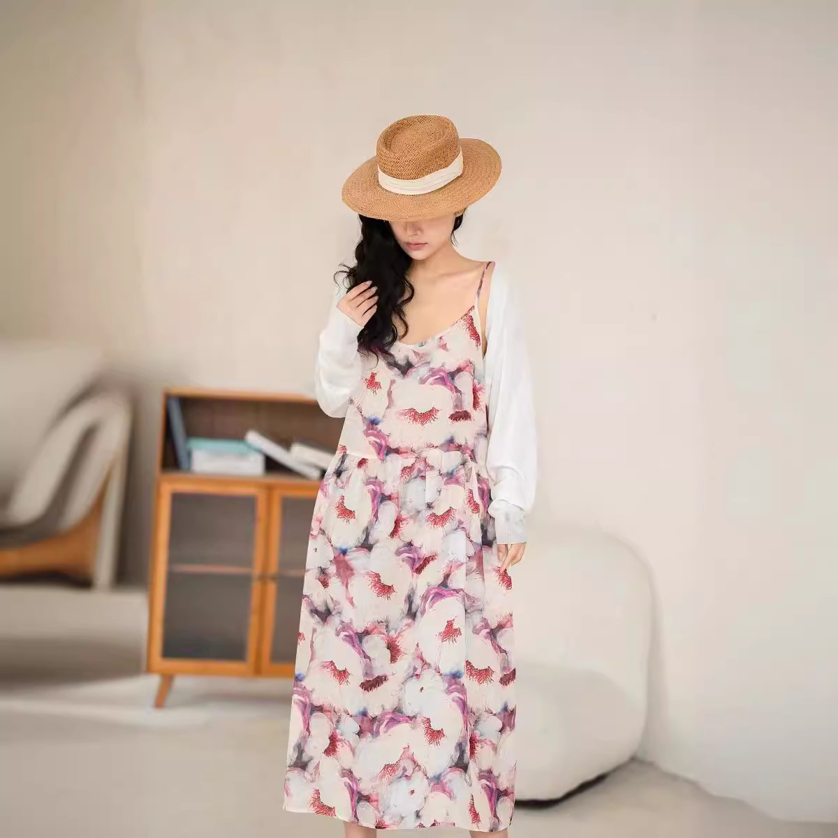 오리지널 컬러 중간 길이 라미 슬링 원피스 여성 예술적 우아한 대형 스윙 원피스 긴 원피스 휴일 원피스 비치 원피스