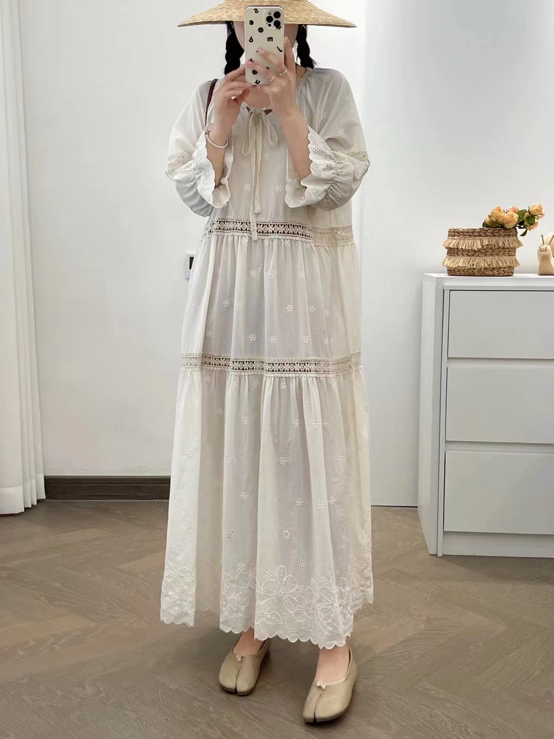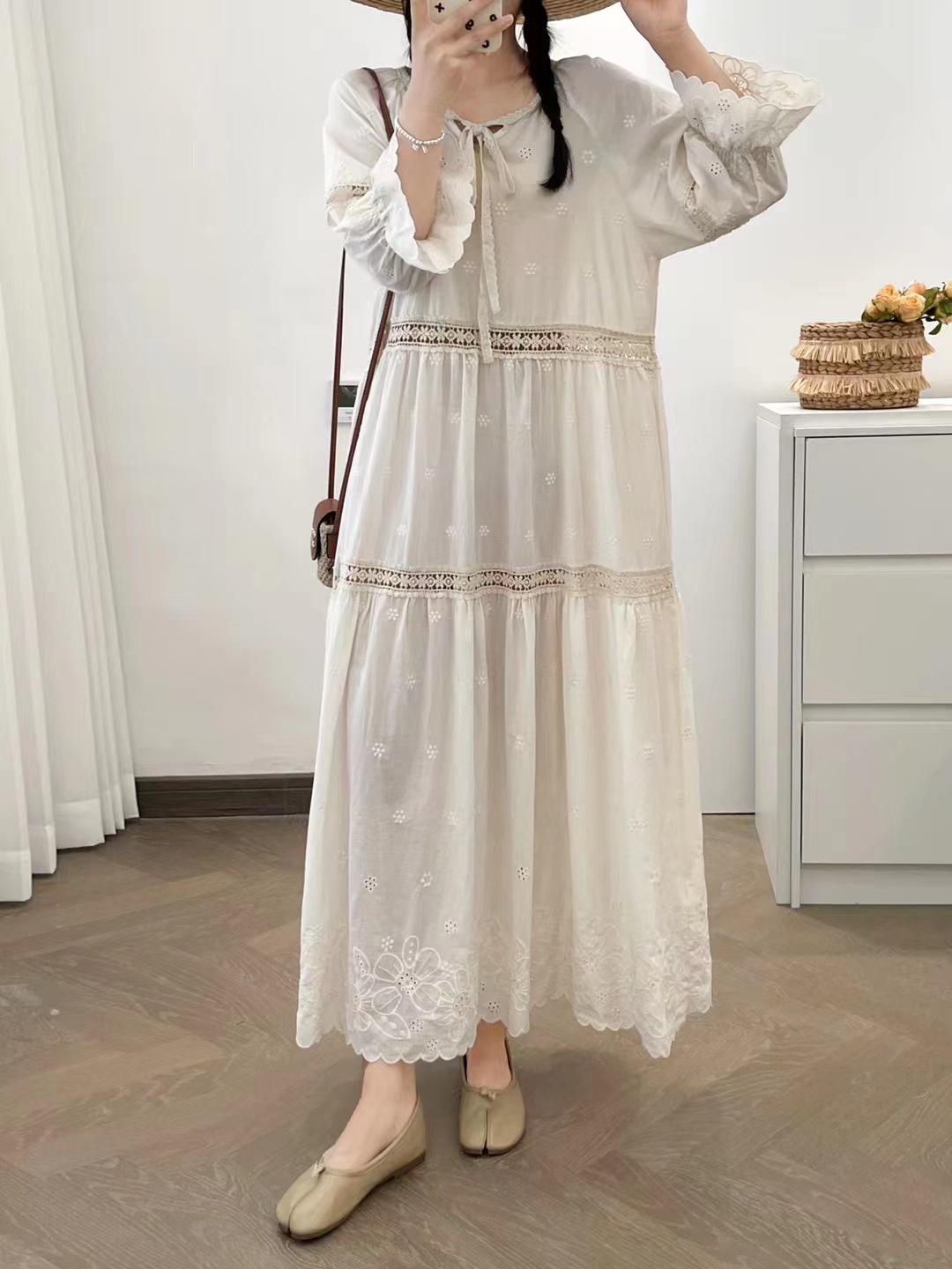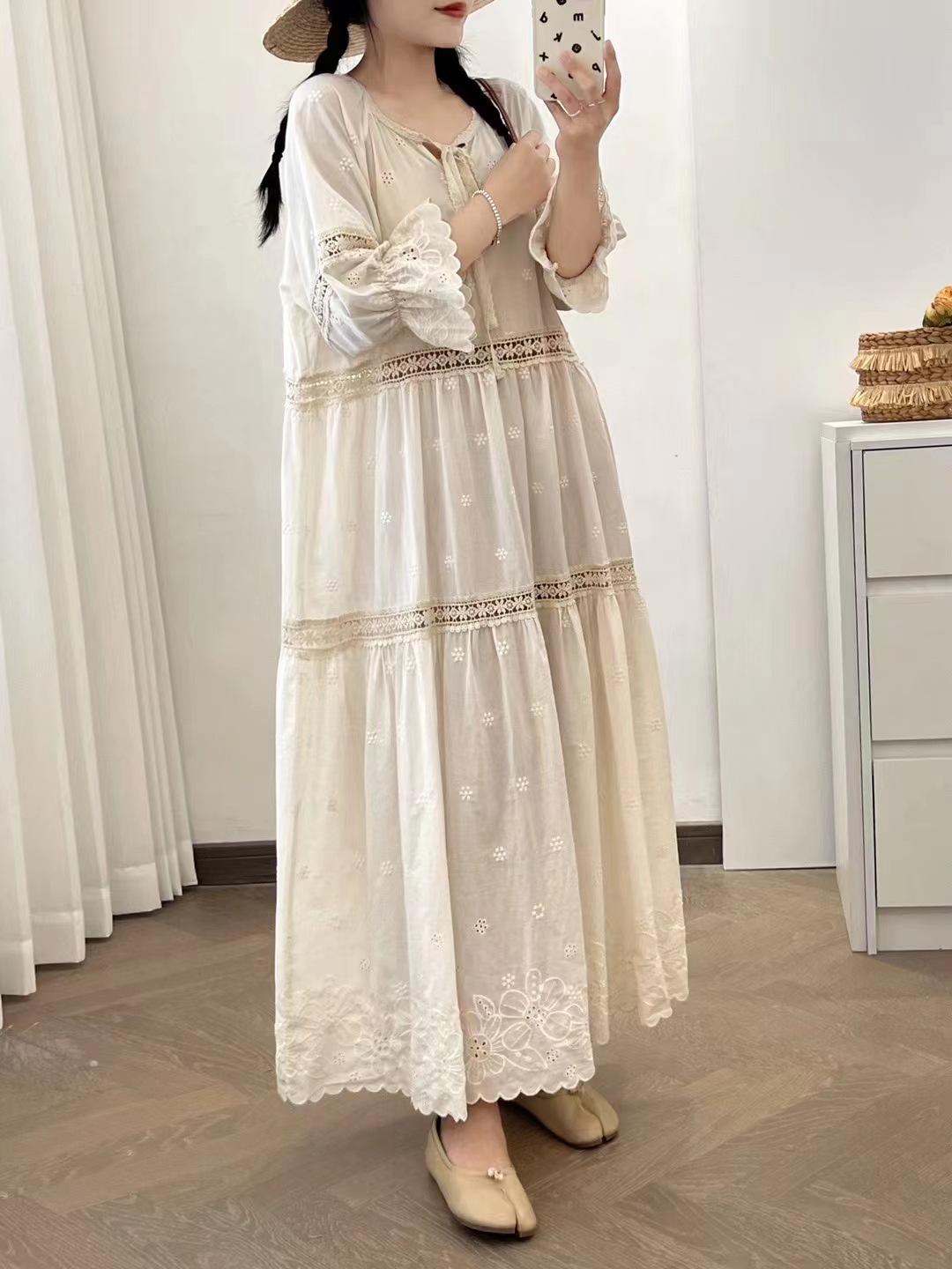 빈티지 프랑스 스타일 중공 스티칭 면화 원피스 둥근 목 느슨한 해변 홀리데이 스타일 비치 원피스 5194