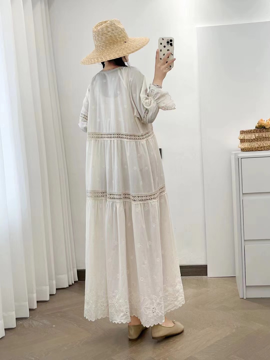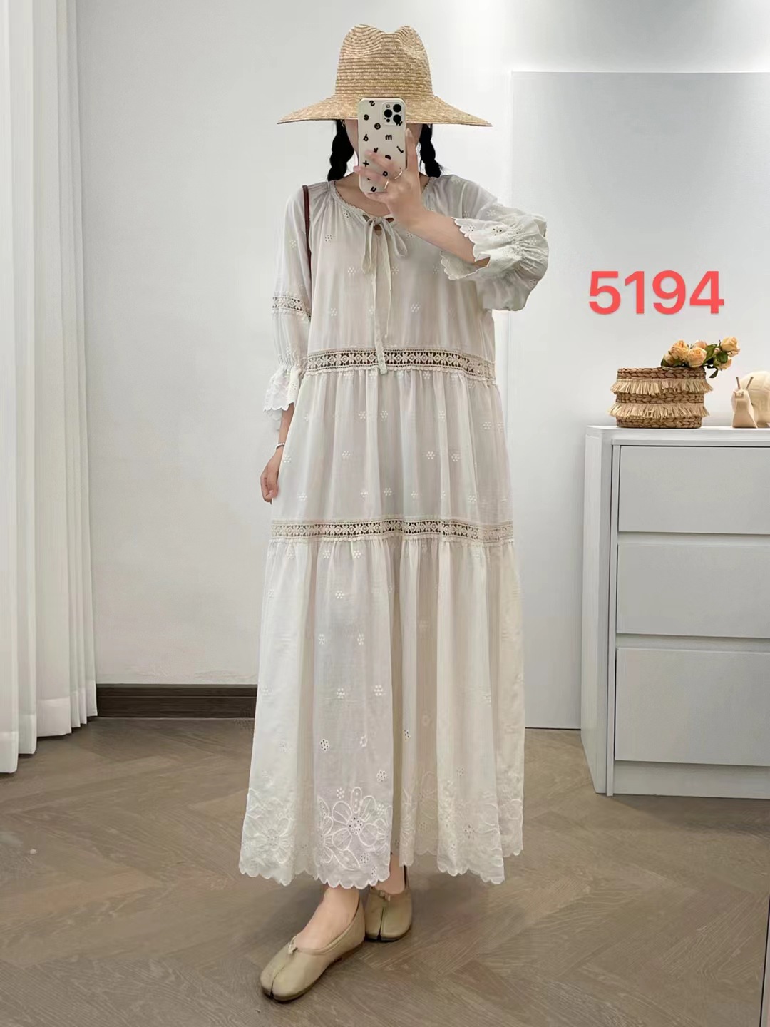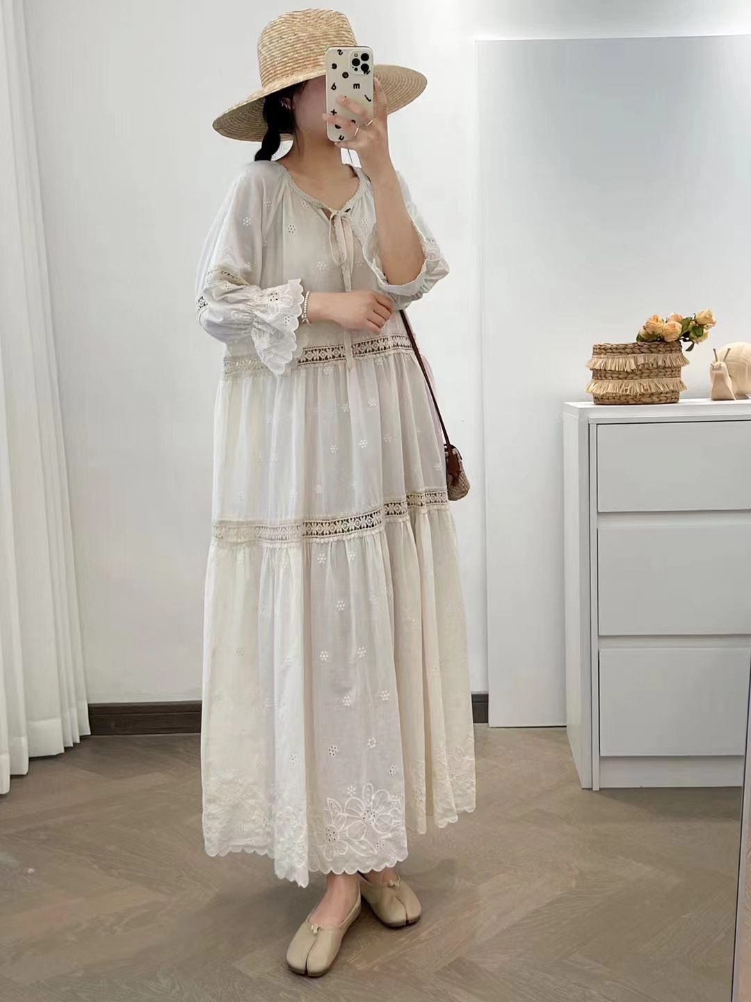 빈티지 프랑스 스타일 중공 스티칭 면화 원피스 둥근 목 느슨한 해변 홀리데이 스타일 비치 원피스 5194
