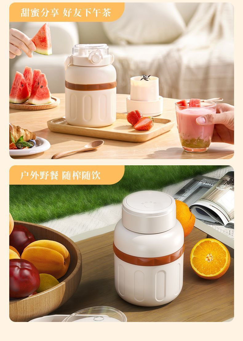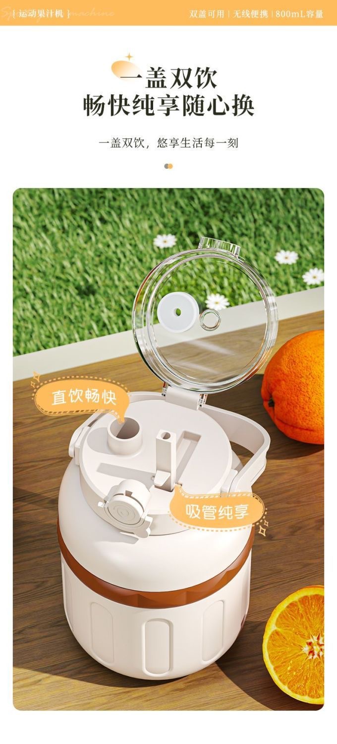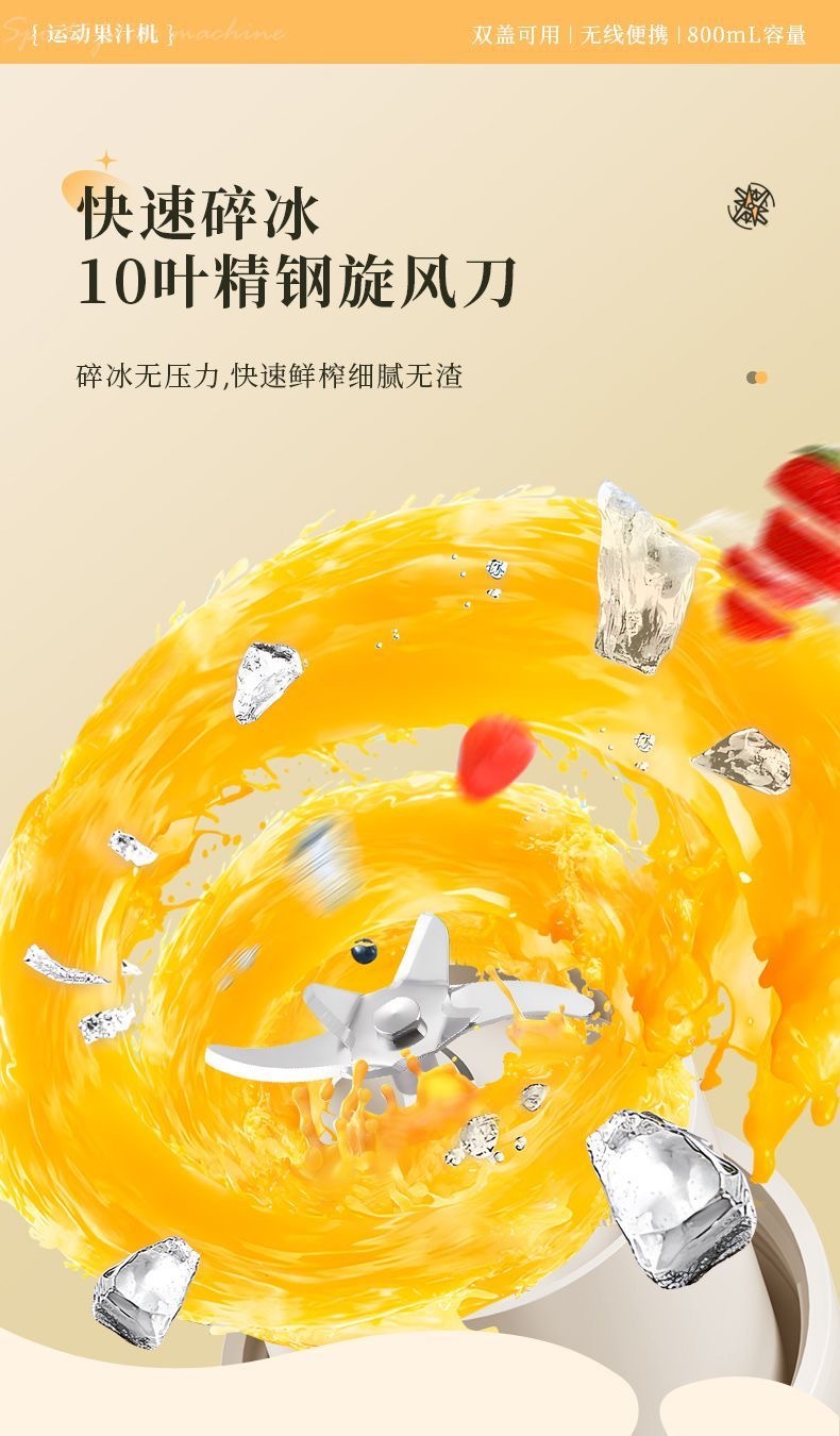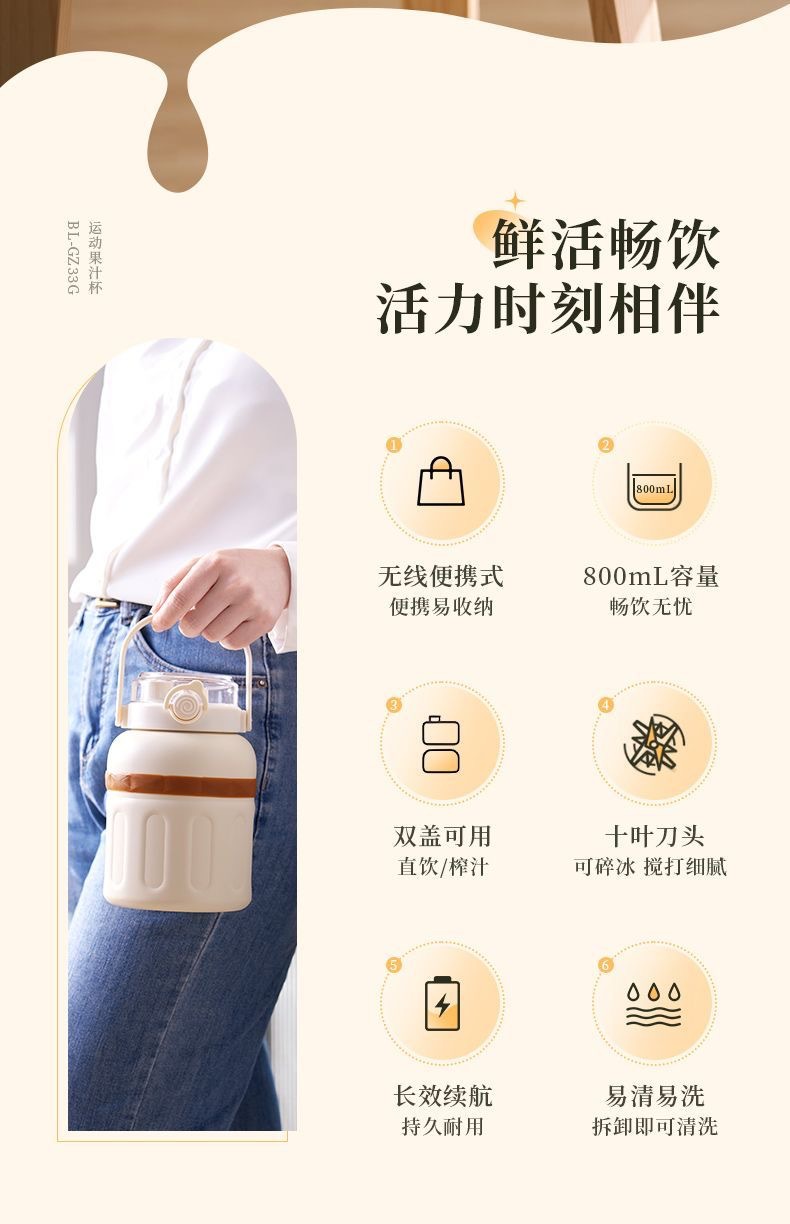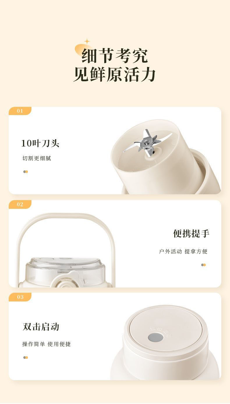 1.室内户外均可 2.充电便携 3.10叶304精钢刀片 4.800ml大容量 5.超长续航,满电8-10杯 6.精致提绳 7.榨汁直饮双盖 8.运动健身榨汁 备注:可定制客户LOGO 专色2000台起