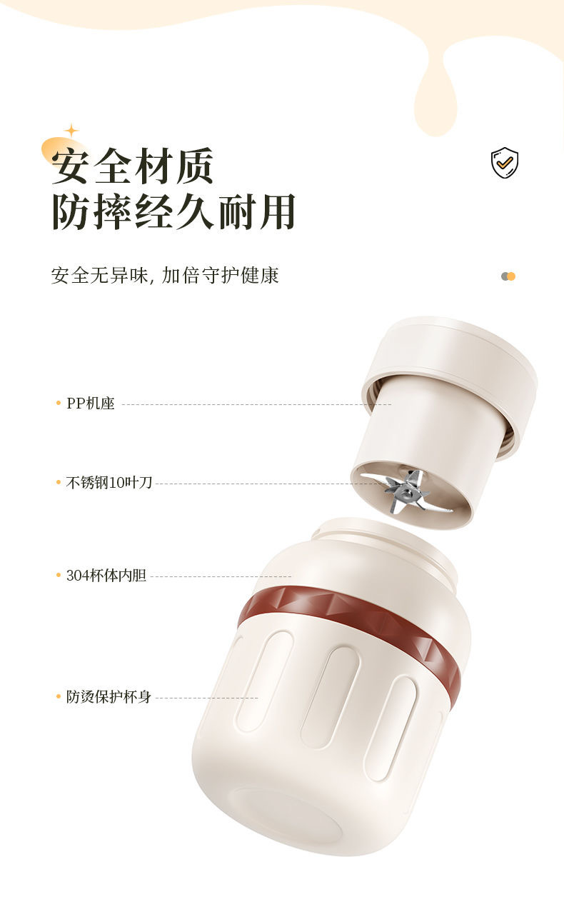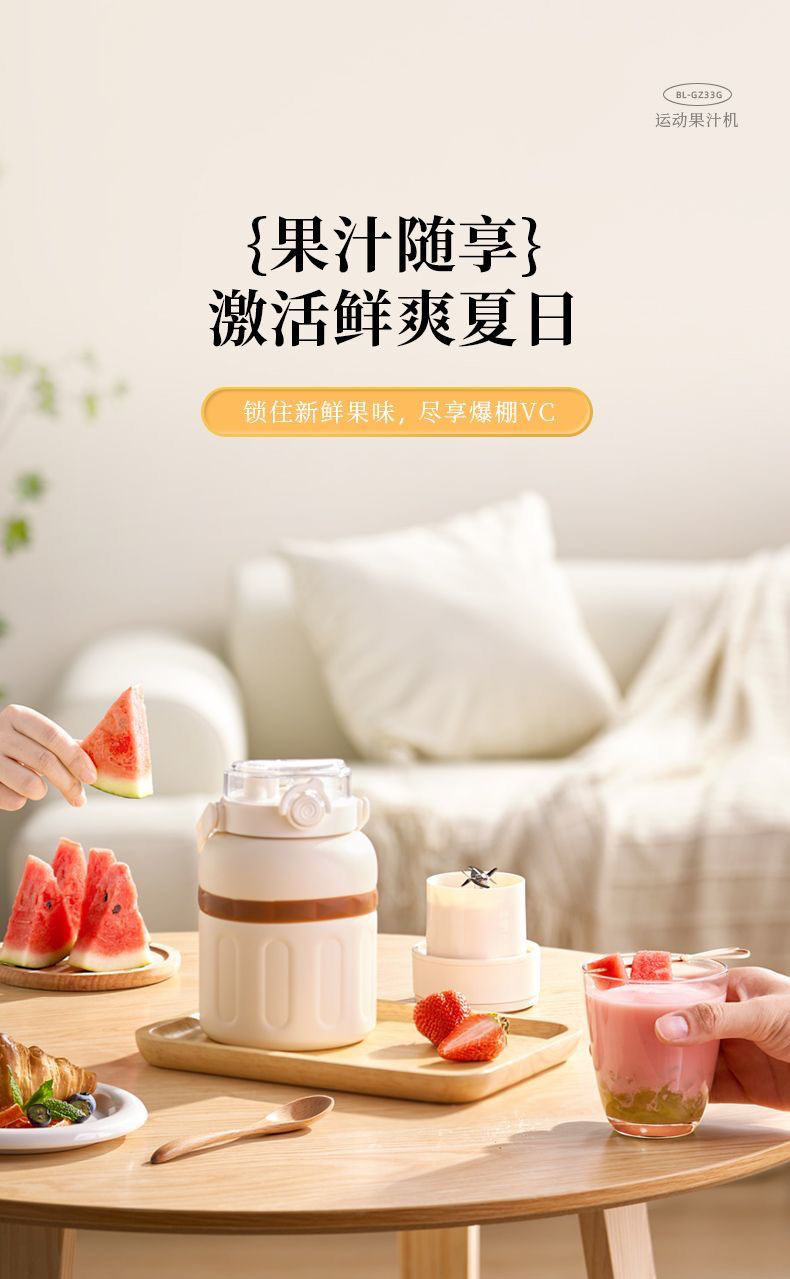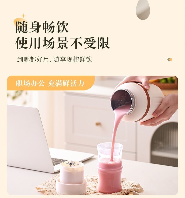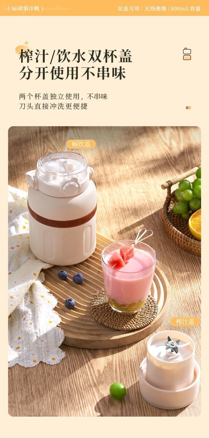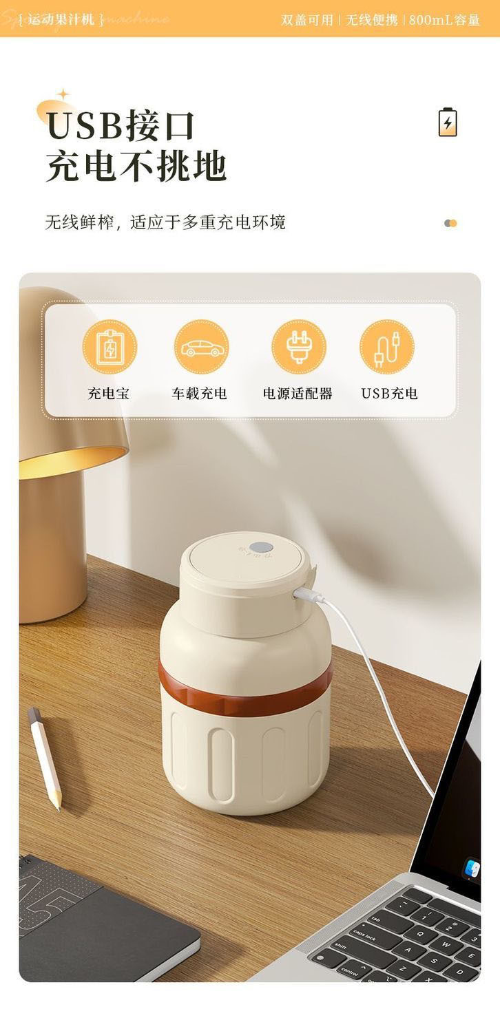 1.室内户外均可 2.充电便携 3.10叶304精钢刀片 4.800ml大容量 5.超长续航,满电8-10杯 6.精致提绳 7.榨汁直饮双盖 8.运动健身榨汁 备注:可定制客户LOGO 专色2000台起