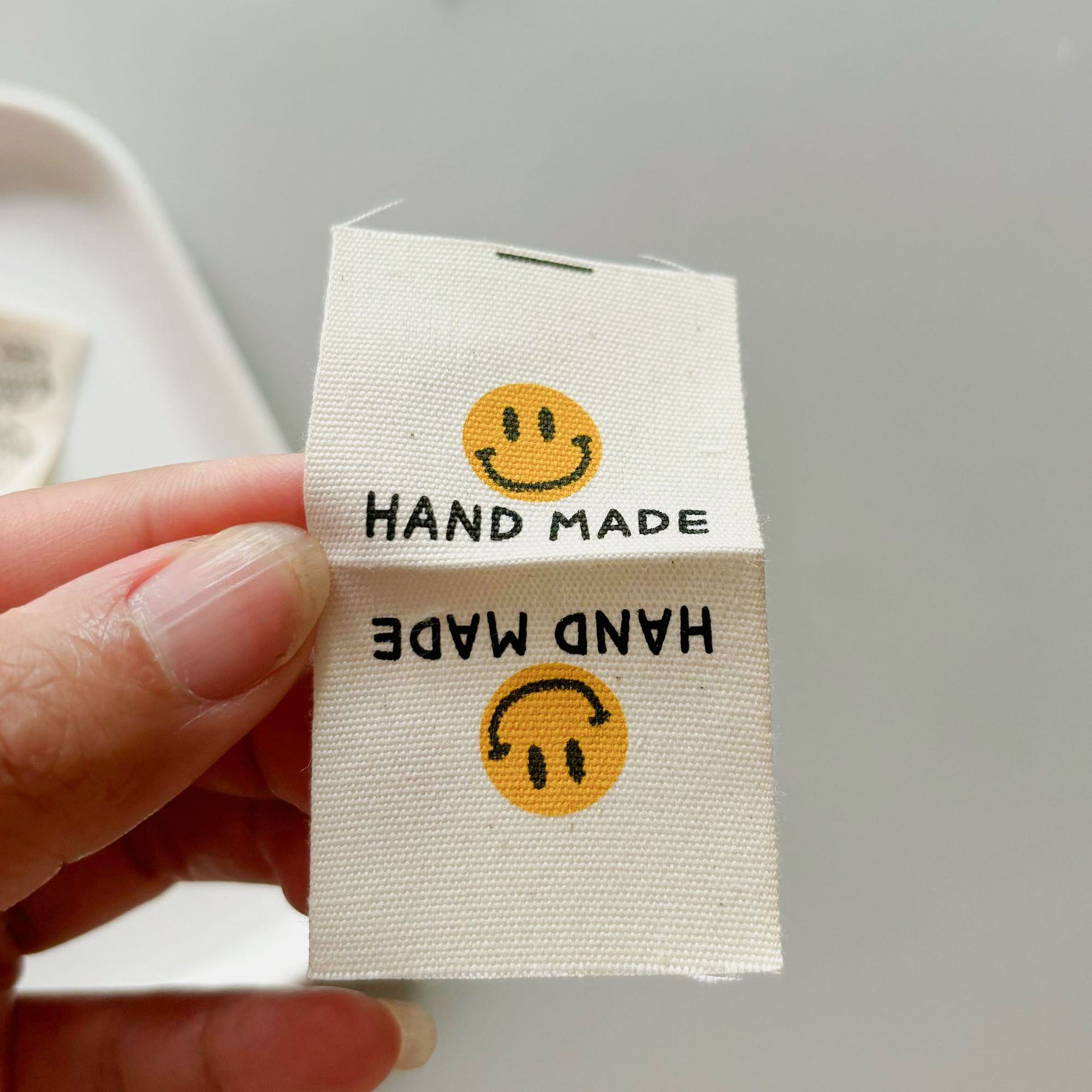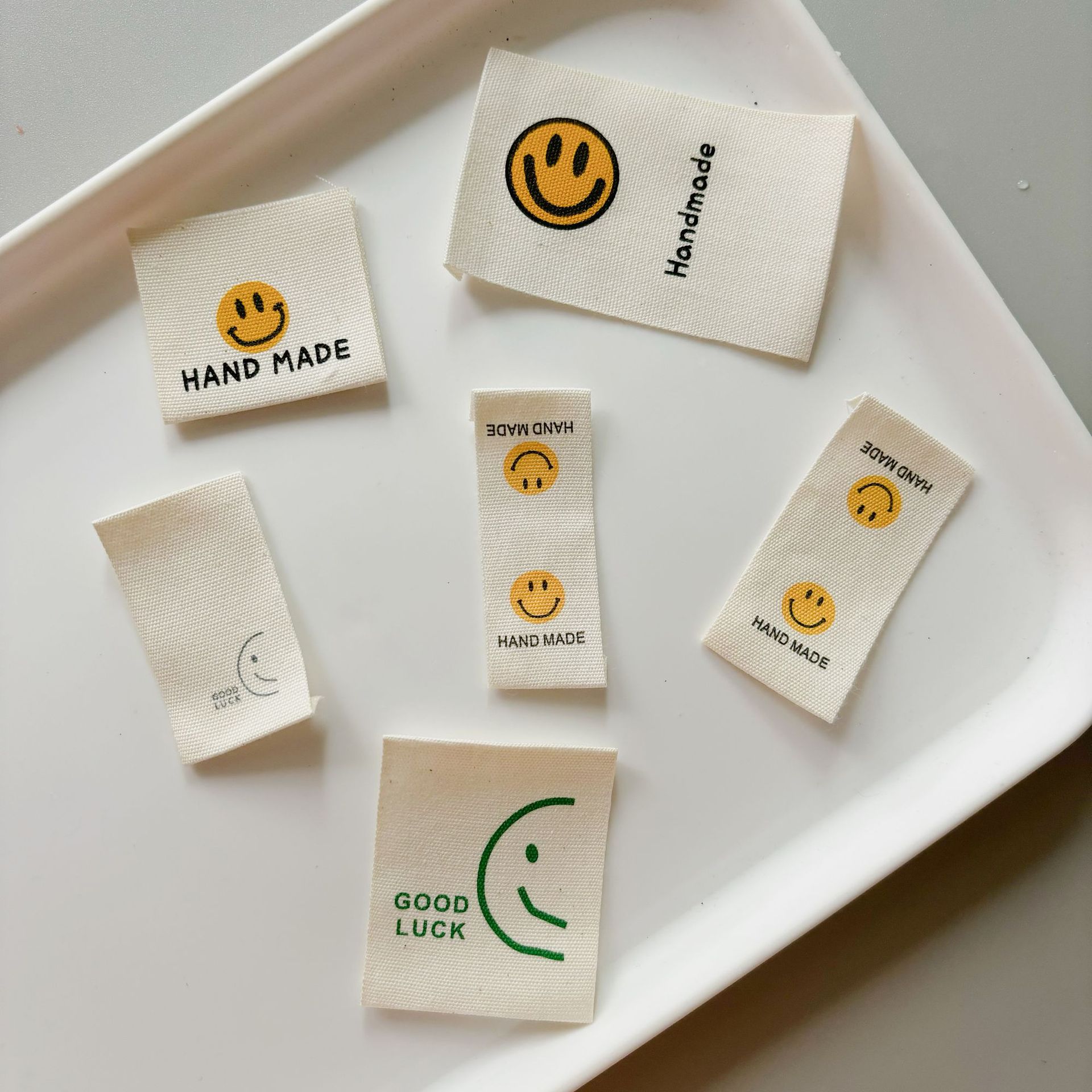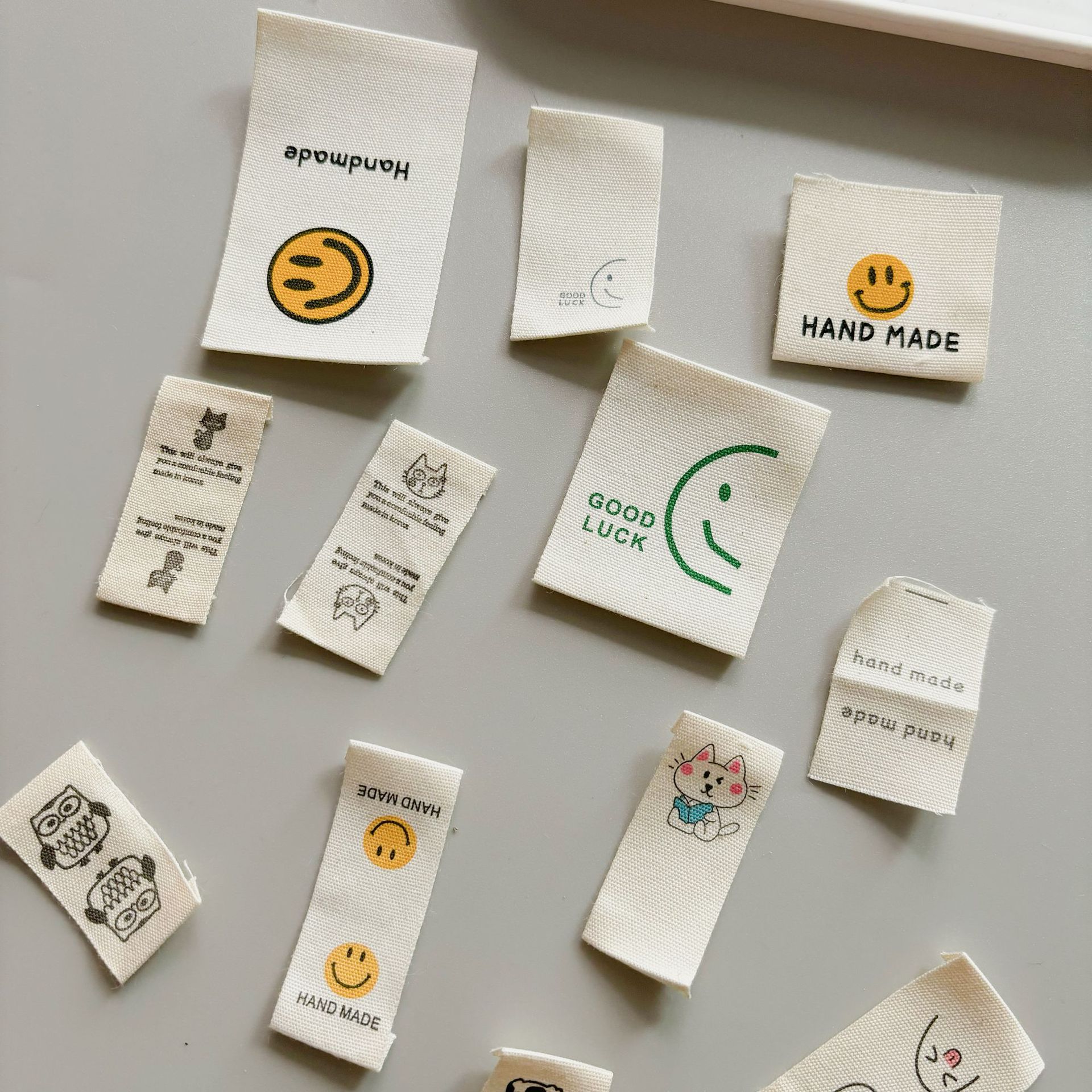 재고 목화 수제 인쇄 마크 헴 사이드 라벨 웃는 얼굴 새끼 고양이 천 라벨 의류 가방 양말 액세서리 액세서리