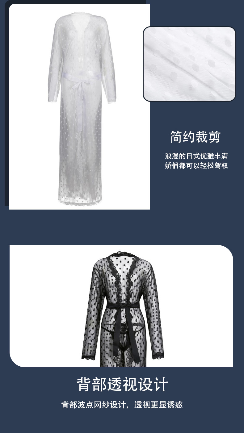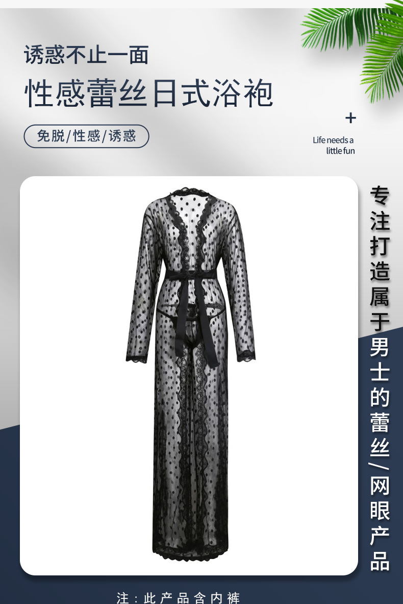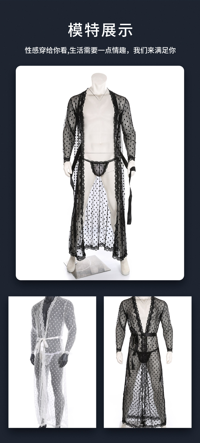 跨境新款男士日式圆点蕾丝浴袍情趣睡衣透视透气性感睡袍配丁字裤