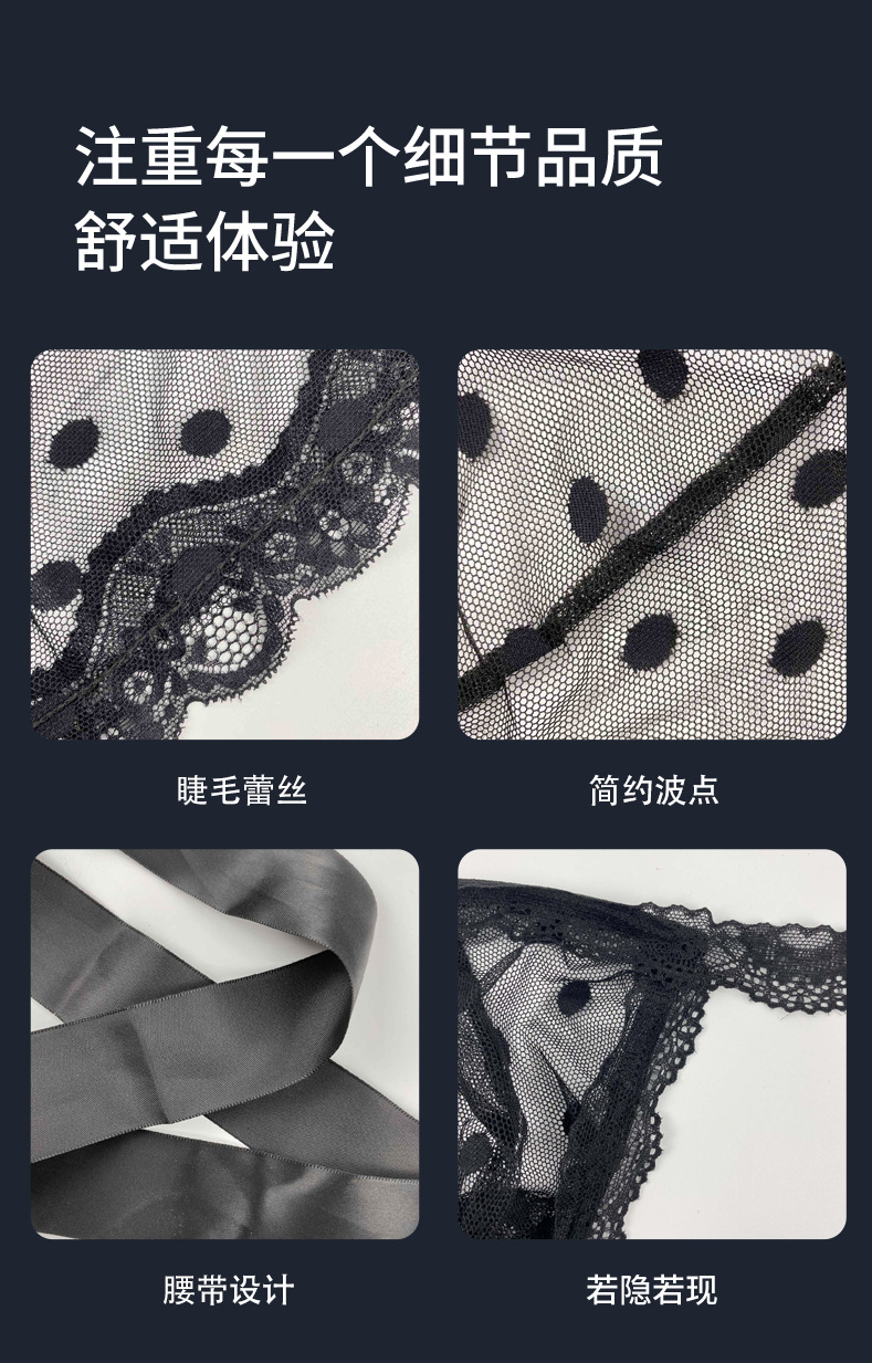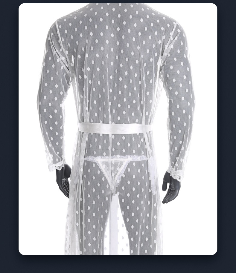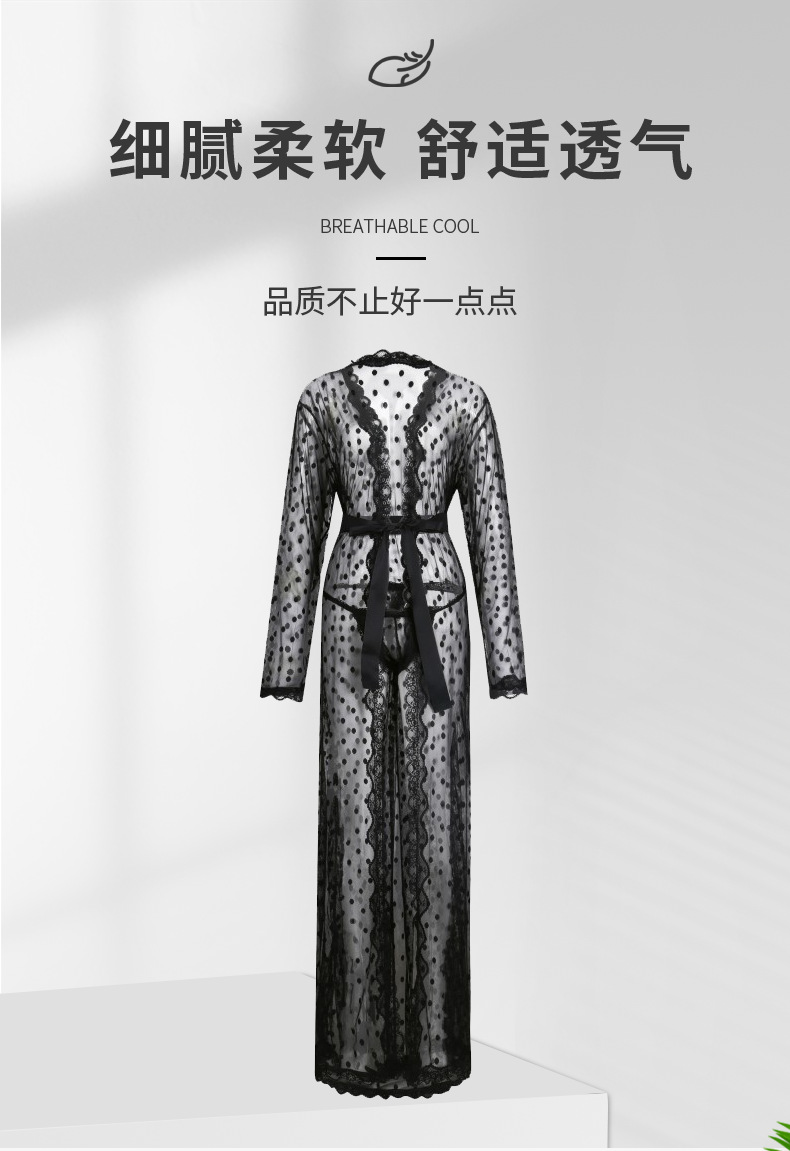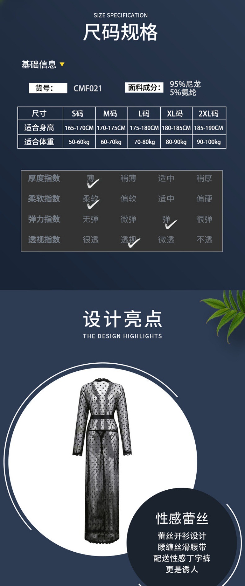 跨境新款男士日式圆点蕾丝浴袍情趣睡衣透视透气性感睡袍配丁字裤