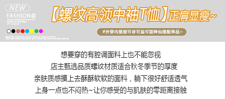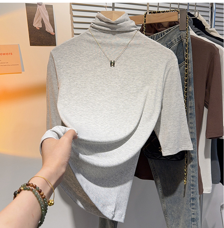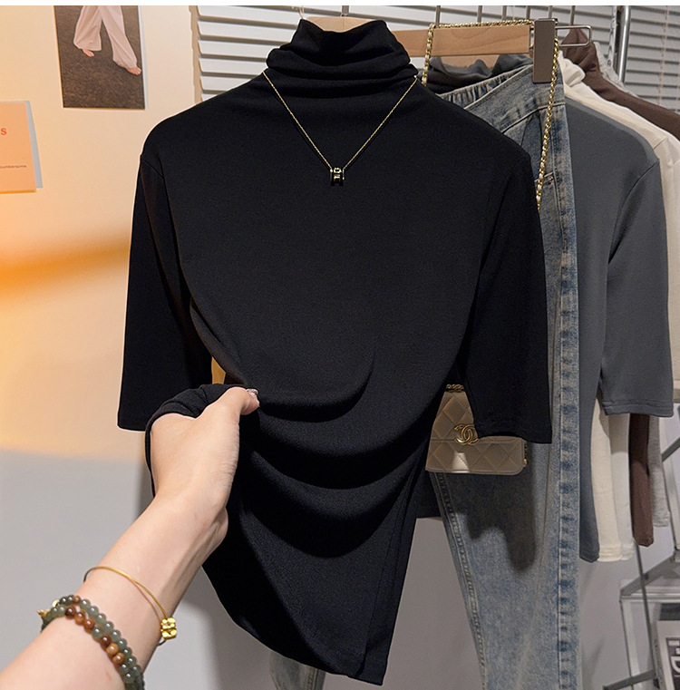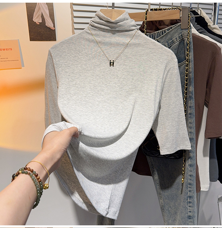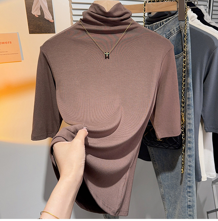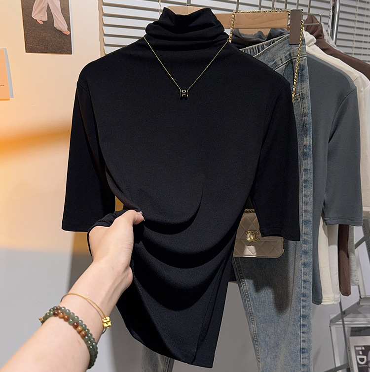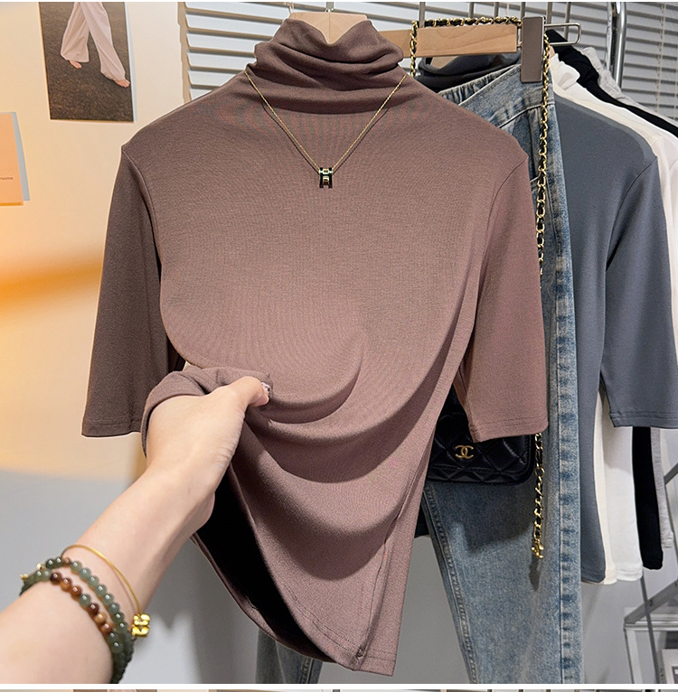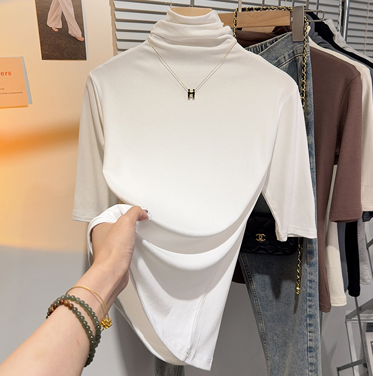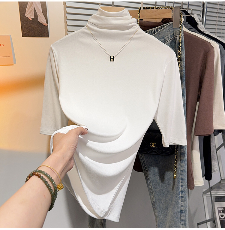 힙 칼라 미드 슬리브 티셔츠 여성의 2024 새로운 스타일 웨스턴 스타일 슬림 하프 핏 슬리브 하이 칼라 탑 하프 슬리브 스레드 베이스 레이어 셔츠