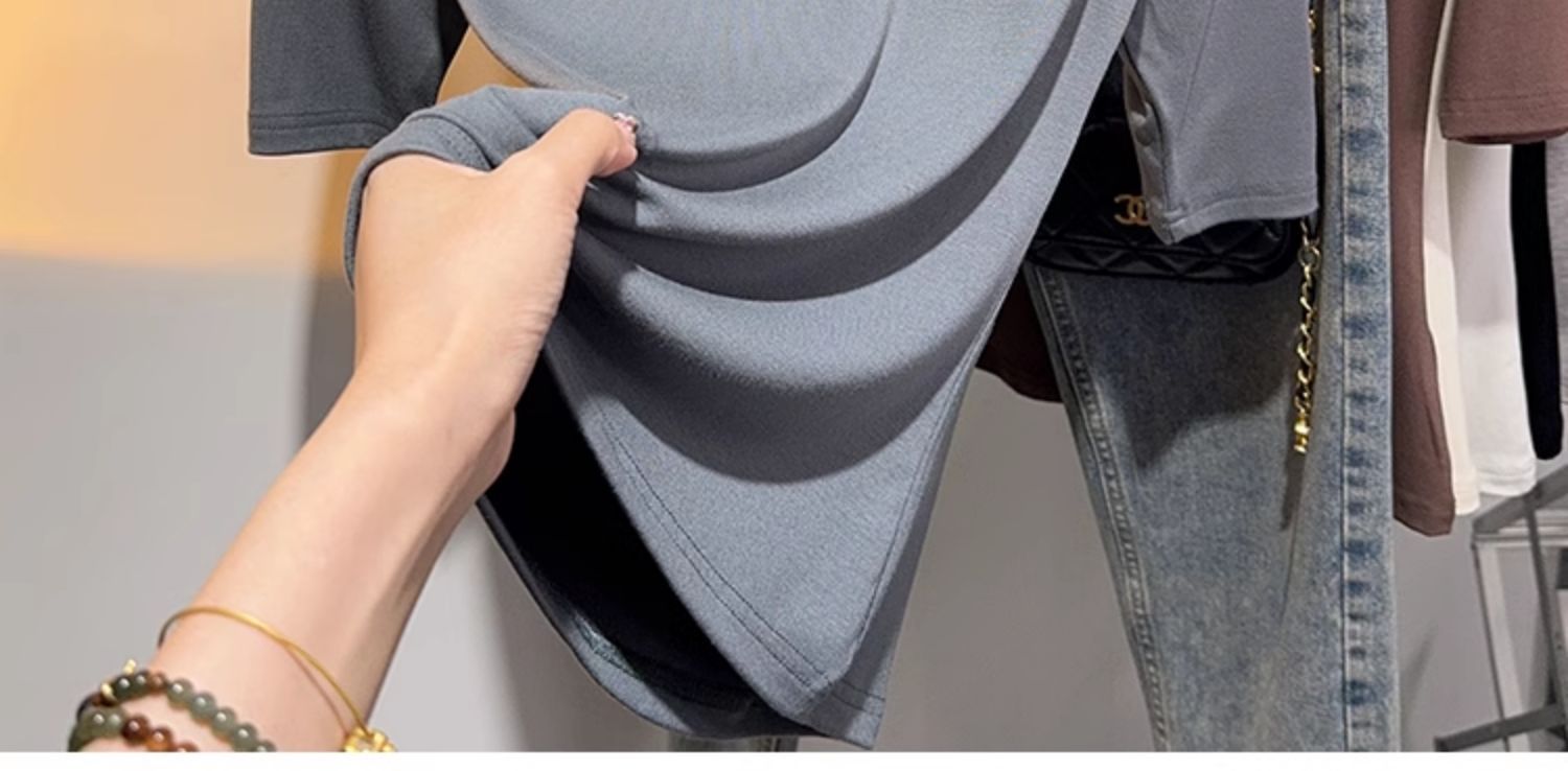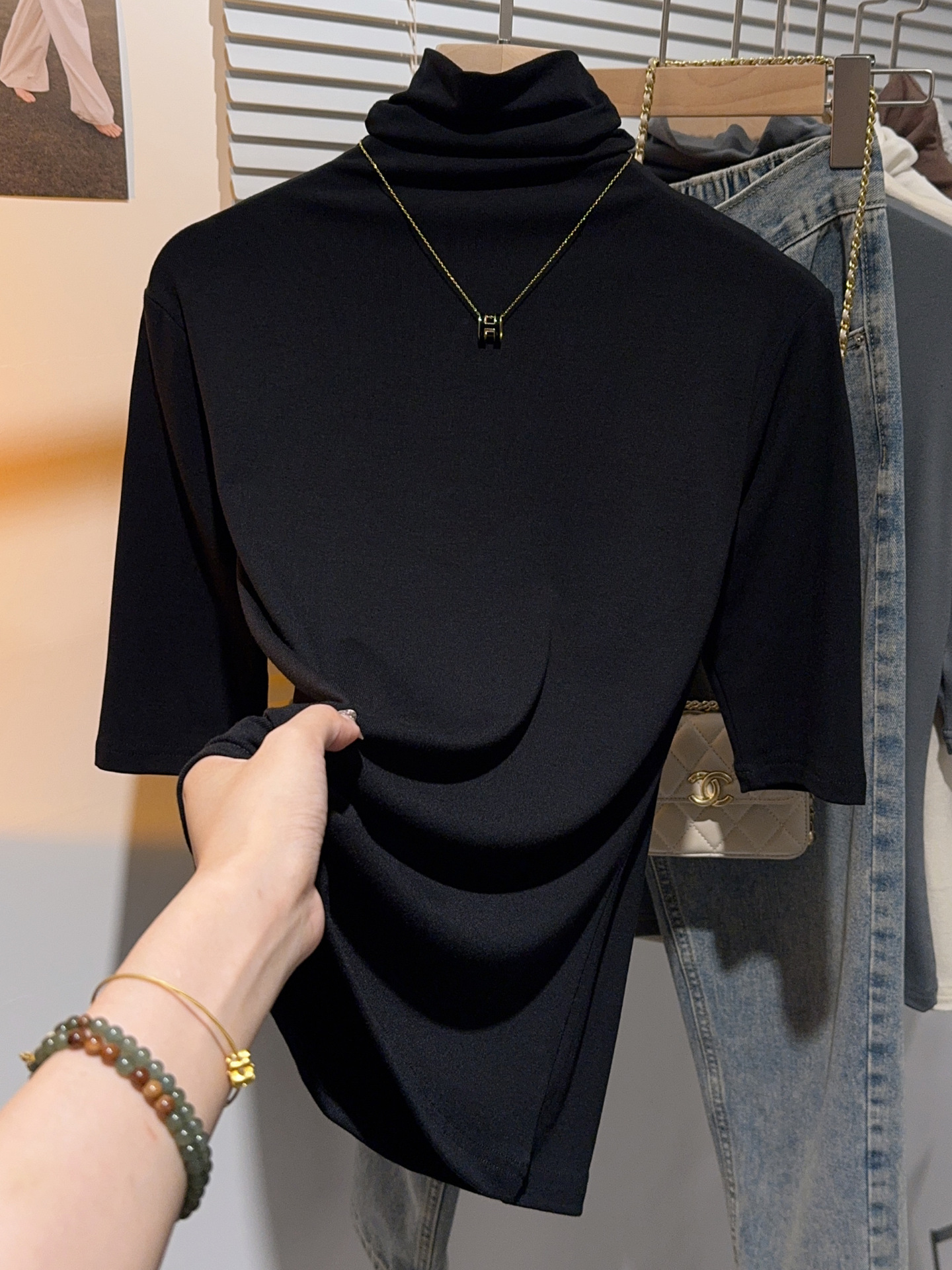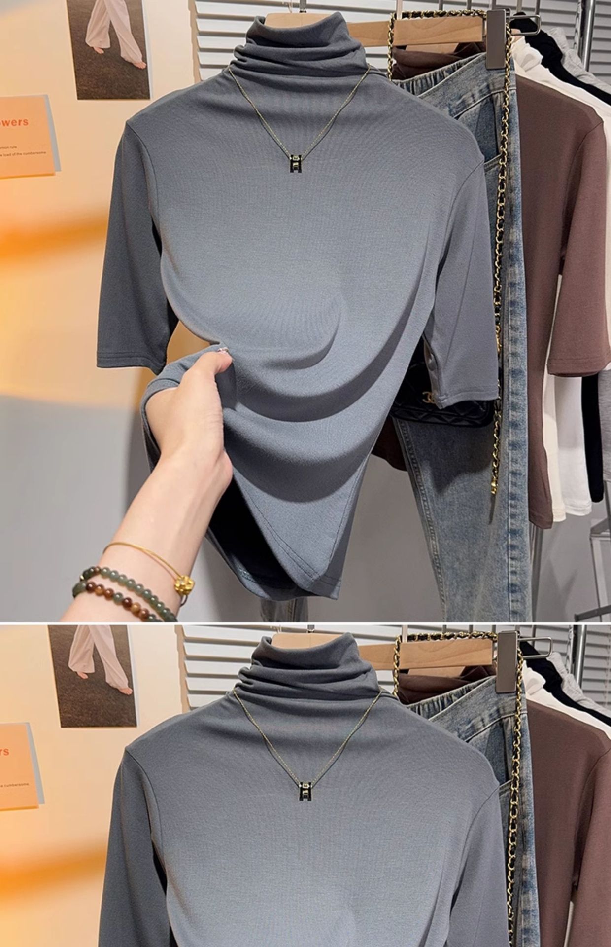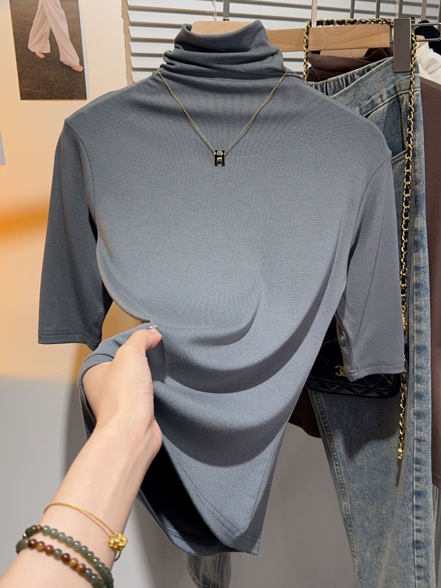 힙 칼라 미드 슬리브 티셔츠 여성의 2024 새로운 스타일 웨스턴 스타일 슬림 하프 핏 슬리브 하이 칼라 탑 하프 슬리브 스레드 베이스 레이어 셔츠