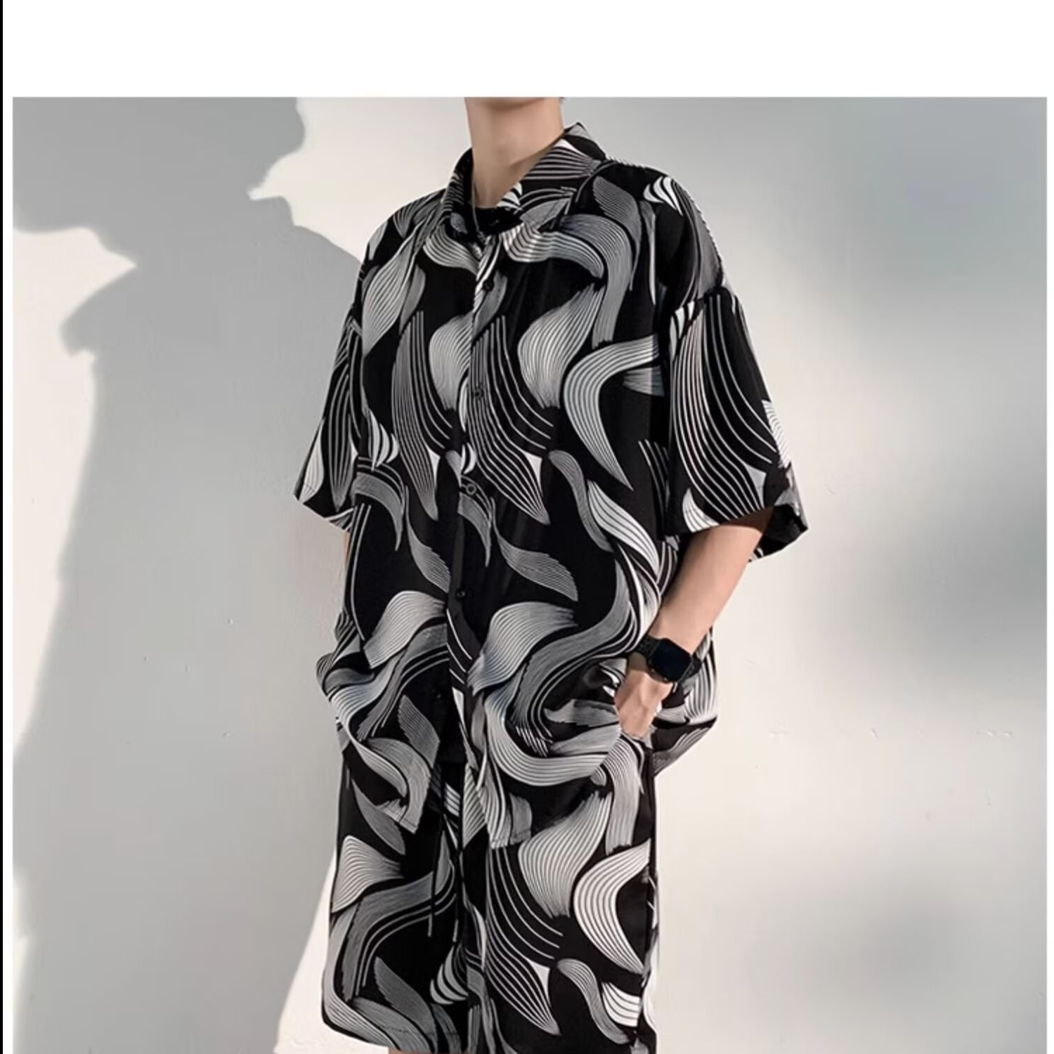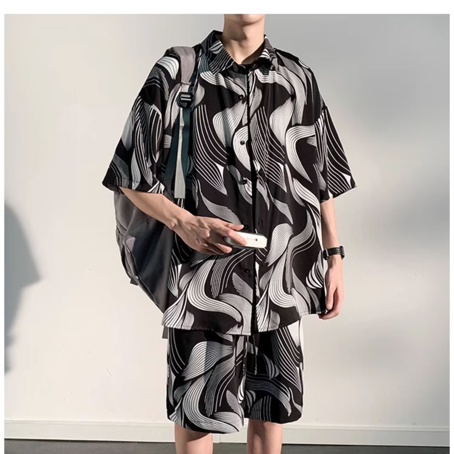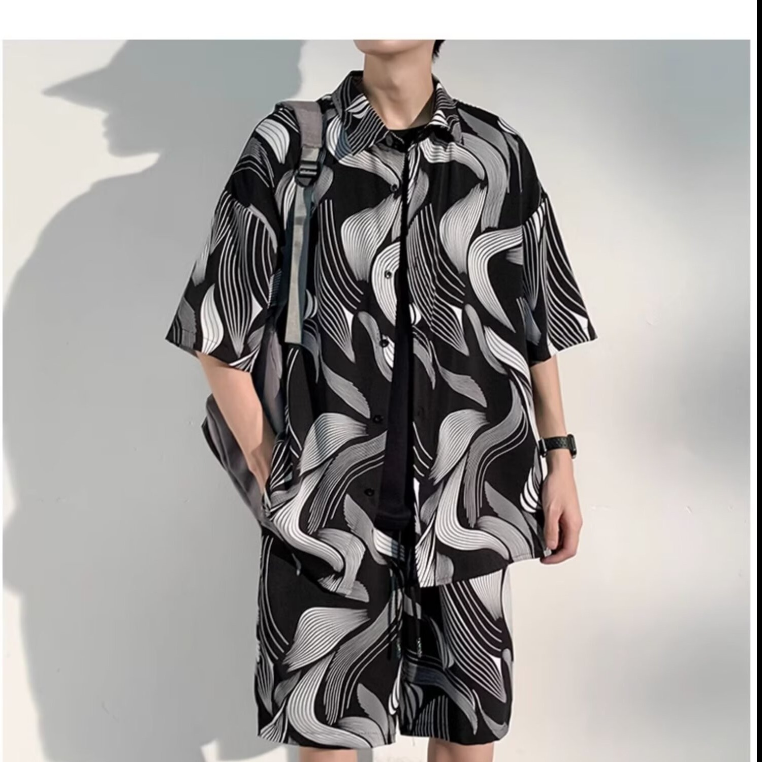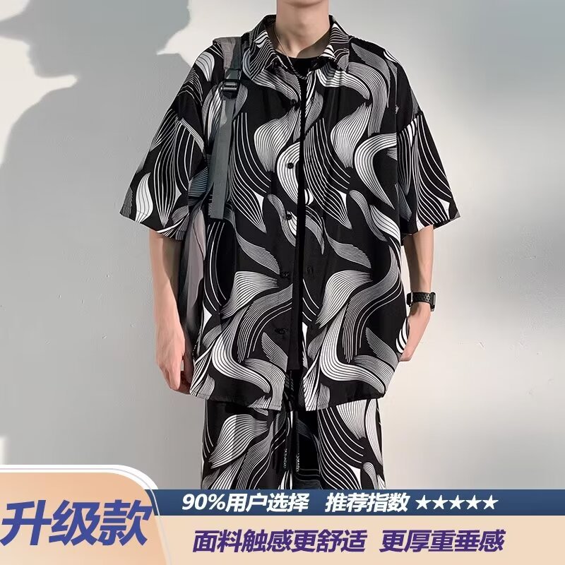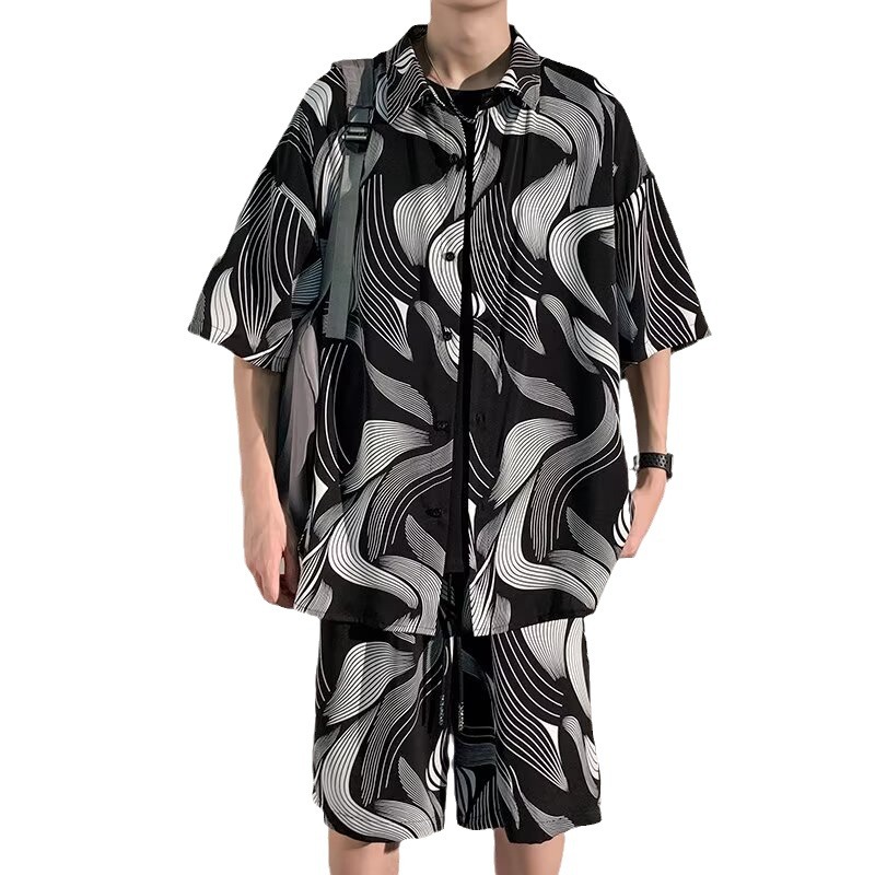 새로운 중국 스타일 국가 스타일 아이스 실크 비치 세트 남성 여름 얇은 느슨한 플러스 사이즈 셔츠 반바지 여름 의류
