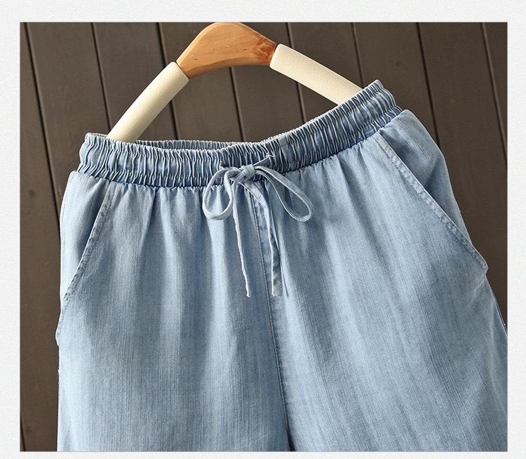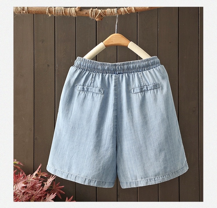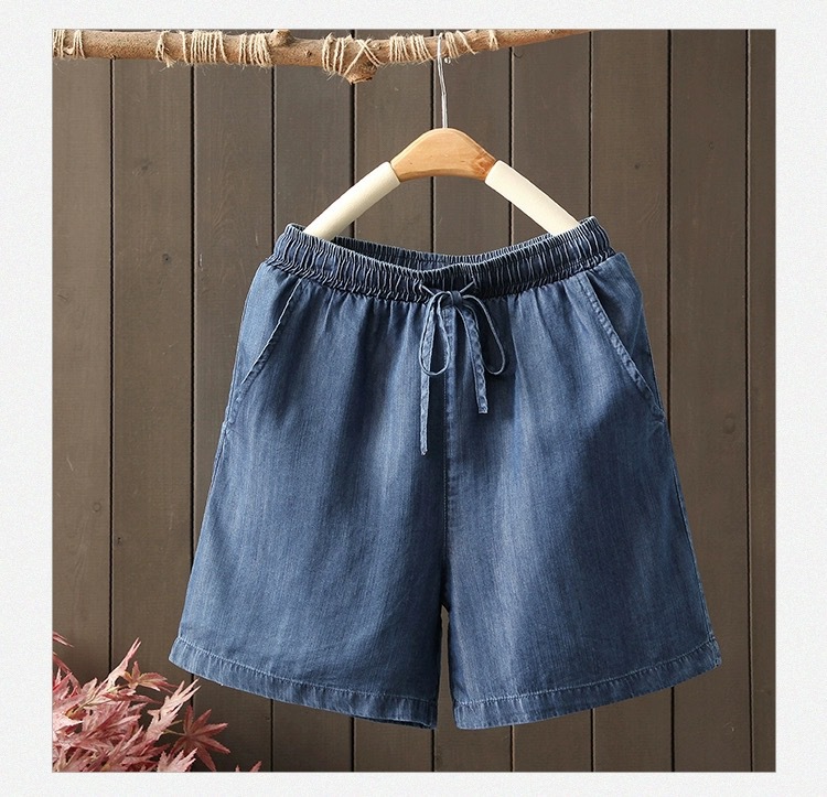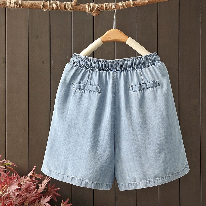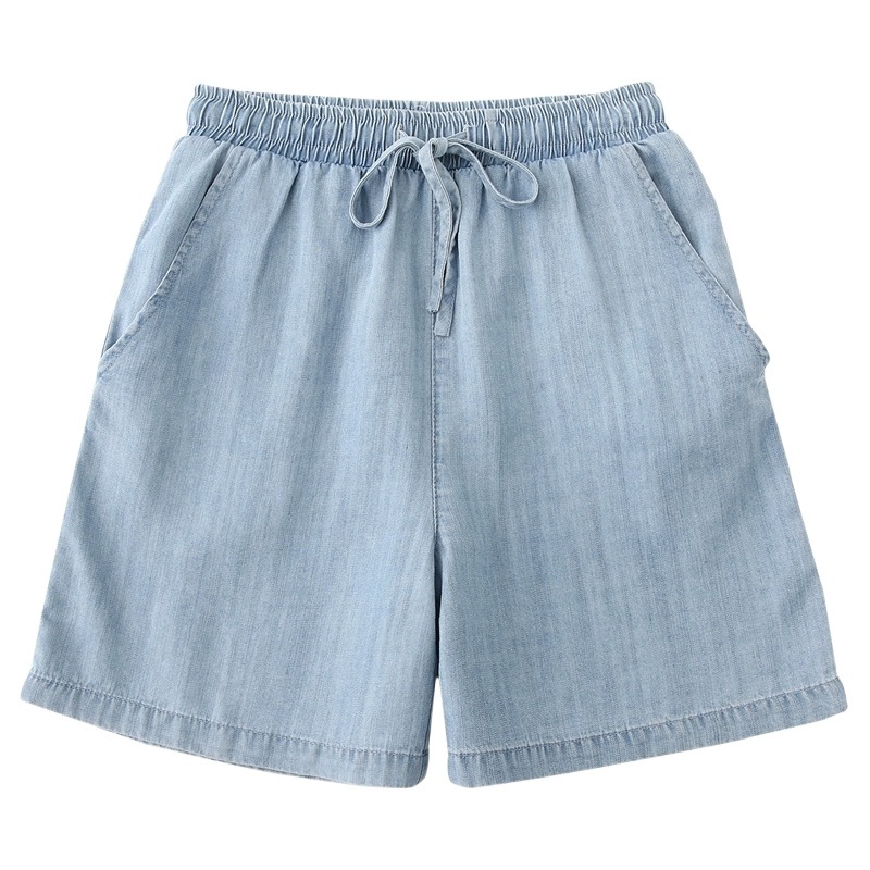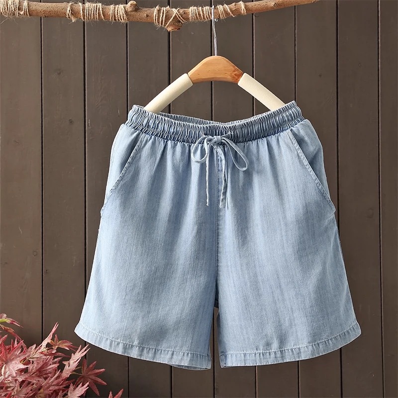 2026 여름 얇은 텐셀 데님 반바지 여성용 신축성 허리끈 루즈핏 캐주얼 와이드 레그 블루 5부 데님 팬츠