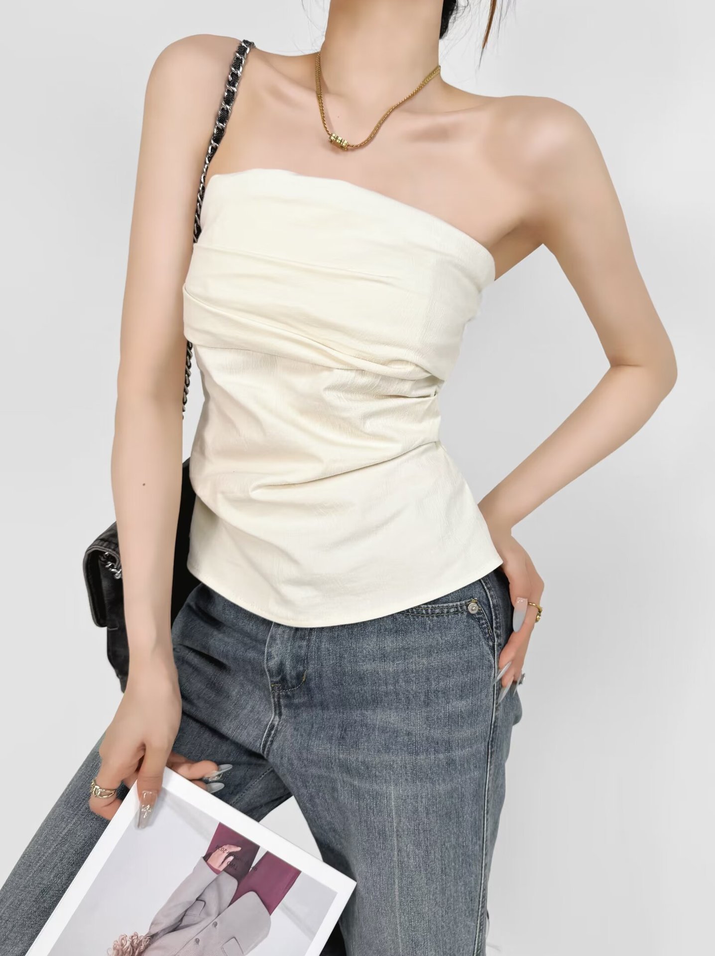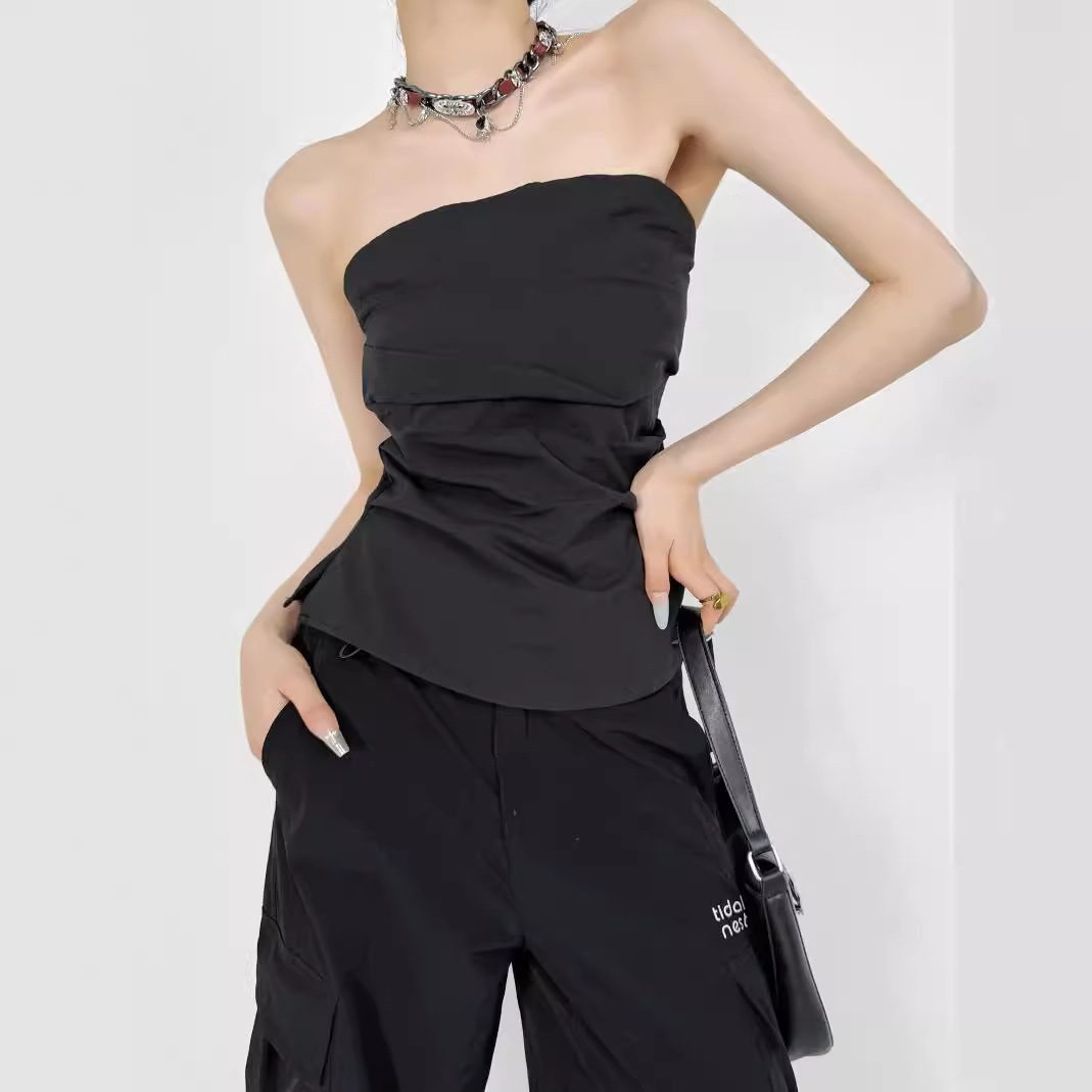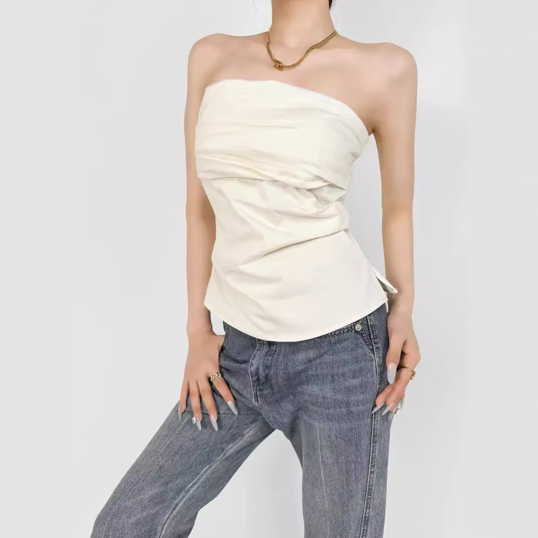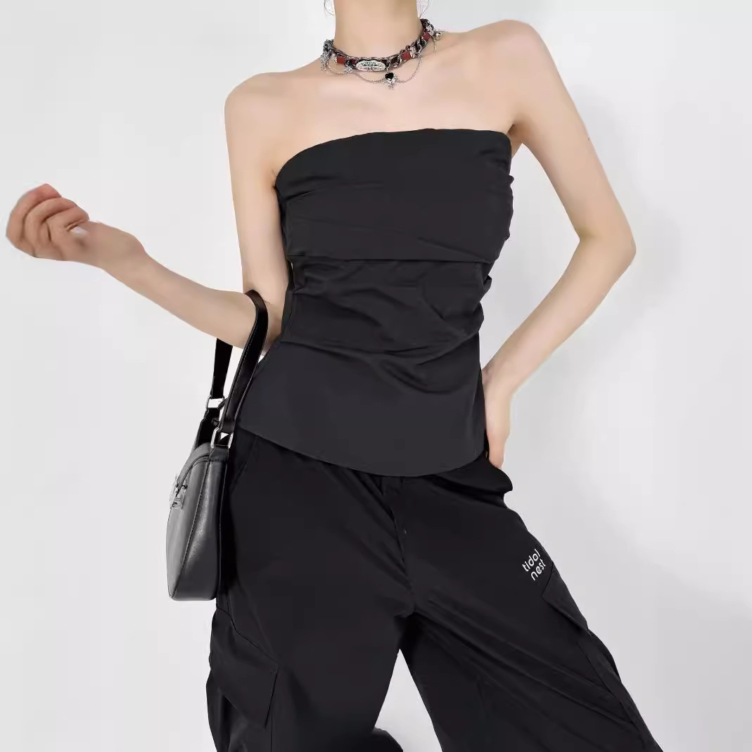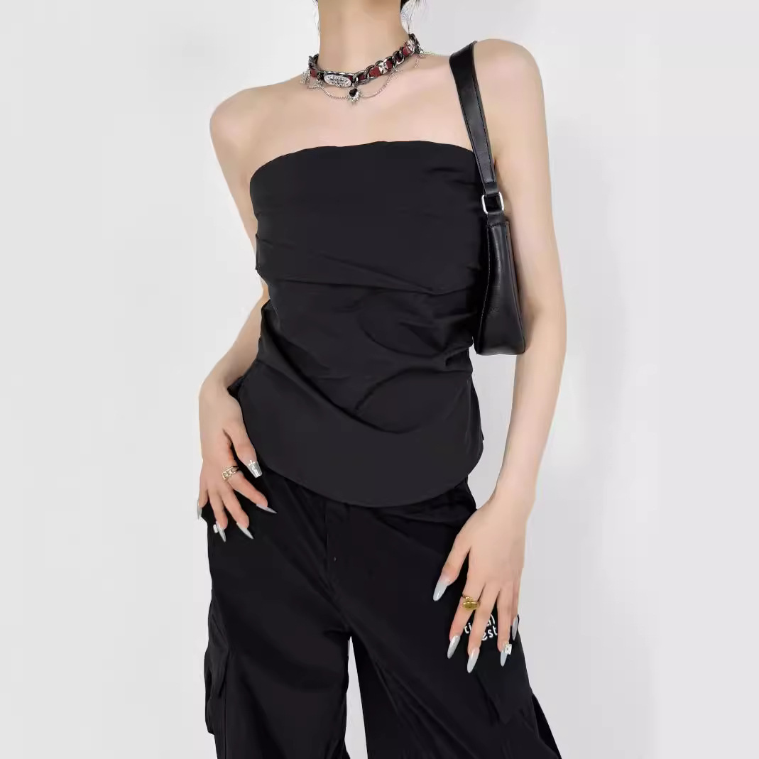 디자인 센스 어깨 주름 튜브 탑 여름 새로운 스타일 순수한 욕망 휴가 조끼 슬림 핏 슬리밍 스파이스 소녀 탑 여성