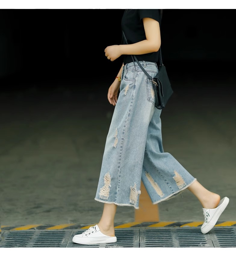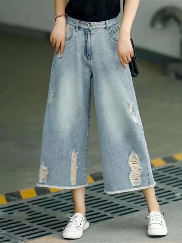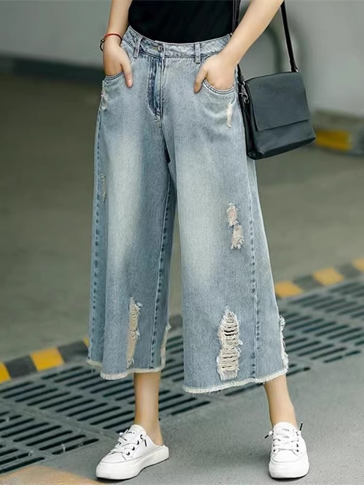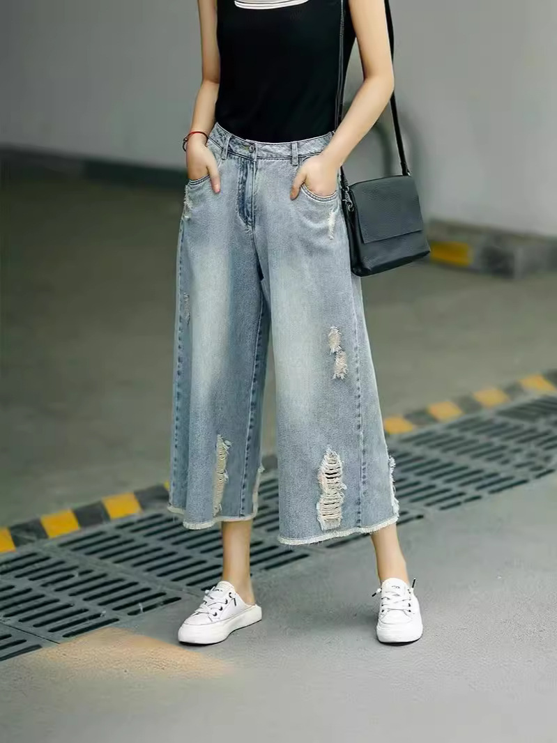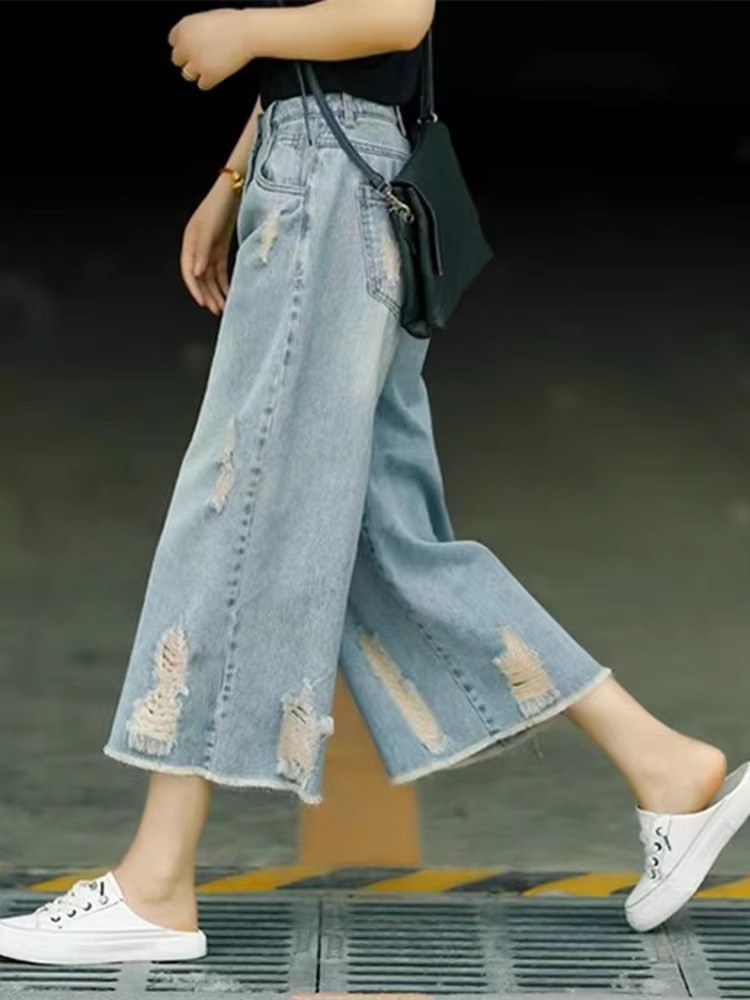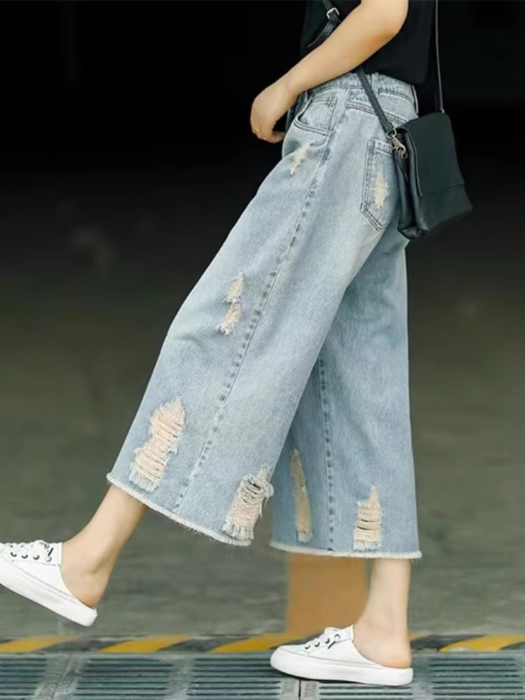 빈티지 드레스 찢어진 청바지 여성용 여름 얇은 높은 허리 느슨한 넓은 다리 바지 여성용 짧은 자른 캐주얼 바지