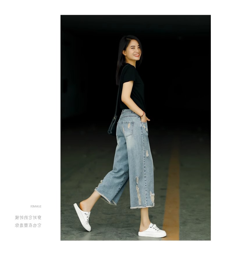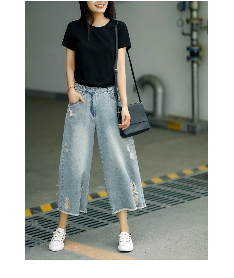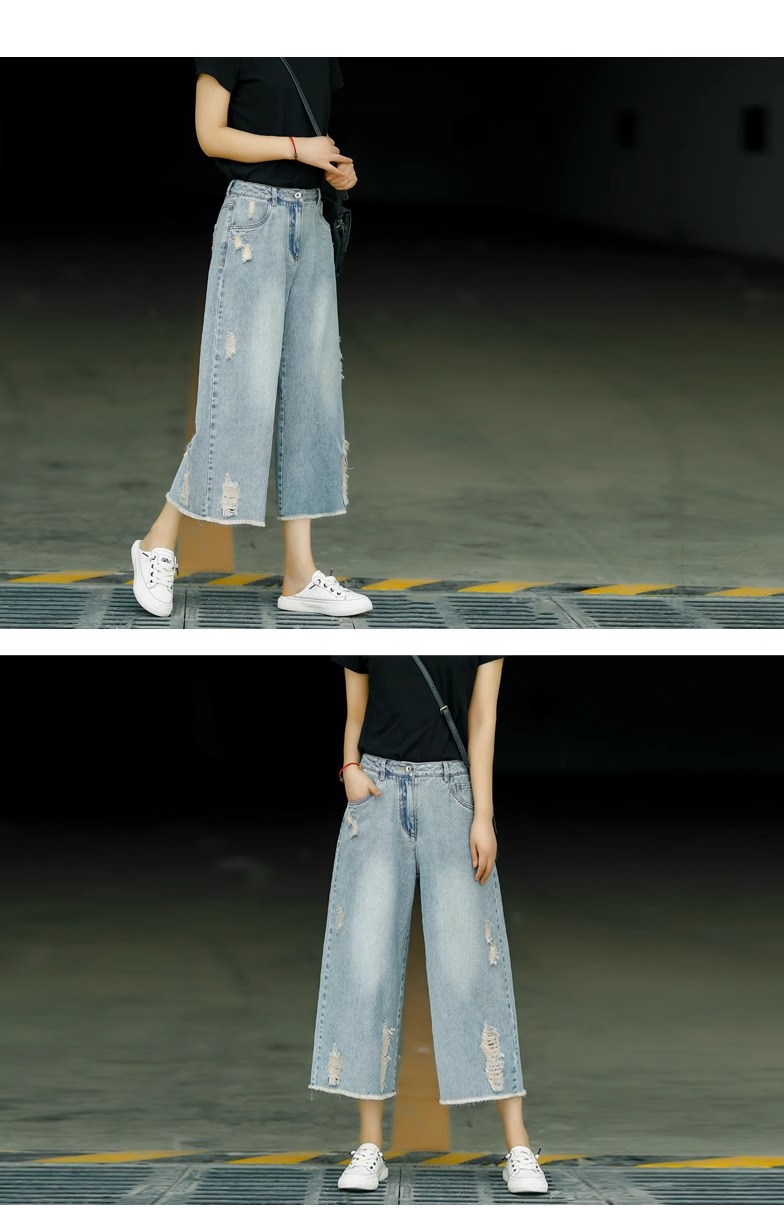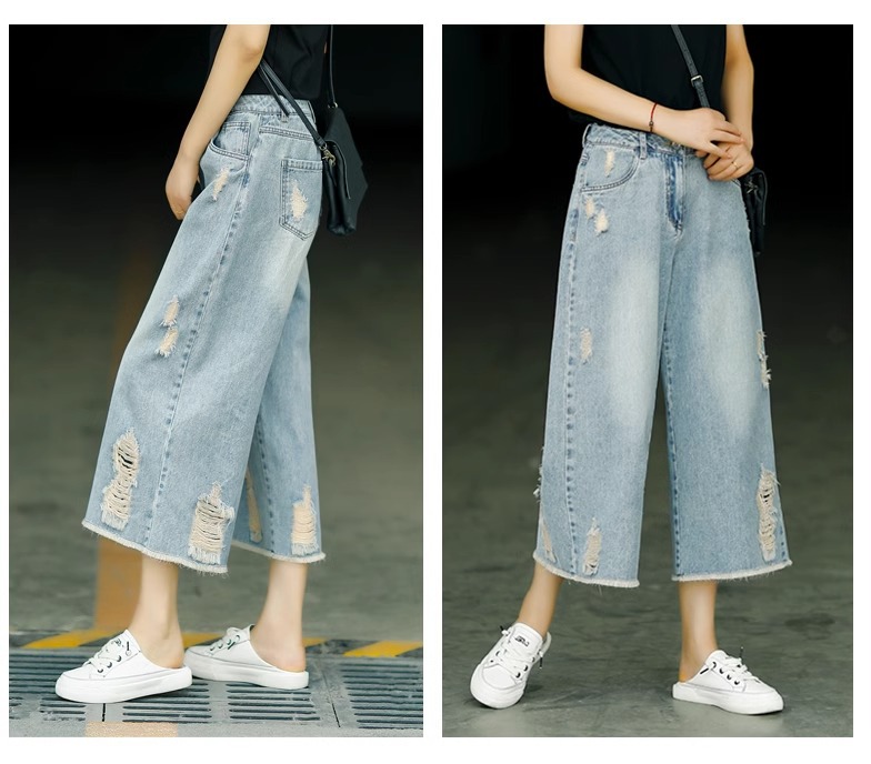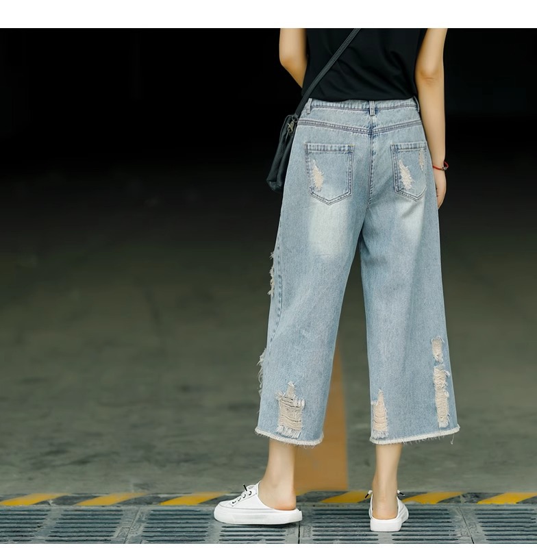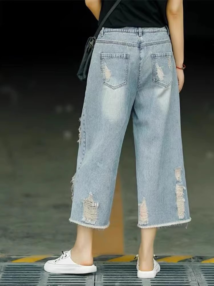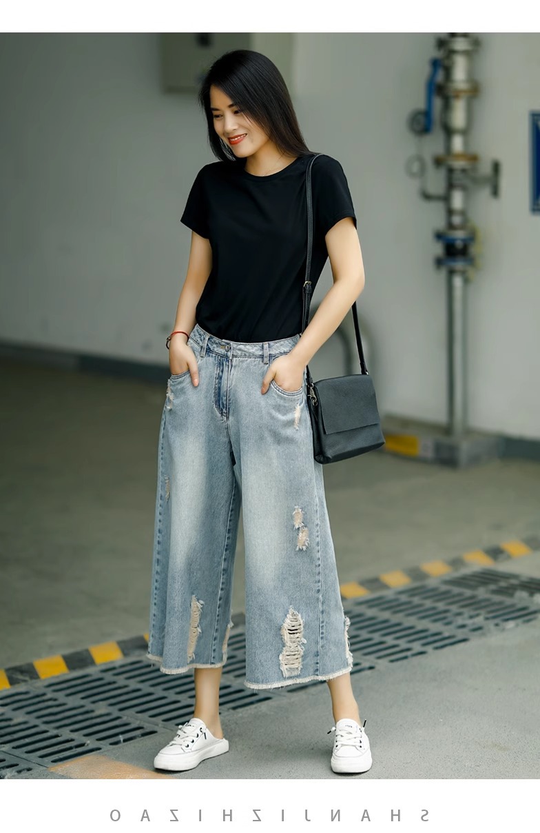 빈티지 드레스 찢어진 청바지 여성용 여름 얇은 높은 허리 느슨한 넓은 다리 바지 여성용 짧은 자른 캐주얼 바지