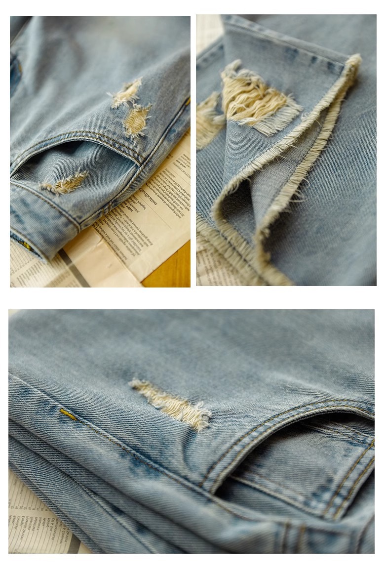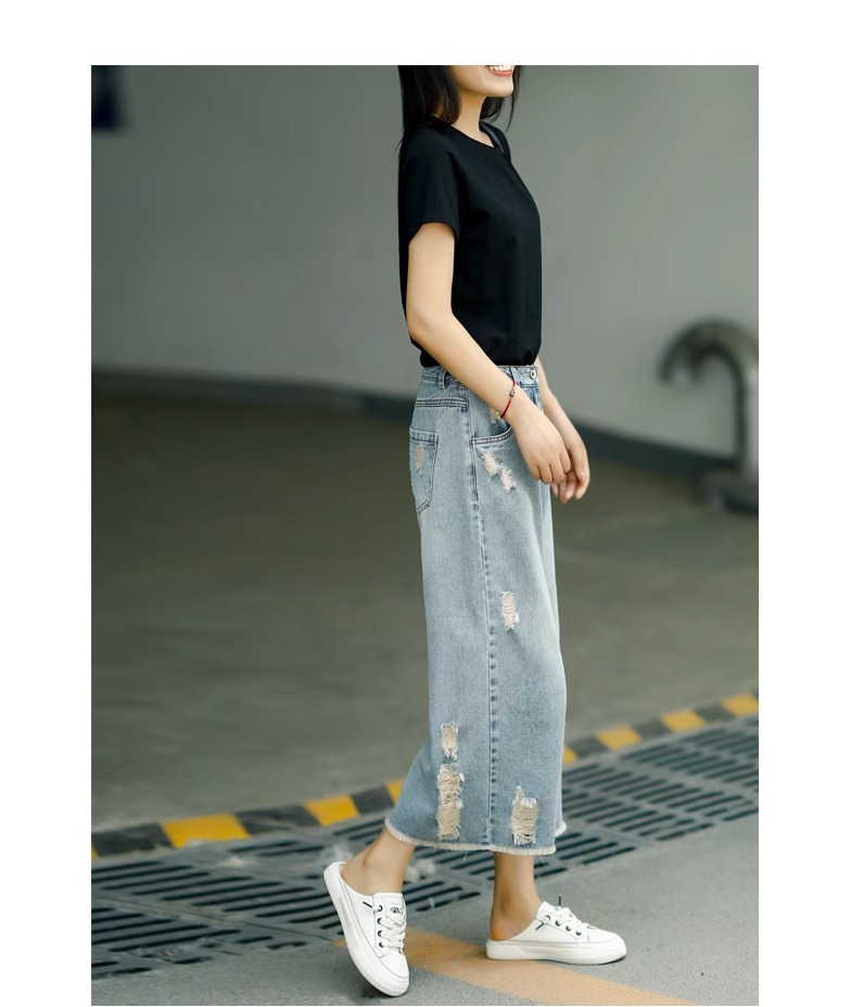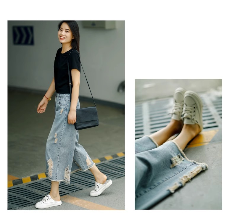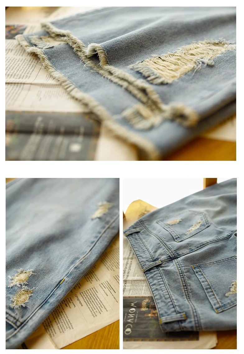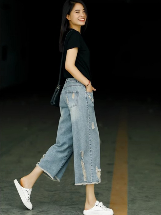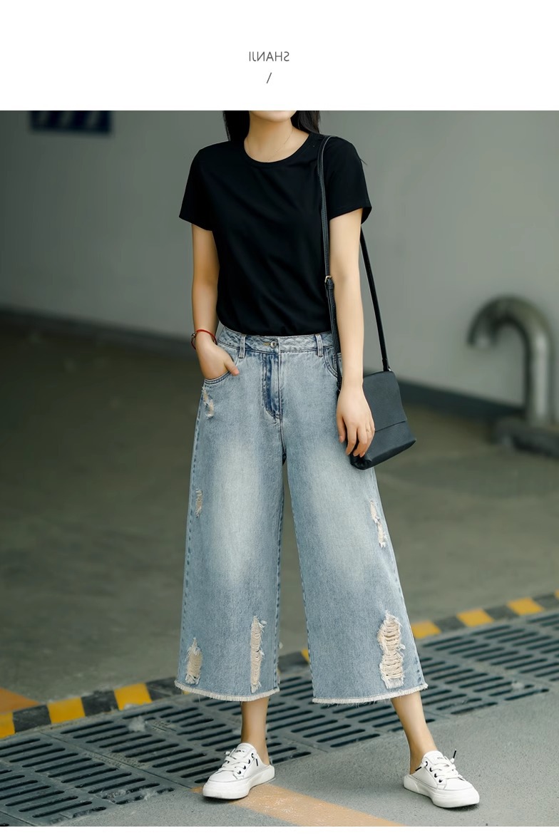 빈티지 드레스 찢어진 청바지 여성용 여름 얇은 높은 허리 느슨한 넓은 다리 바지 여성용 짧은 자른 캐주얼 바지