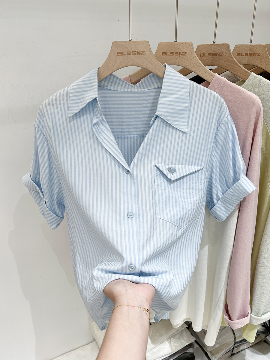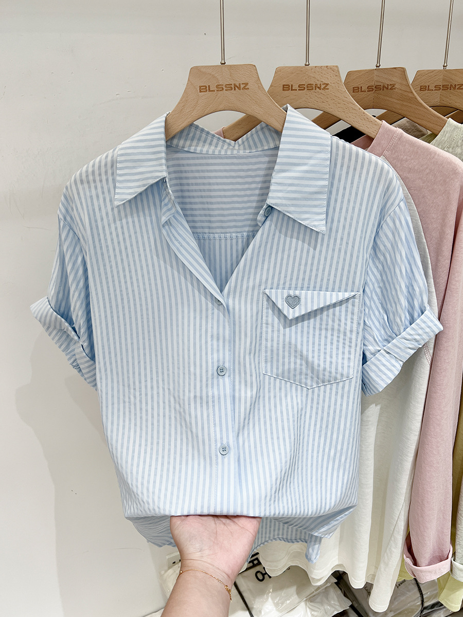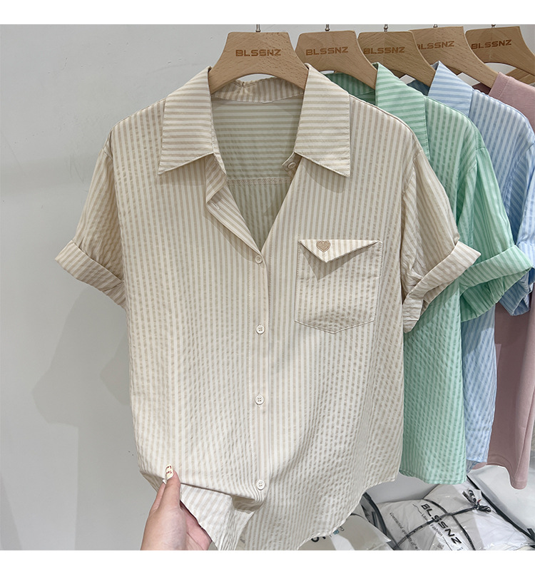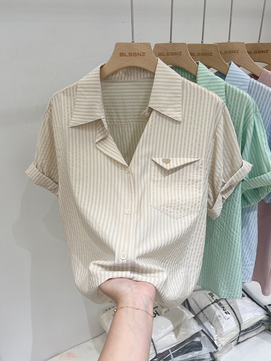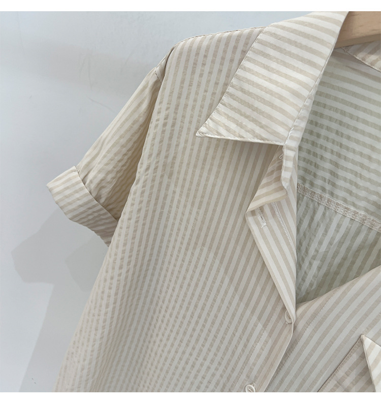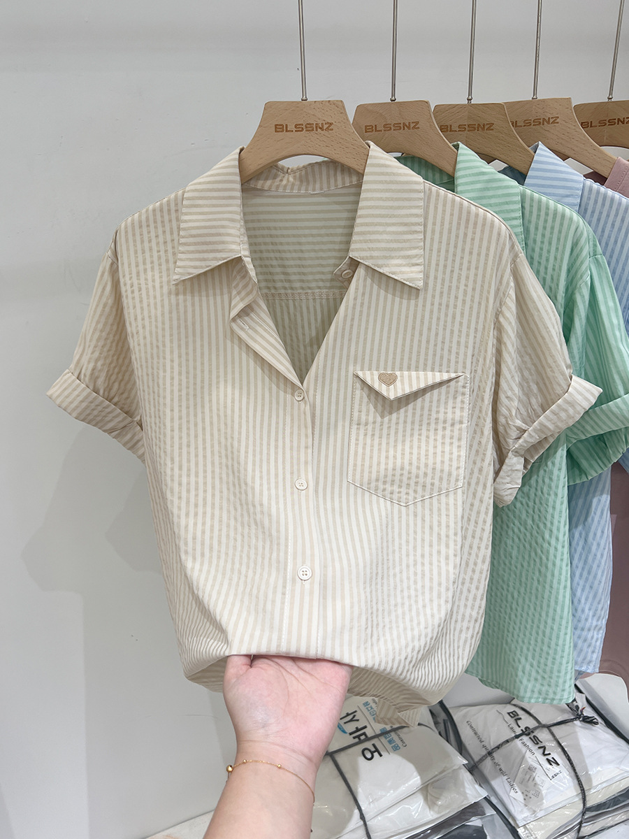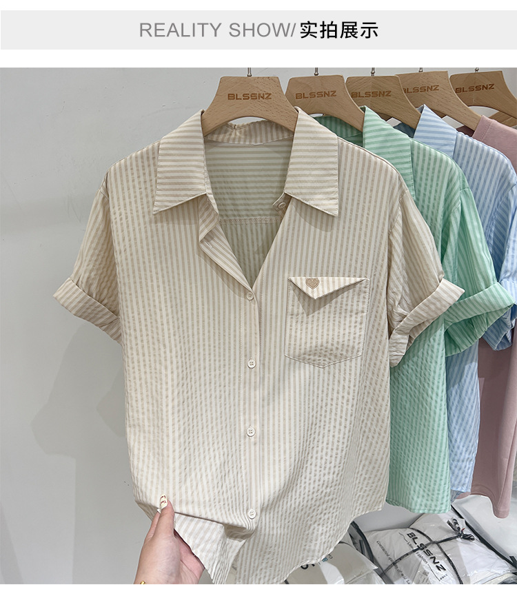 2024 년 여름 여성의 새로운 여성 짧은 소매 셔츠 스트라이프 쉬폰 셔츠 벨리 커버 슬림 셔츠