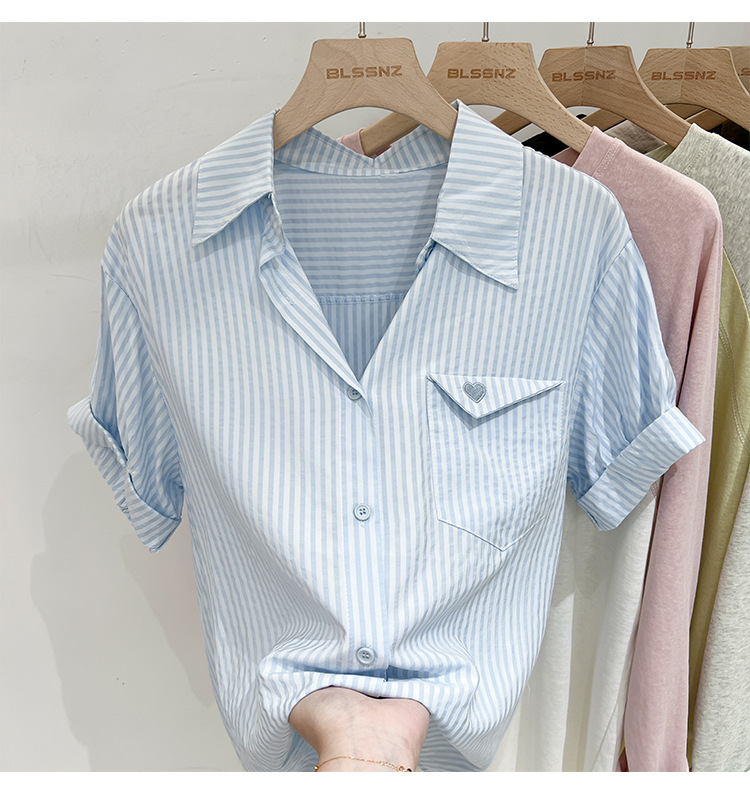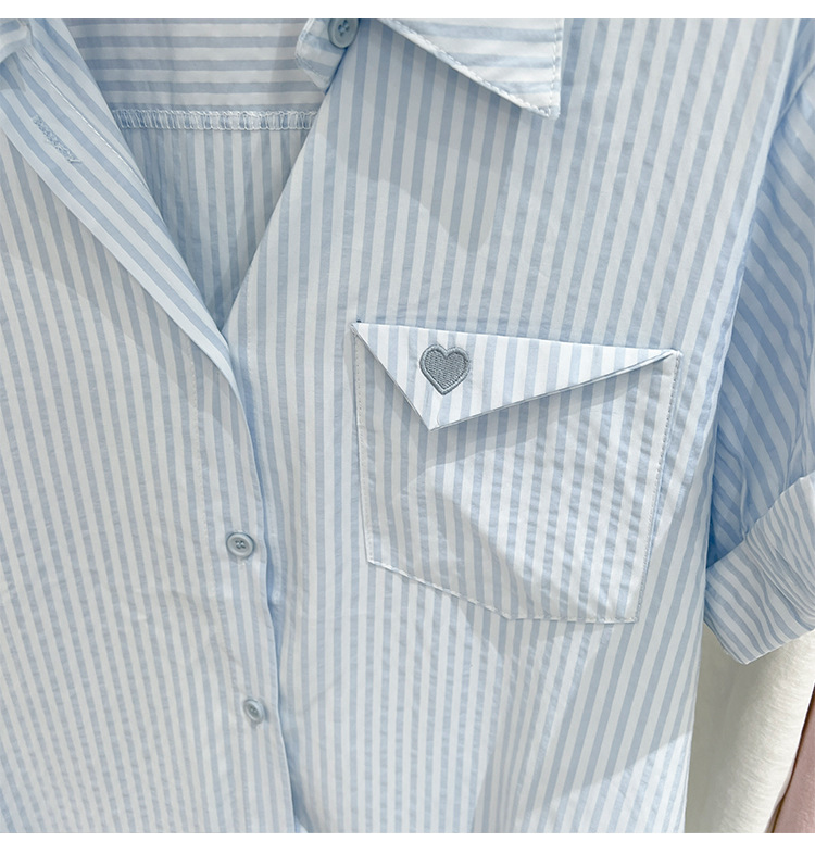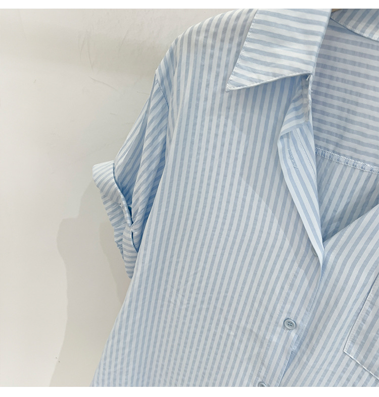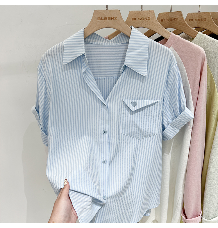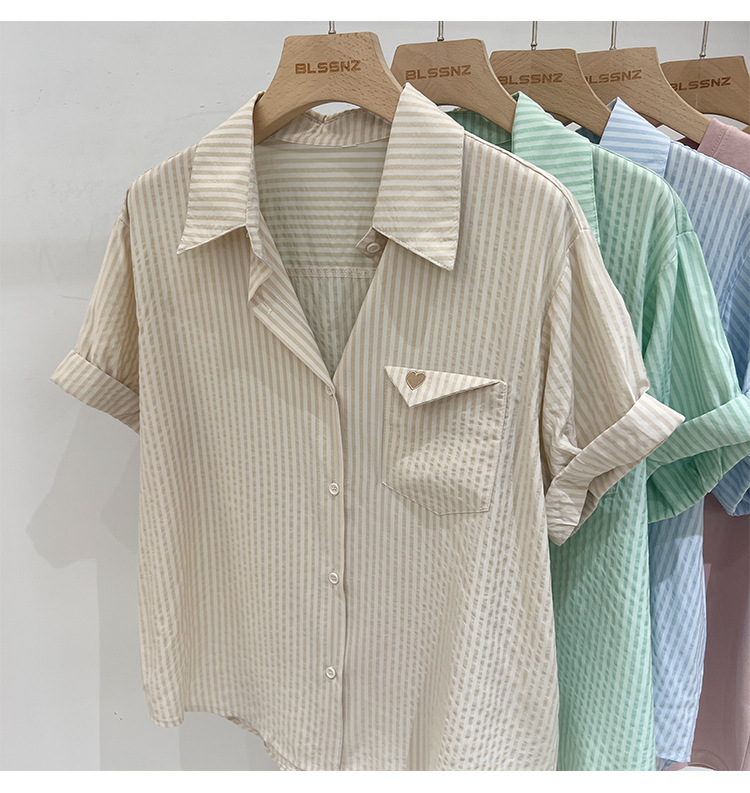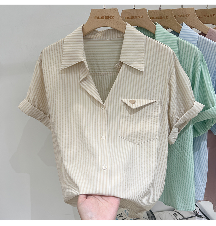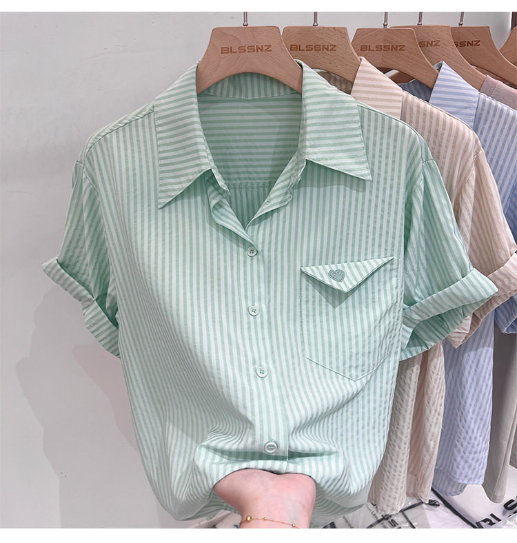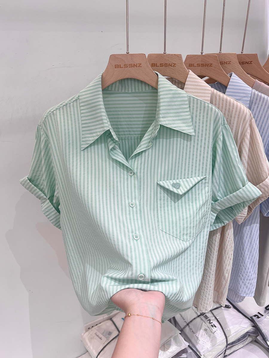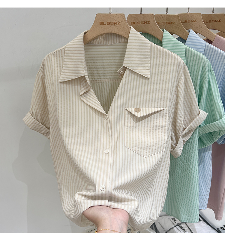 2024 년 여름 여성의 새로운 여성 짧은 소매 셔츠 스트라이프 쉬폰 셔츠 벨리 커버 슬림 셔츠