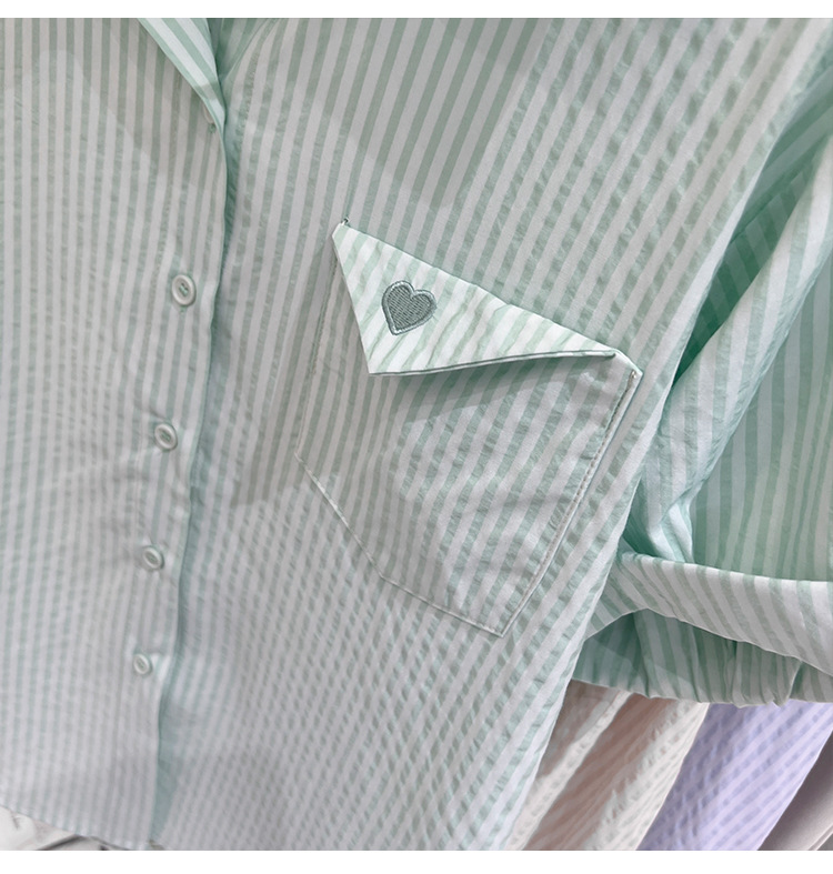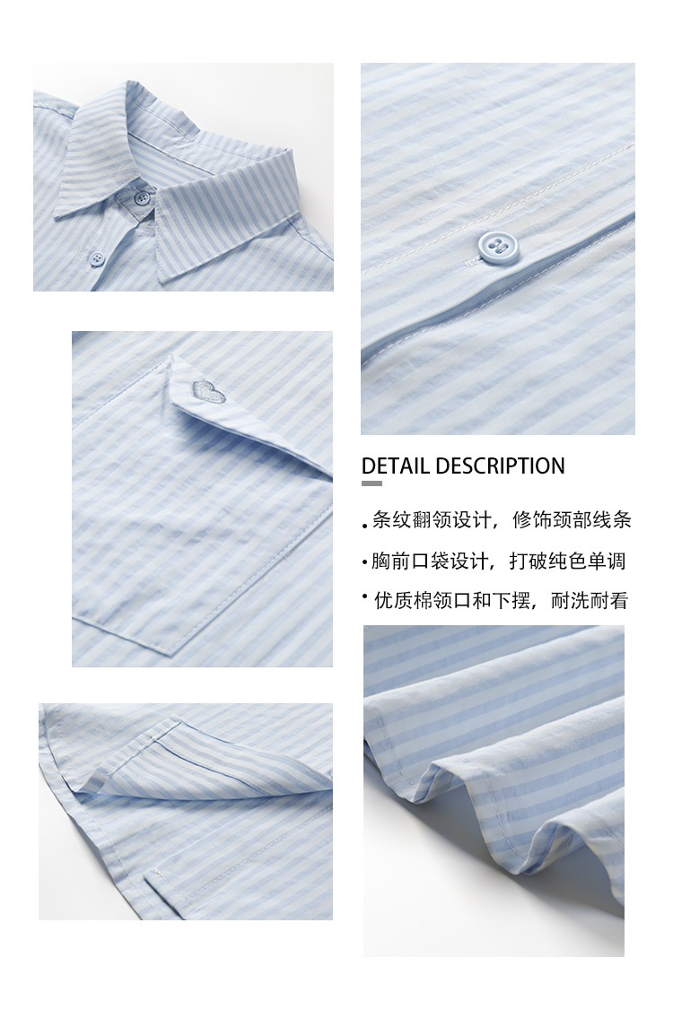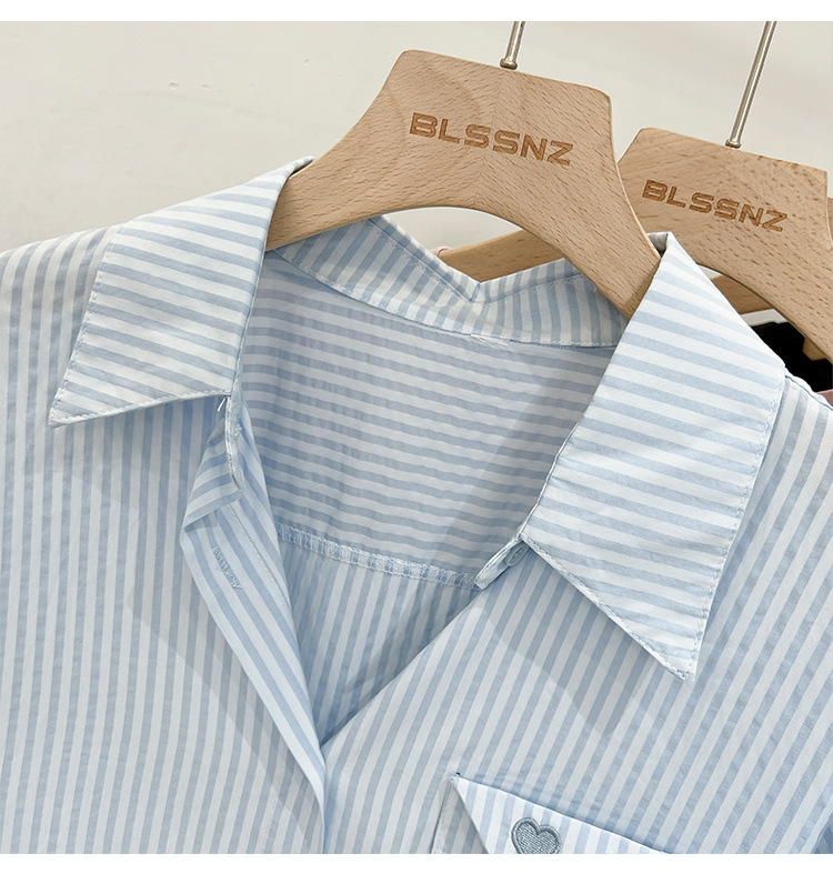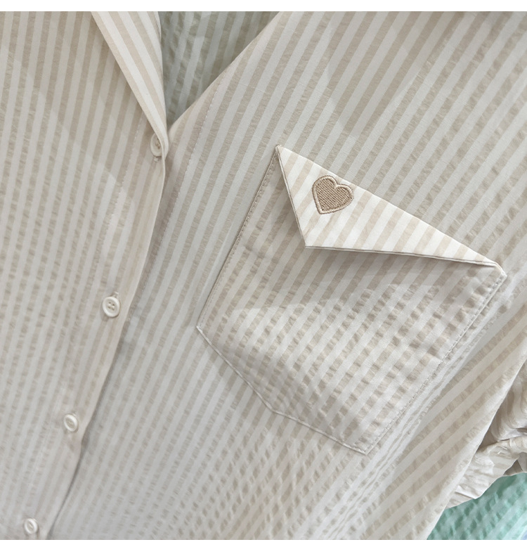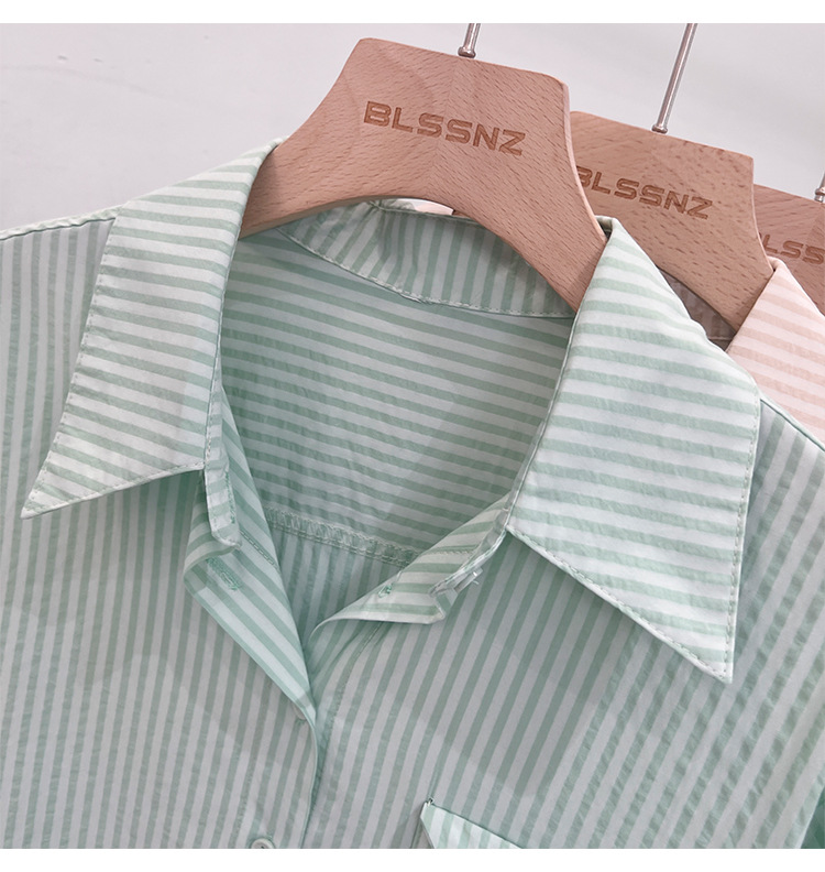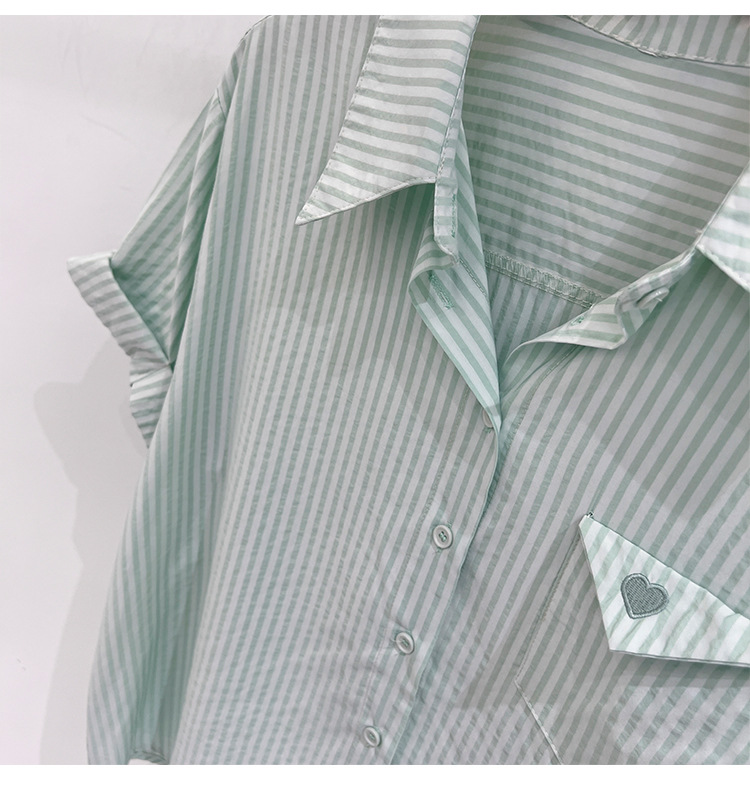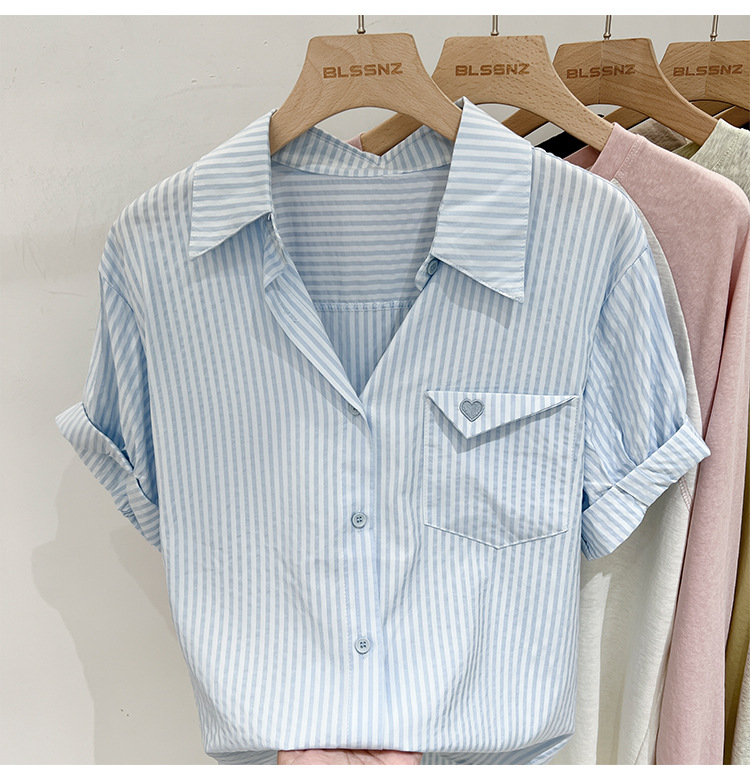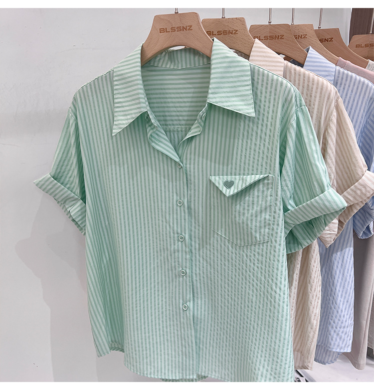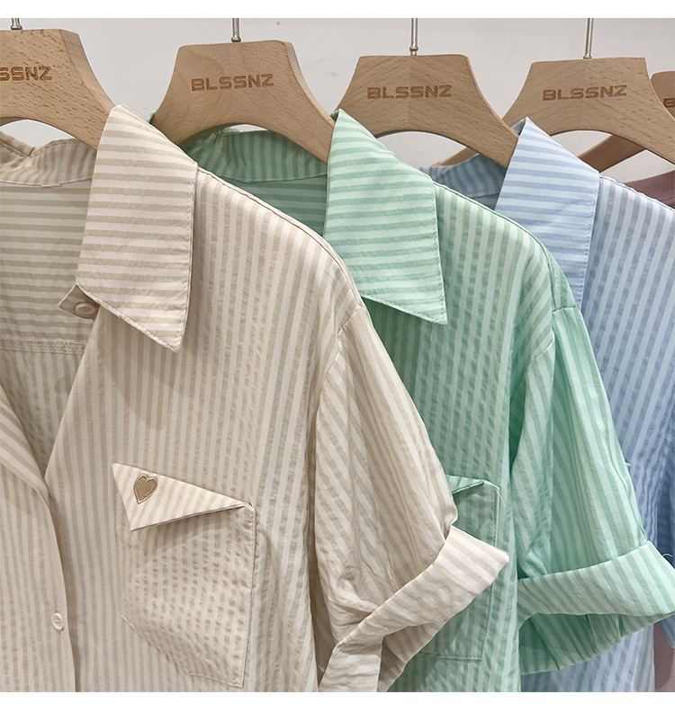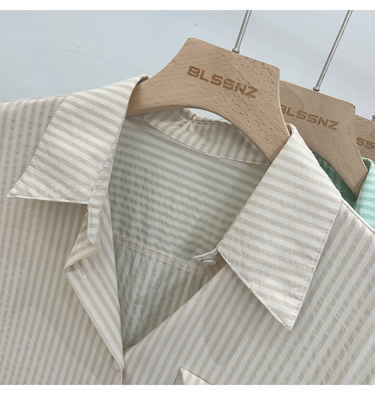 2024 년 여름 여성의 새로운 여성 짧은 소매 셔츠 스트라이프 쉬폰 셔츠 벨리 커버 슬림 셔츠