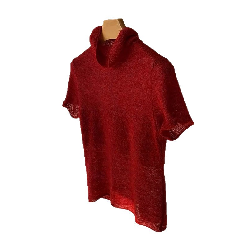 레트로 레드 휴일풍 셔츠, 트렌디한 반팔, 하프넥, 슬림핏, 어깨라인이 잘 잡힌 니트 이너웨어 여성용