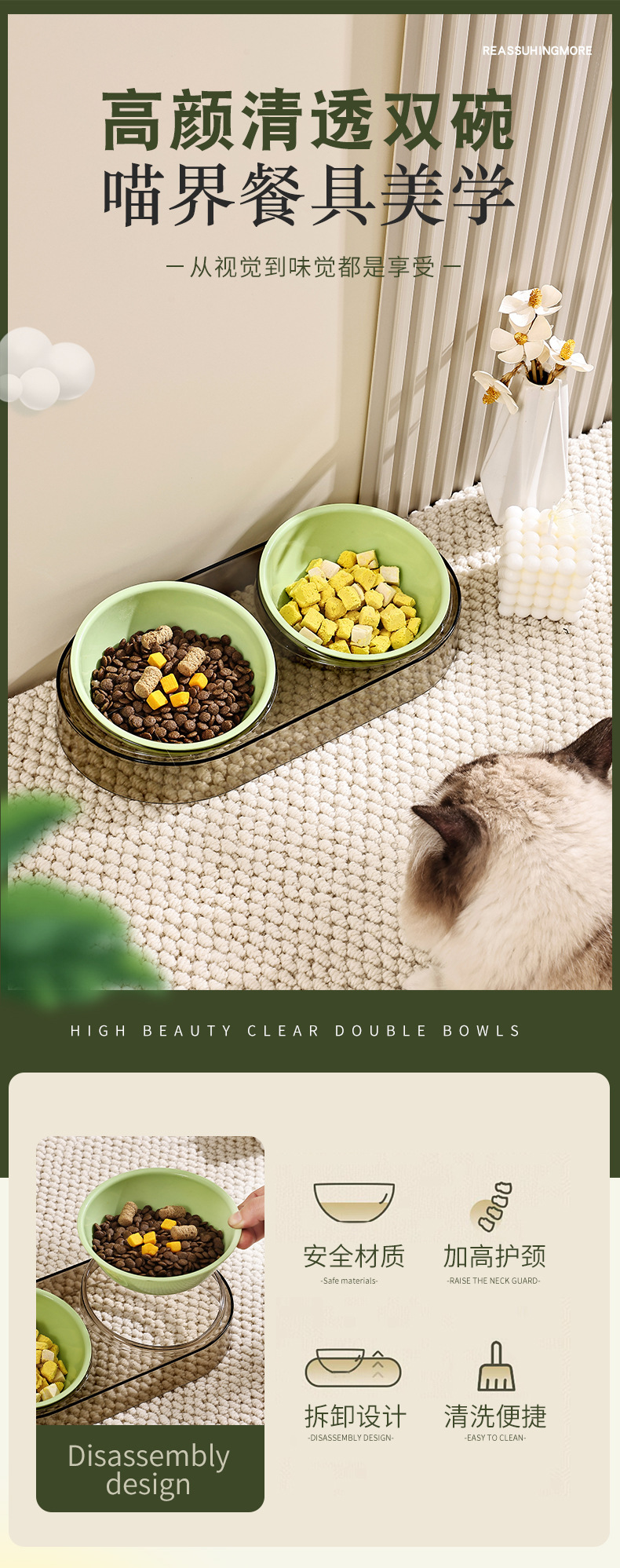 새로운 투명한 인스 스타일 애완동물 목 보호 이중 그릇 마카롱 색상 음수 및 급식 일체형 제품 라이트 럭셔리 고양이 그릇