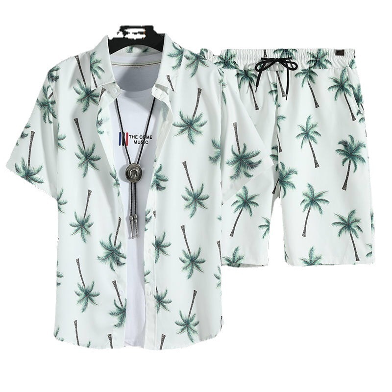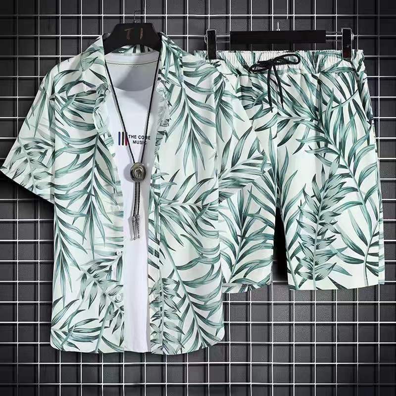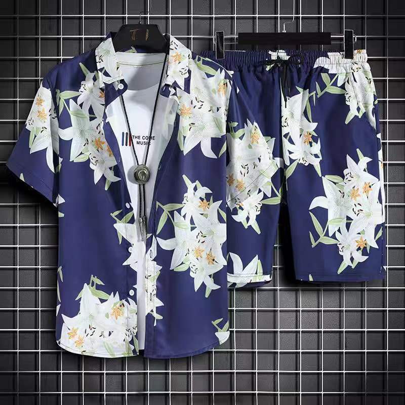 태국 여름 남자의 새로운 얇은 느슨한 세트 하와이 꽃 인쇄 해변 짧은 소매 세트 트렌디
