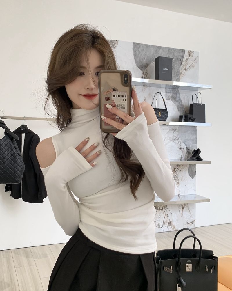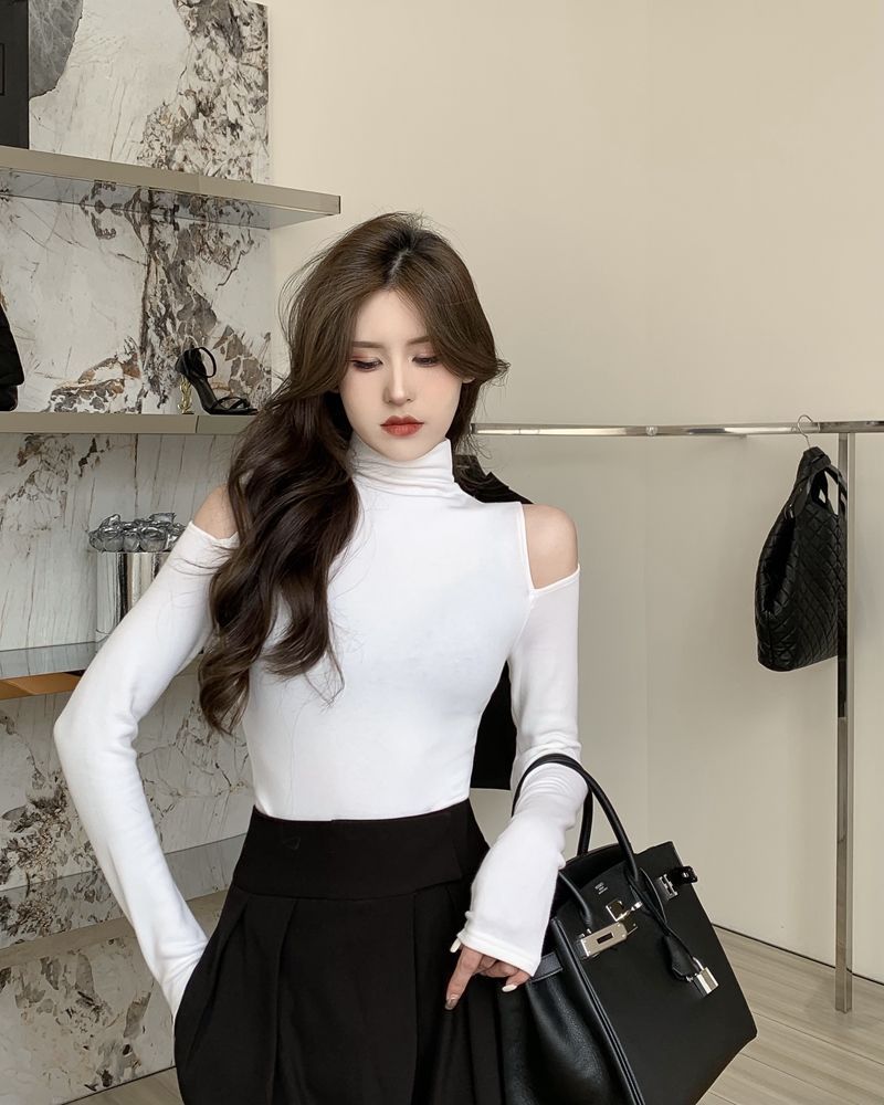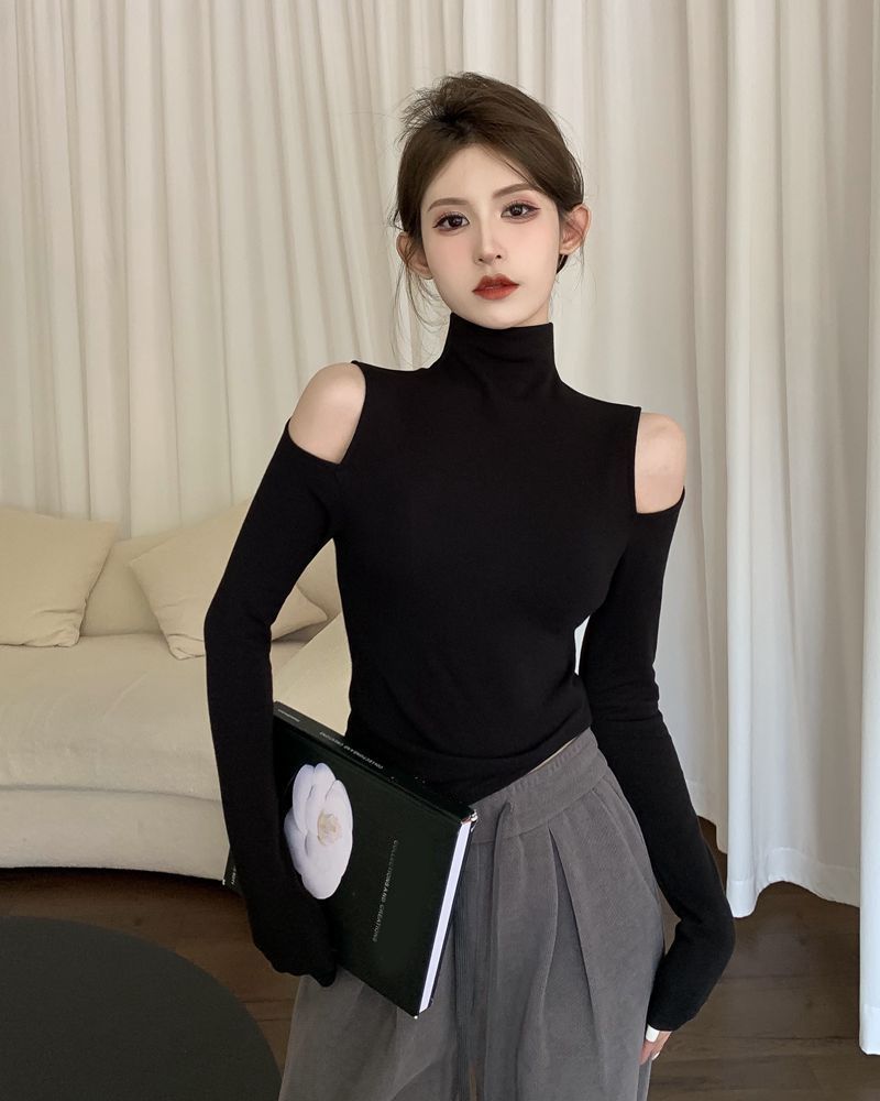 D2026 # 가을 새로운 외국 스타일 높은 목 백킹 셔츠 여성용 긴 소매 티셔츠 달콤하고 매운 어깨 디자인 센스 순수 패션