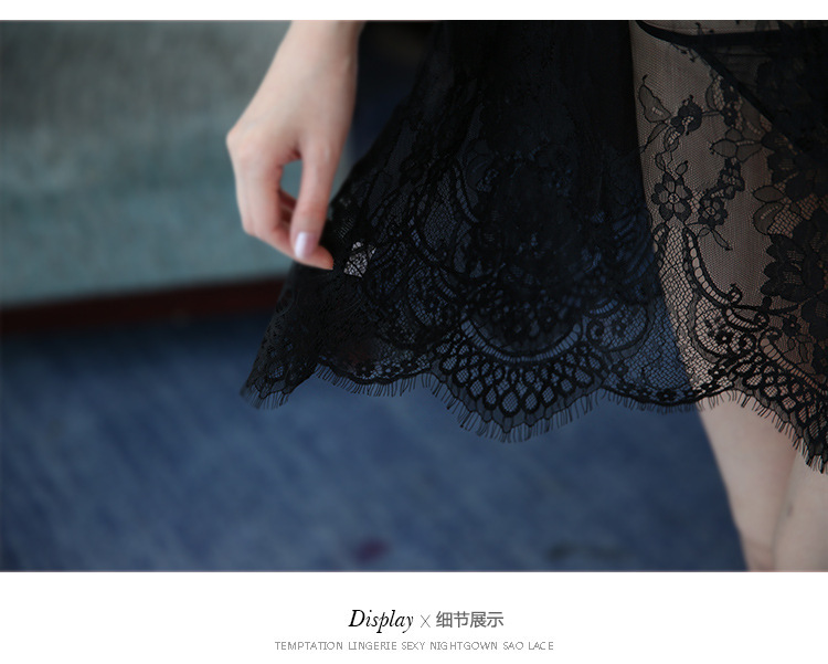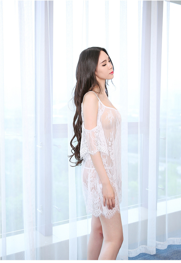 스트랩 어깨 관점 메쉬 속눈썹 레이스 나이트 가운 T-팬츠 라운드 넥 란제리 여성 섹시한 성인 제품