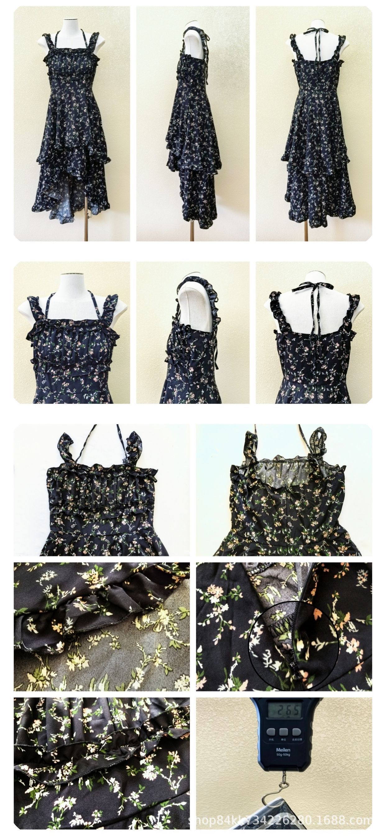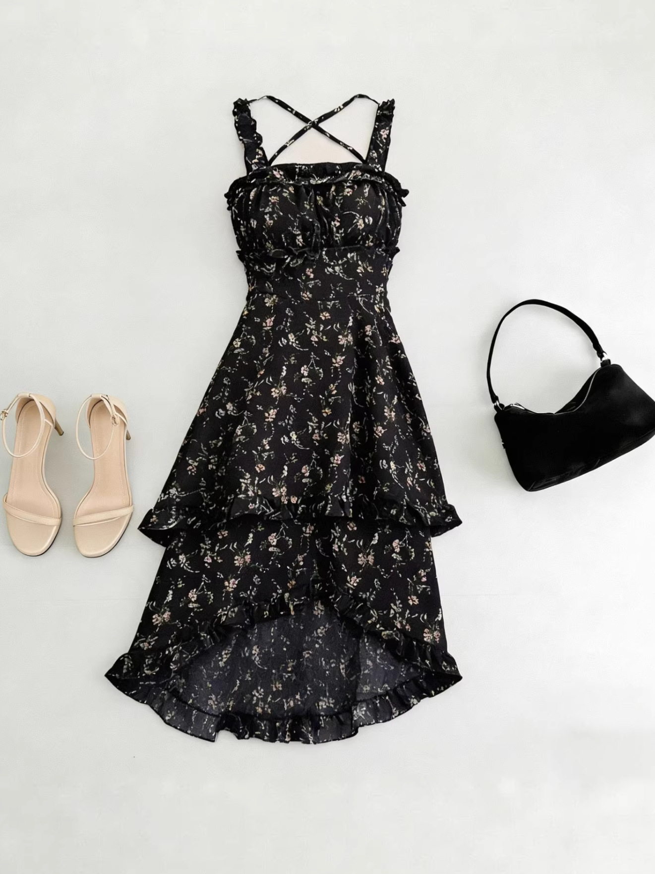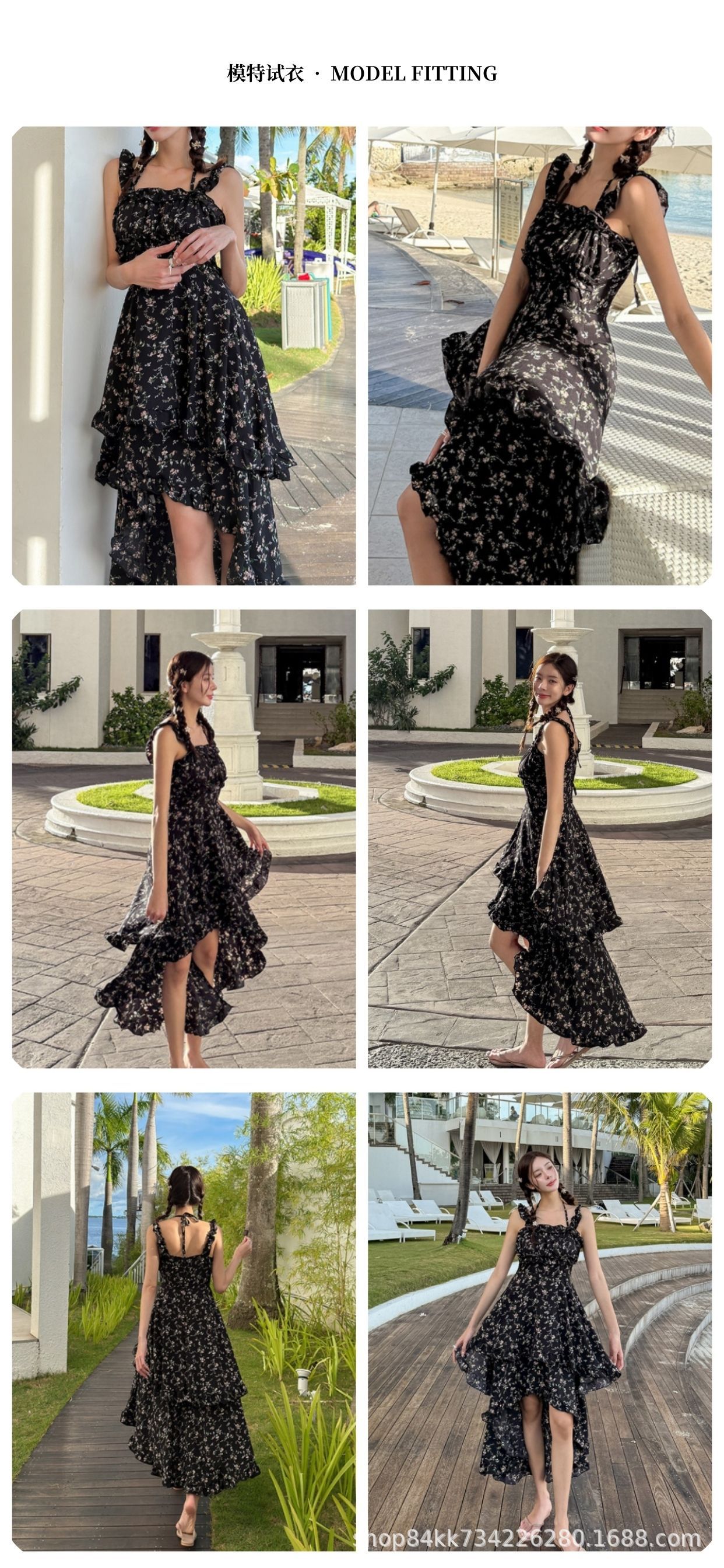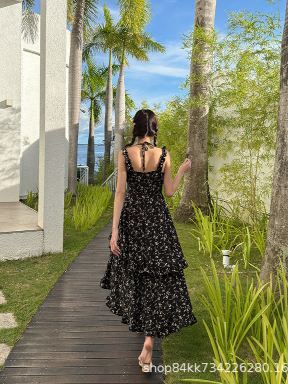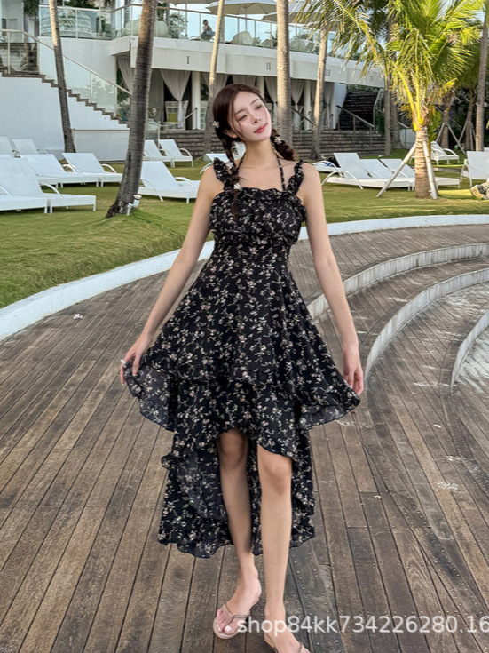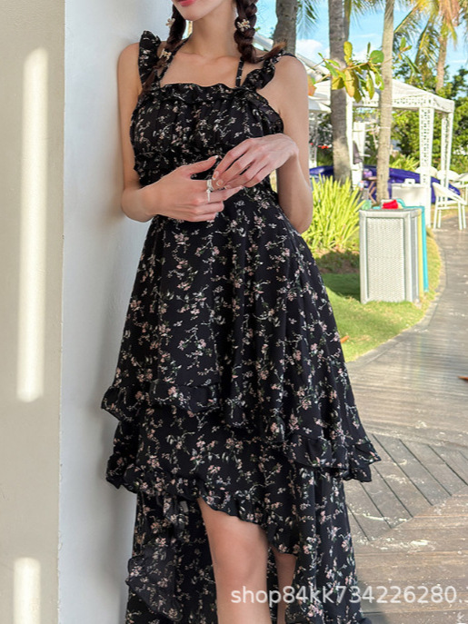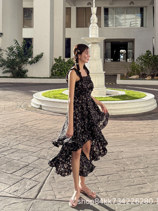 여름 프랑스 인쇄 긴 원피스 우아한 허리 주름 치마 해변 휴가 불규칙한 스트랩 한국식 원피스 여성