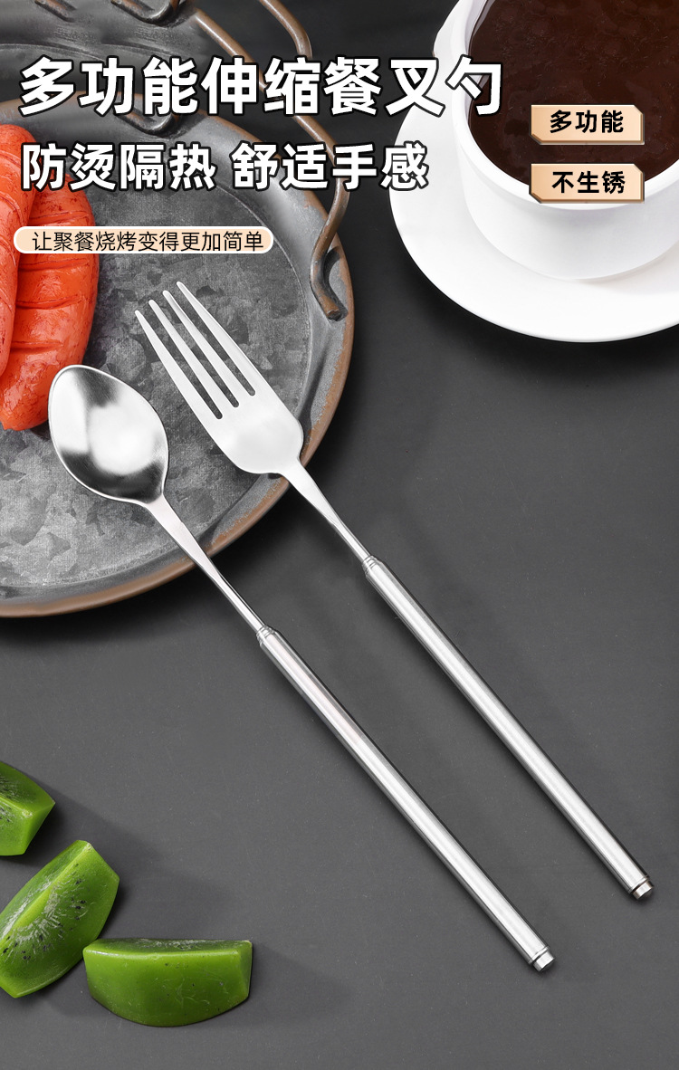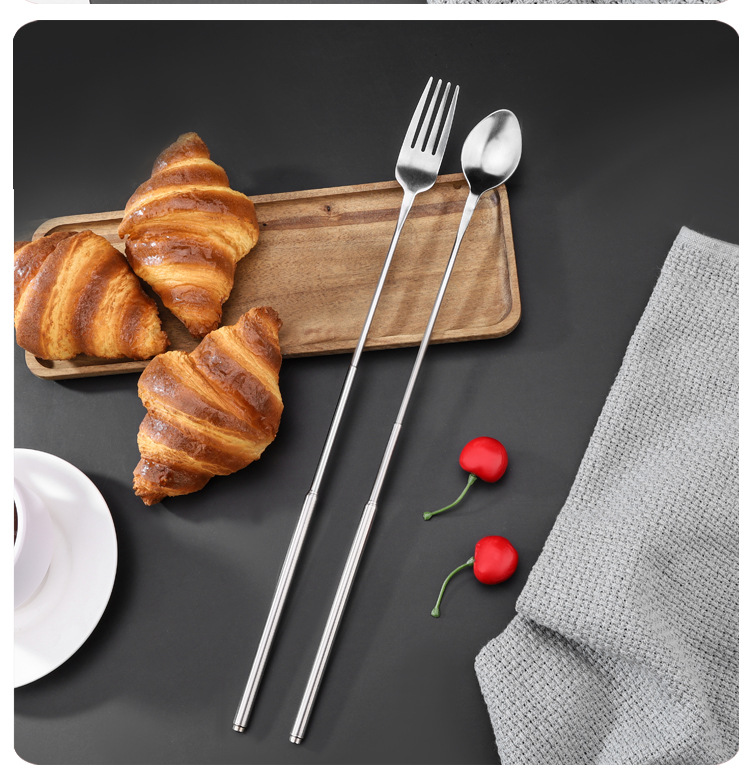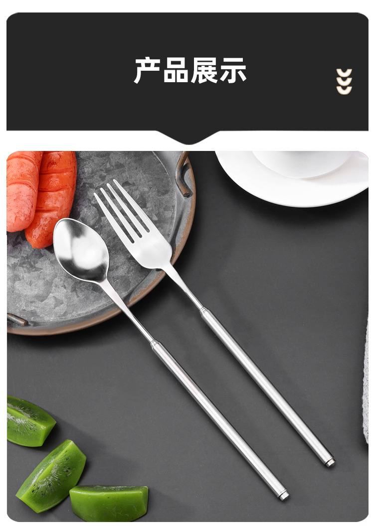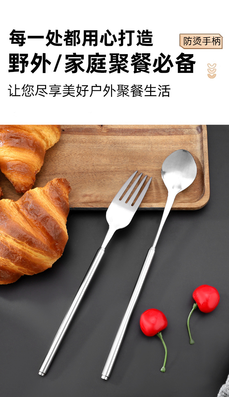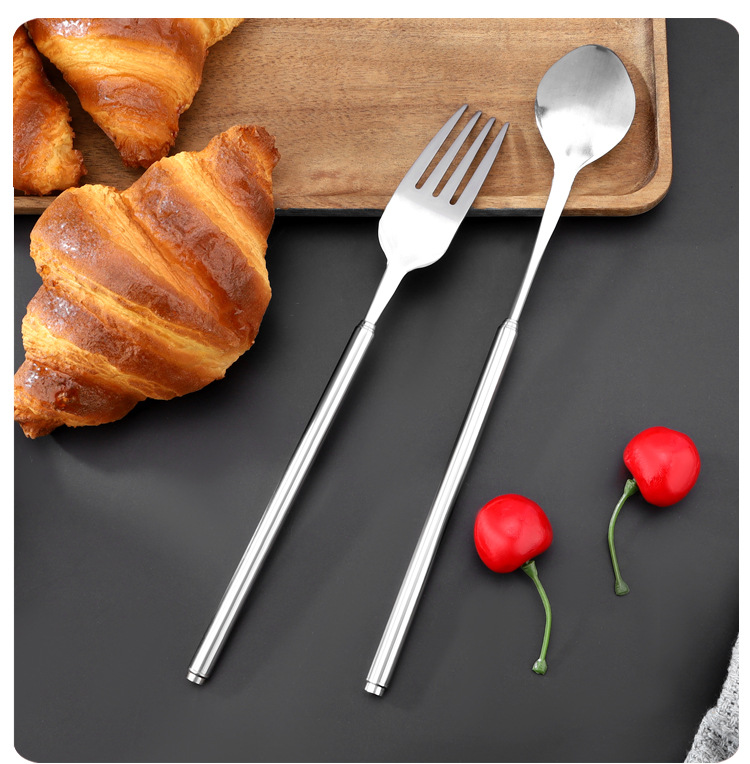 공장 현장 고품질 일체형 용접 스테인레스 스틸 텔레스코픽 서양 음식 포크와 스푼 휴대용 식기 슈퍼 롱 포크와 스푼 유물