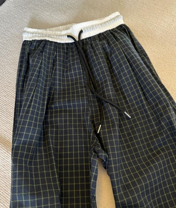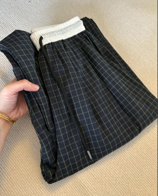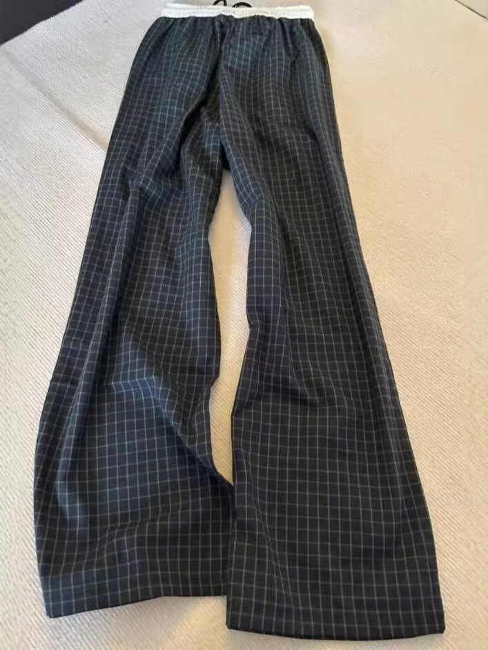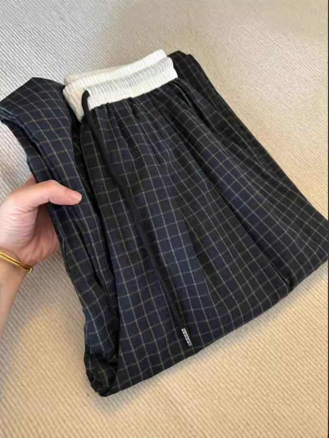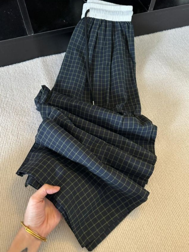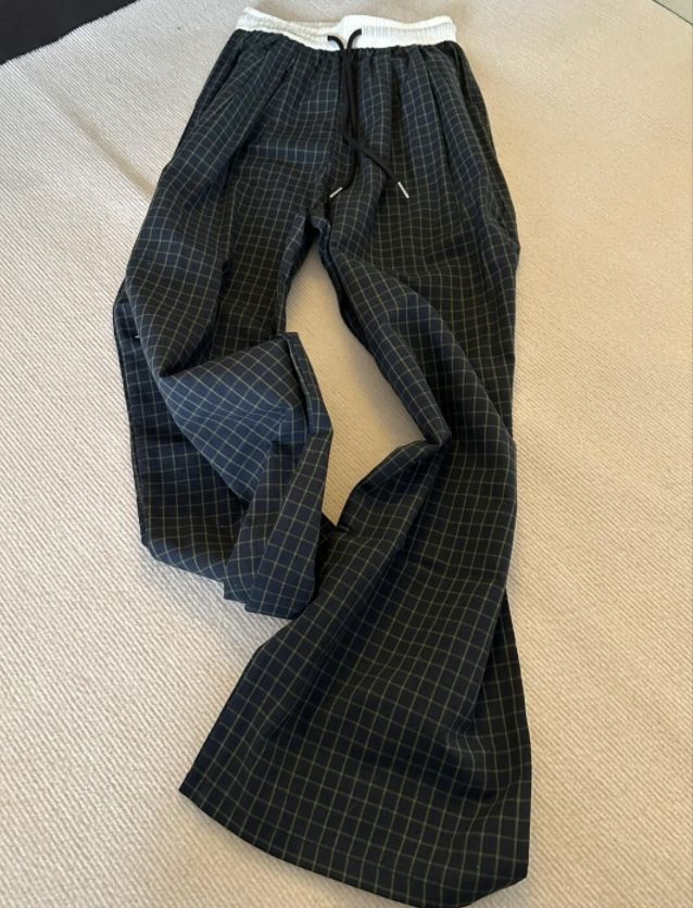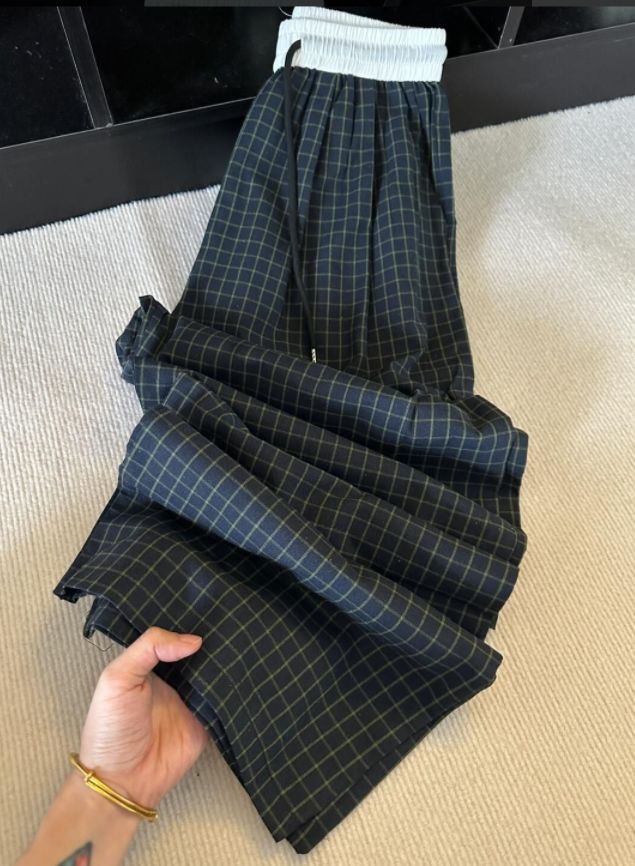 여름 한국 스타일 슬림 체크 무늬 느슨한 넓은 다리 캐주얼 바지 여성용 엘라 사이트 허리 끈 스트레이트 워킹 바지 여성용 바지