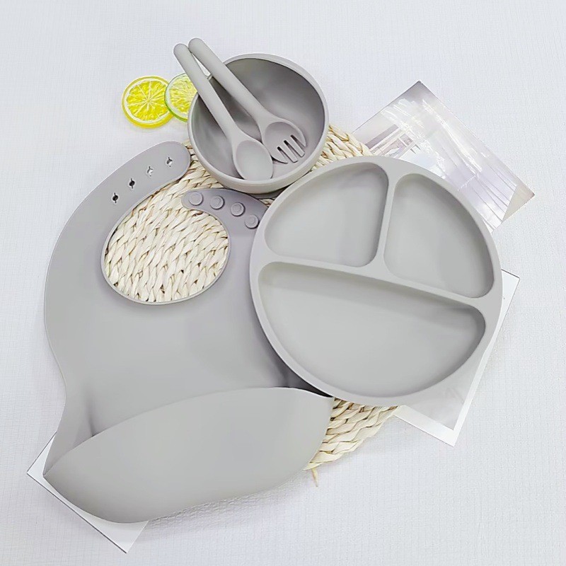 그레이 - 원형 디너 접시 + 턱받이 + 실리콘 스푼 + 실리콘 포크 + 그릇