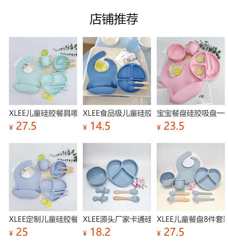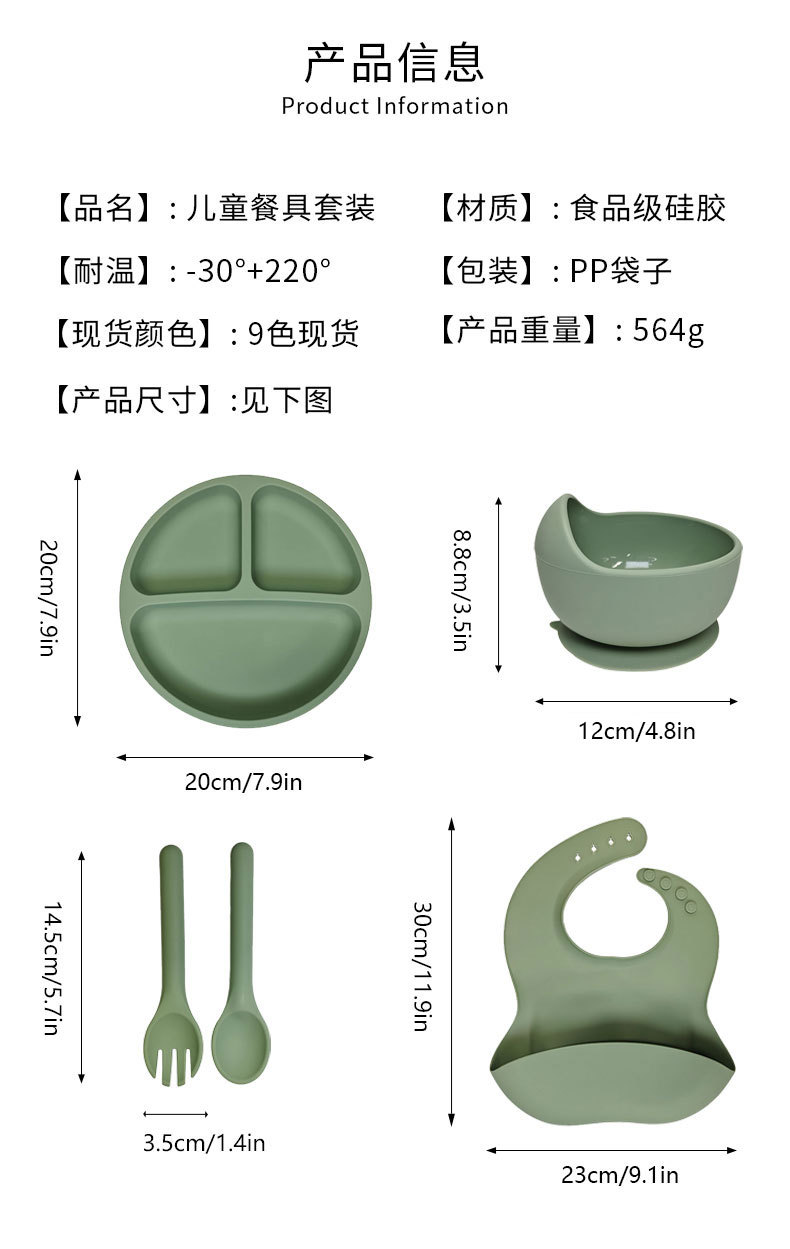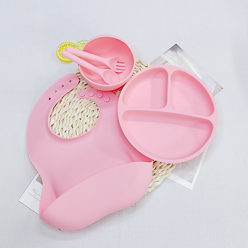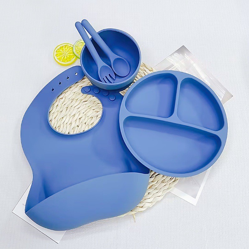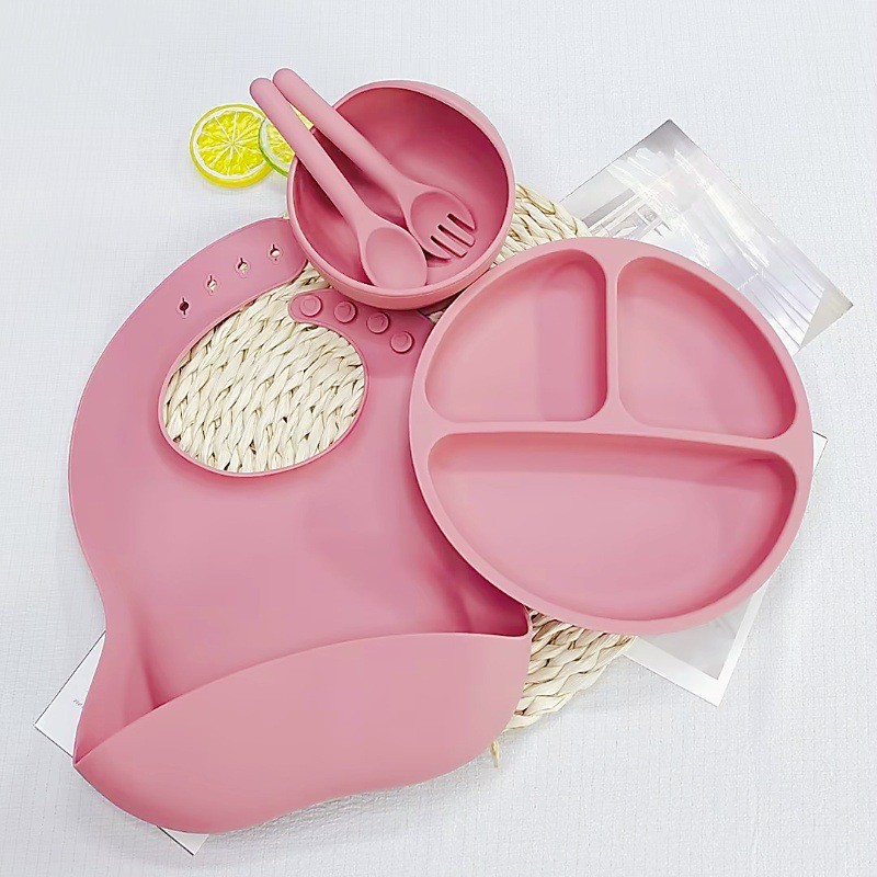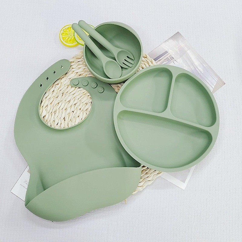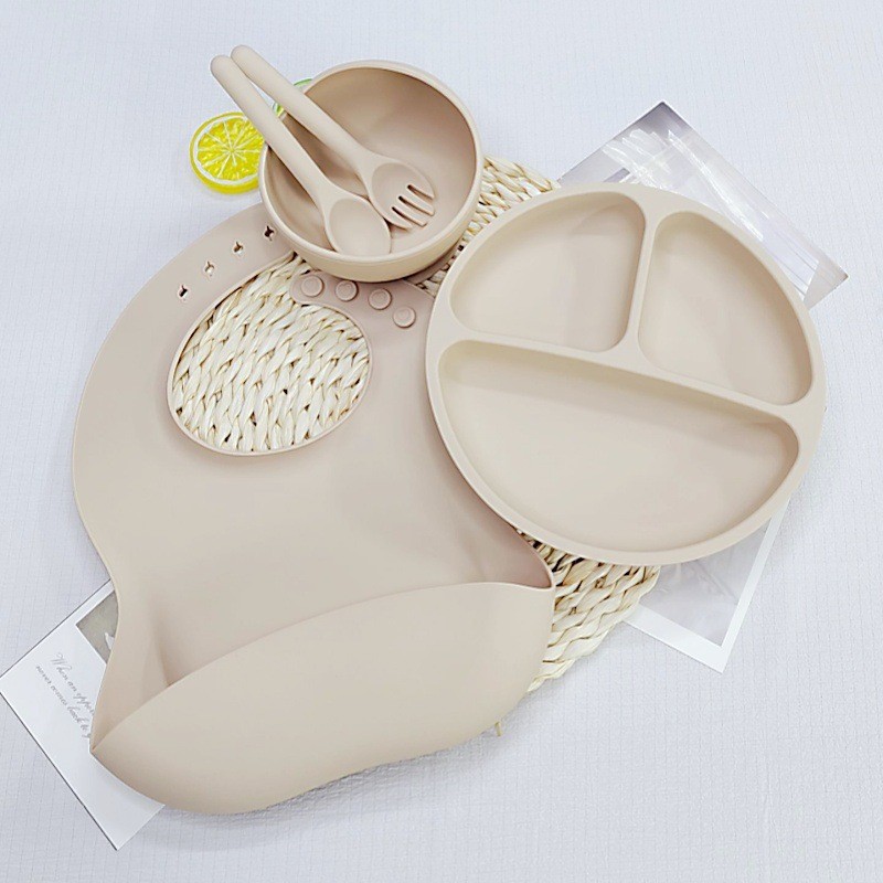 어린이 실리콘 식기 세트 이유식 보조 식기 턱받이 접시 흡입 컵 그릇 포크와 스푼 5 피스 세트 도매 제조 업체