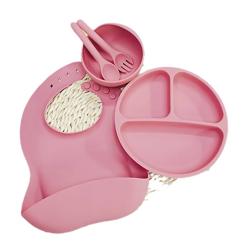 핑크 - 원형 디너 접시 + 턱받이 + 실리콘 스푼 + 실리콘 포크 + 그릇