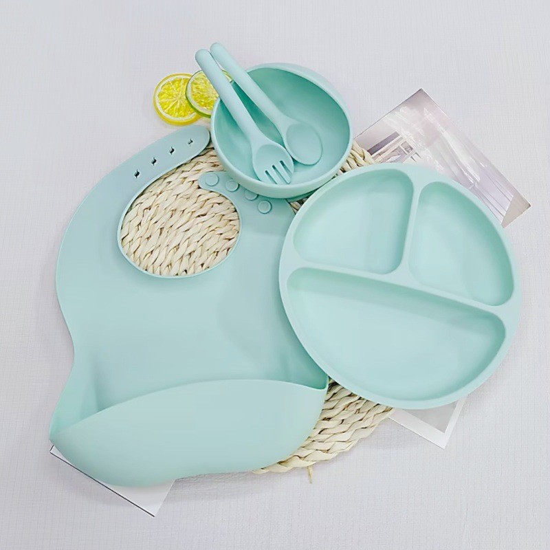 연한 녹색 원형 디너 접시 + 턱받이 + 실리콘 스푼 + 실리콘 포크 + 그릇